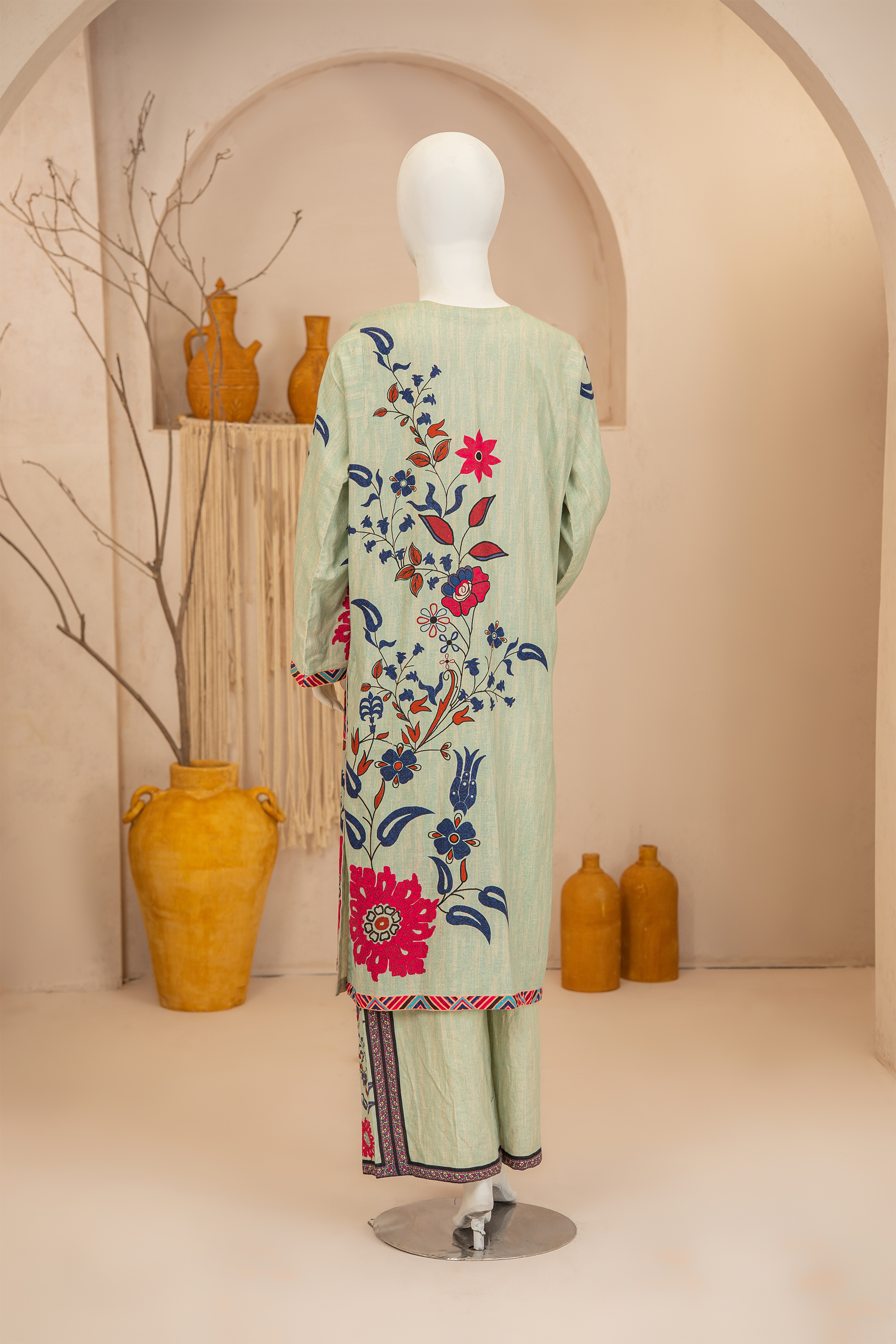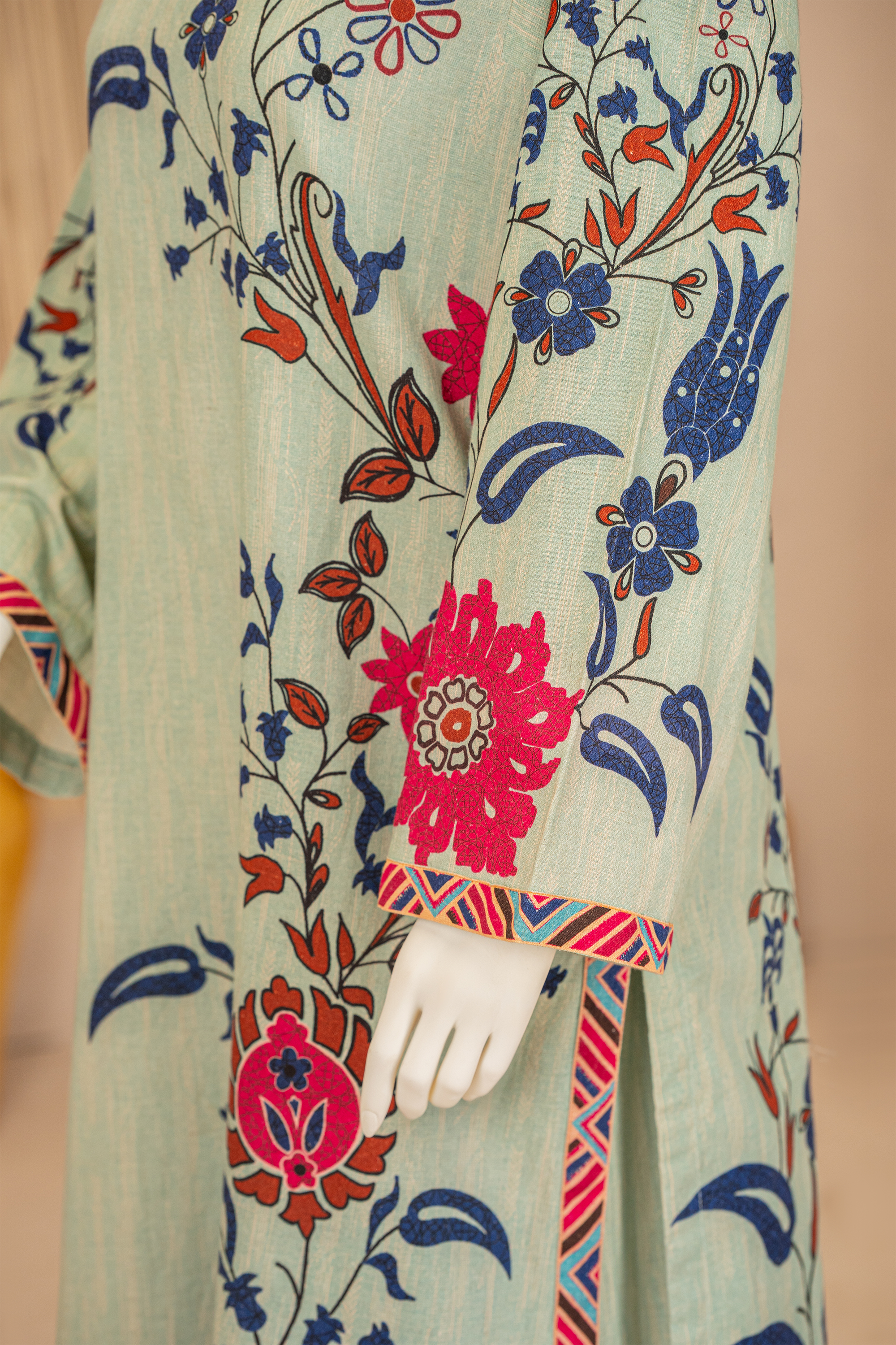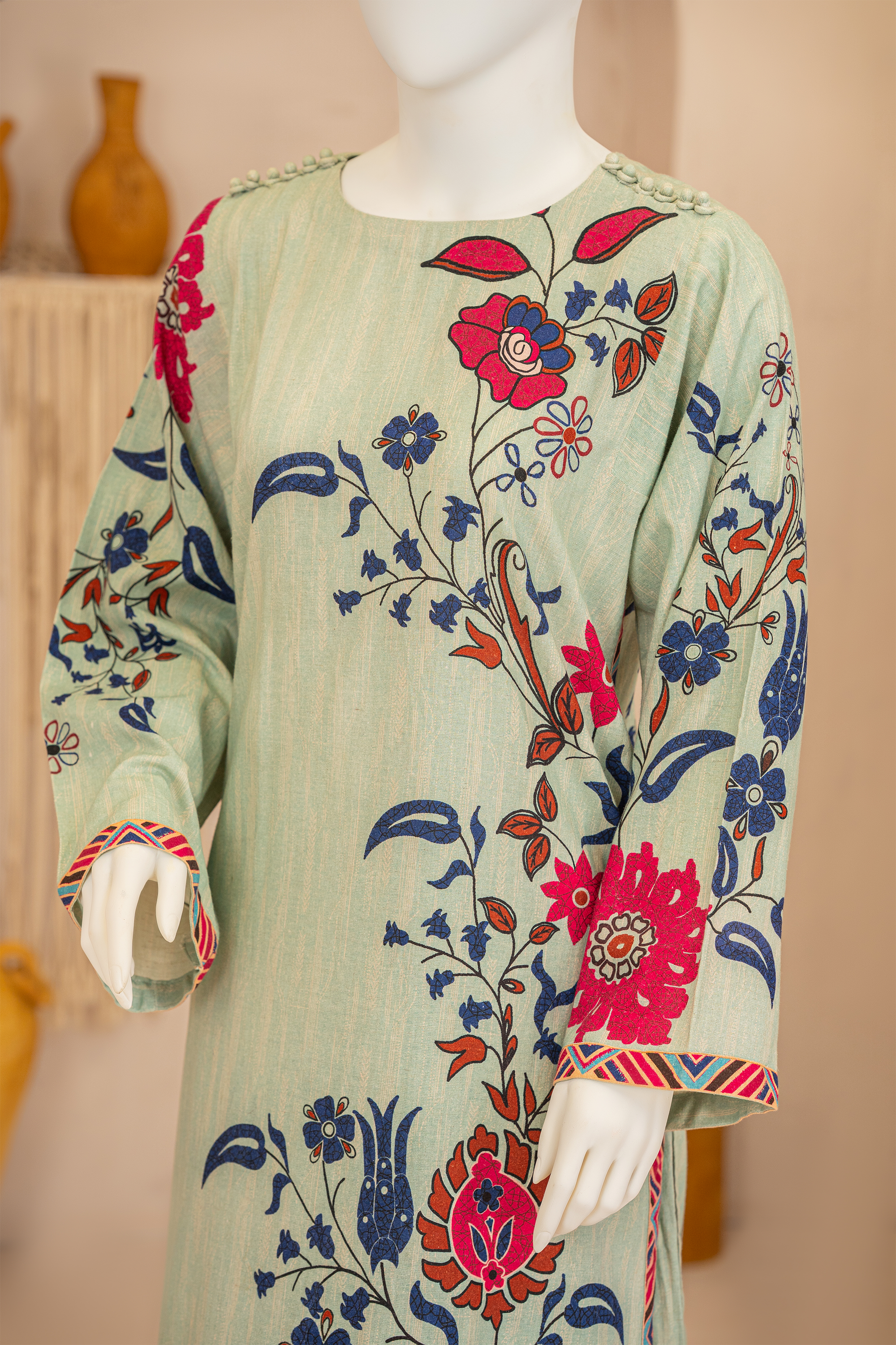 A minimalist yet captivating co-ord set featuring contemporary floral and botanical digital prints on both front and back, creating a fresh and sophisticated appeal. The long kurta is styled with a boat neckline and delicate loop detailing at the shoulders, paired with printed trousers for a cohesive, polished look.