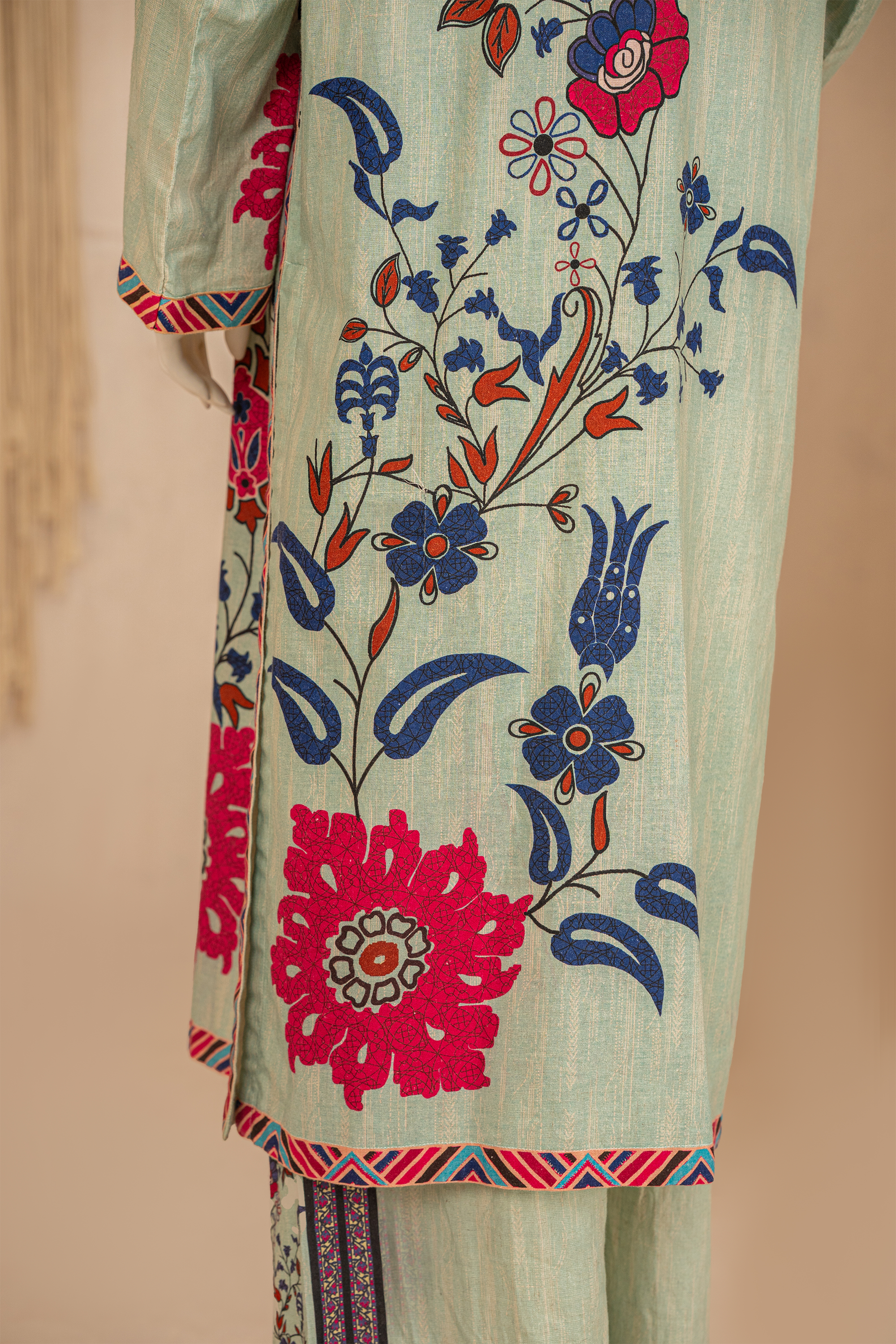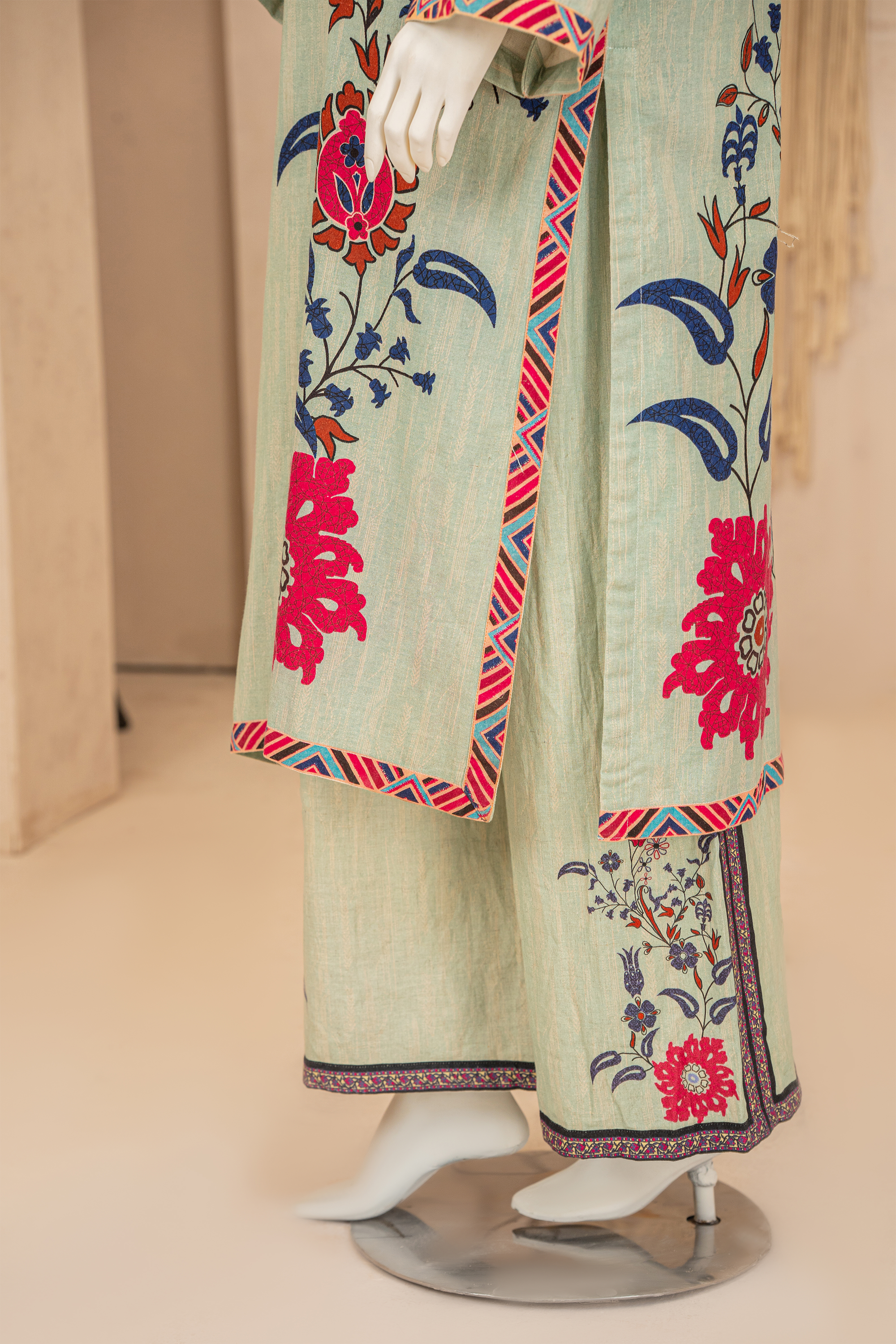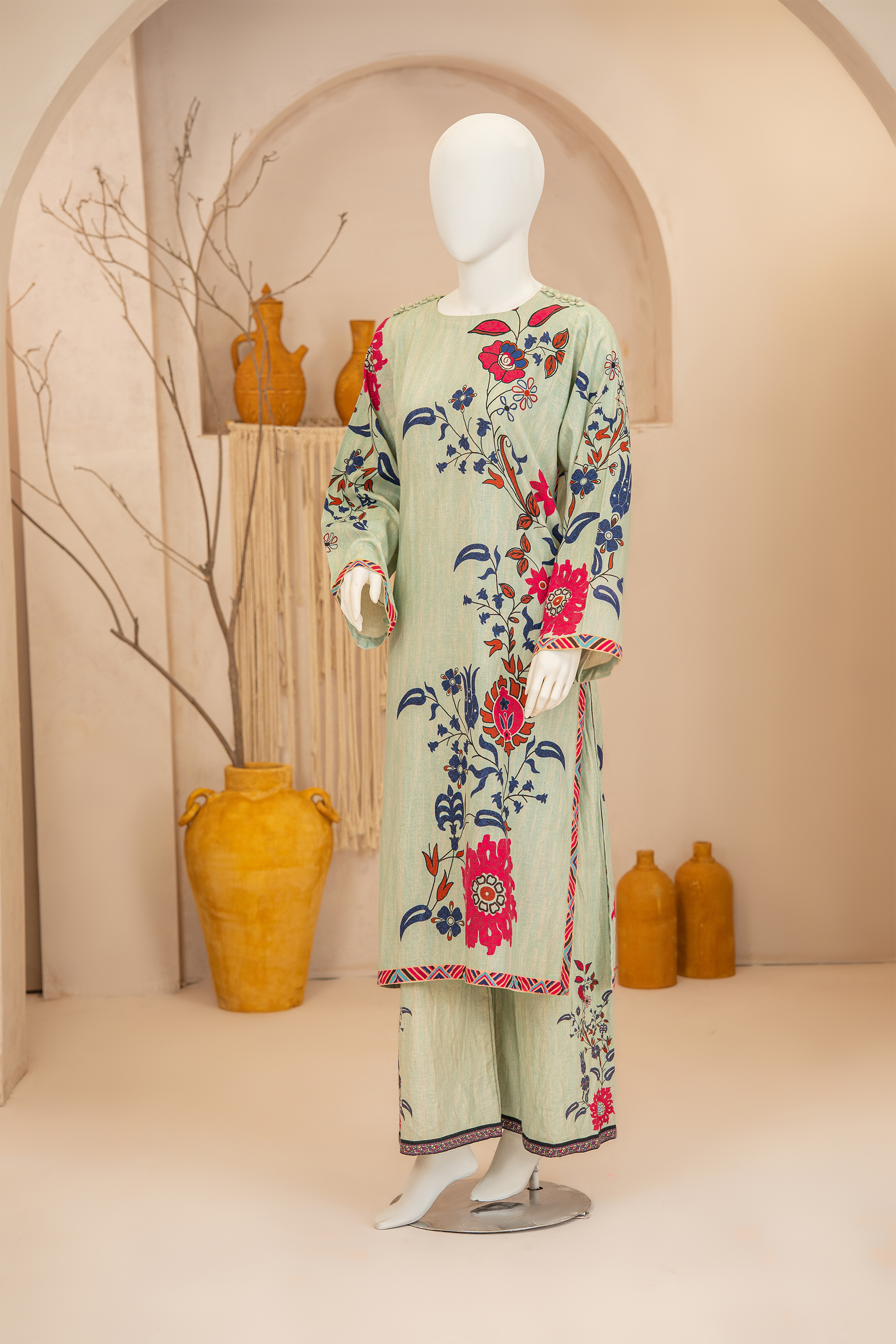 A minimalist yet captivating co-ord set featuring contemporary floral and botanical digital prints on both front and back, creating a fresh and sophisticated appeal. The long kurta is styled with a boat neckline and delicate loop detailing at the shoulders, paired with printed trousers for a cohesive, polished look.