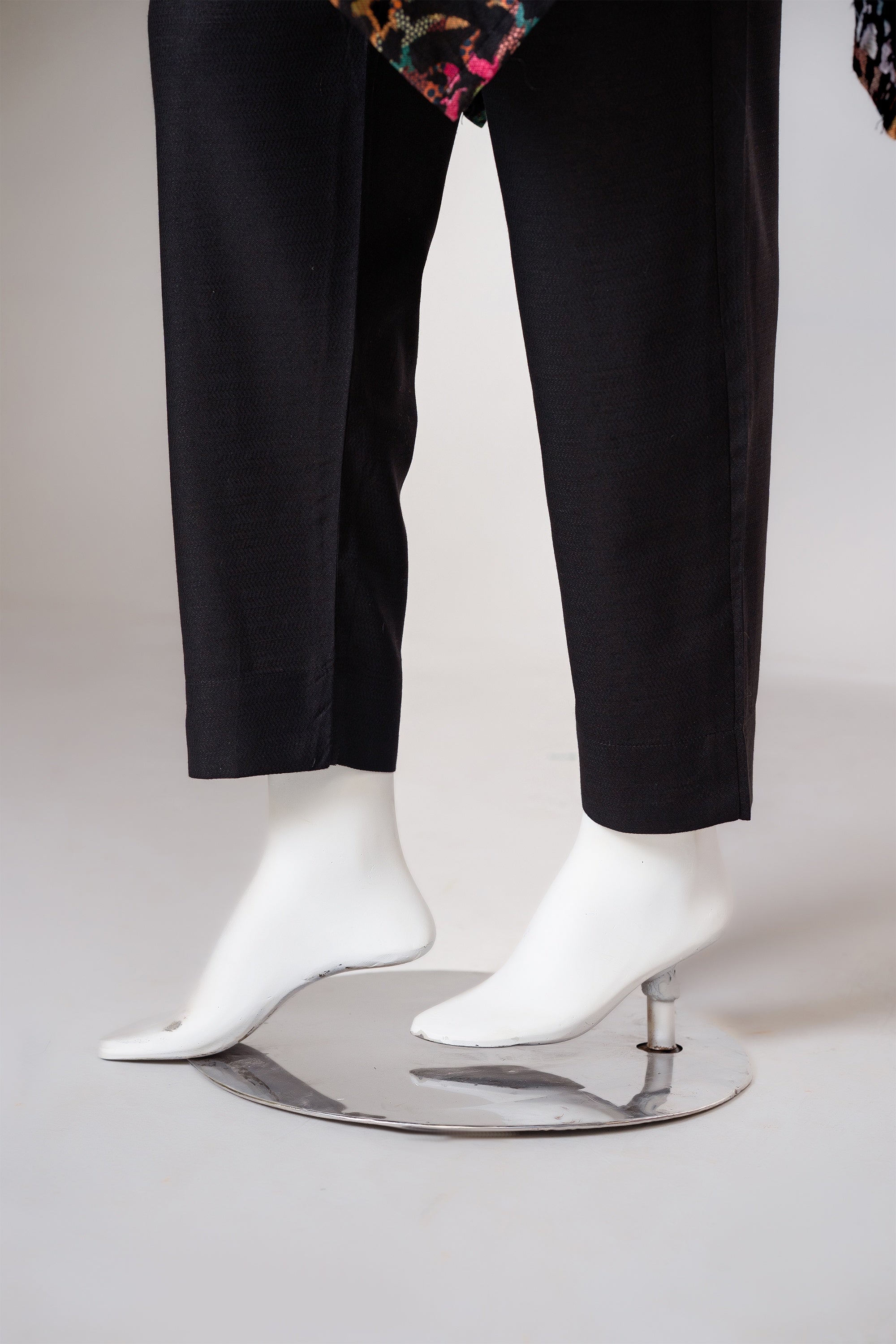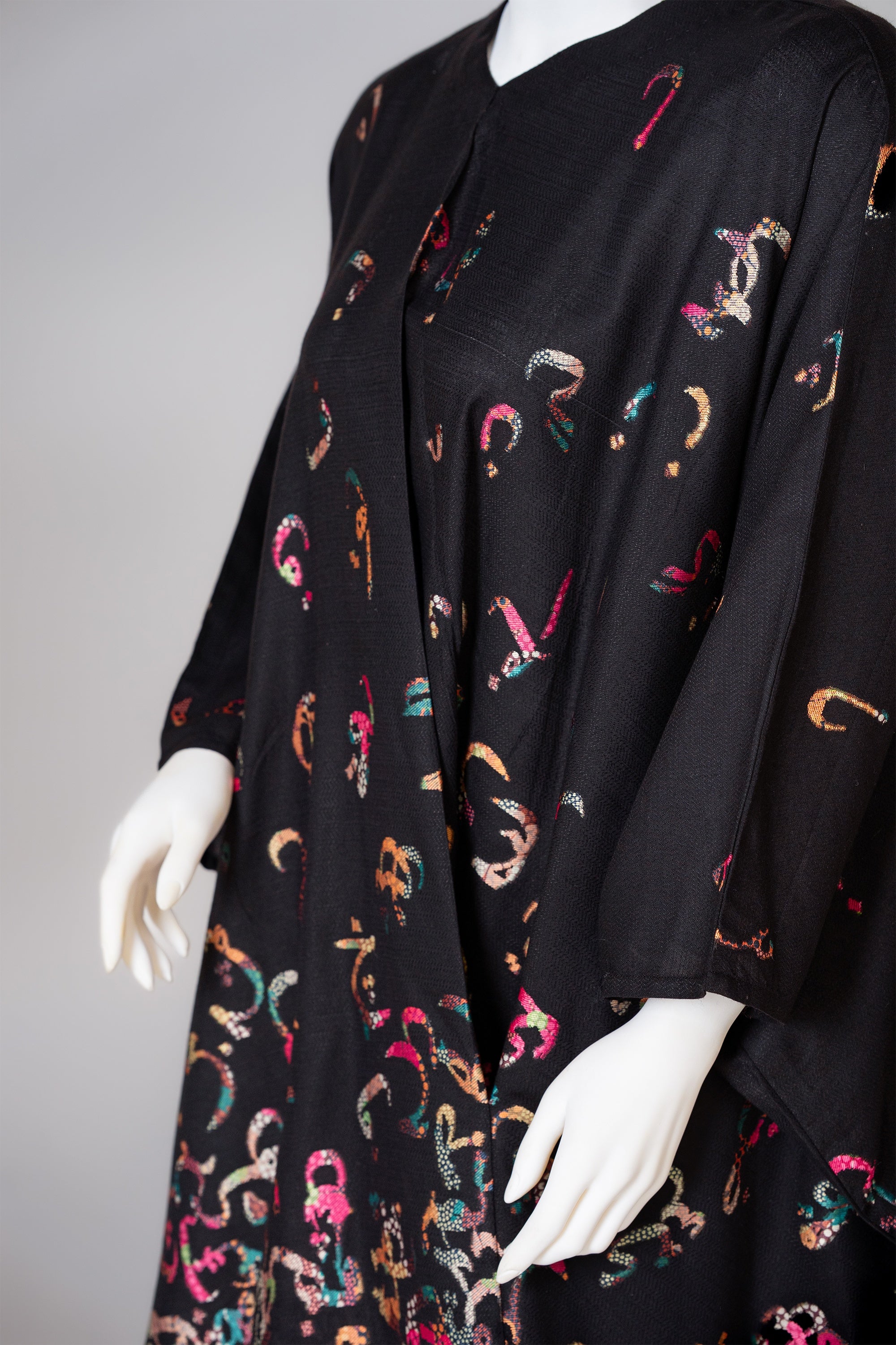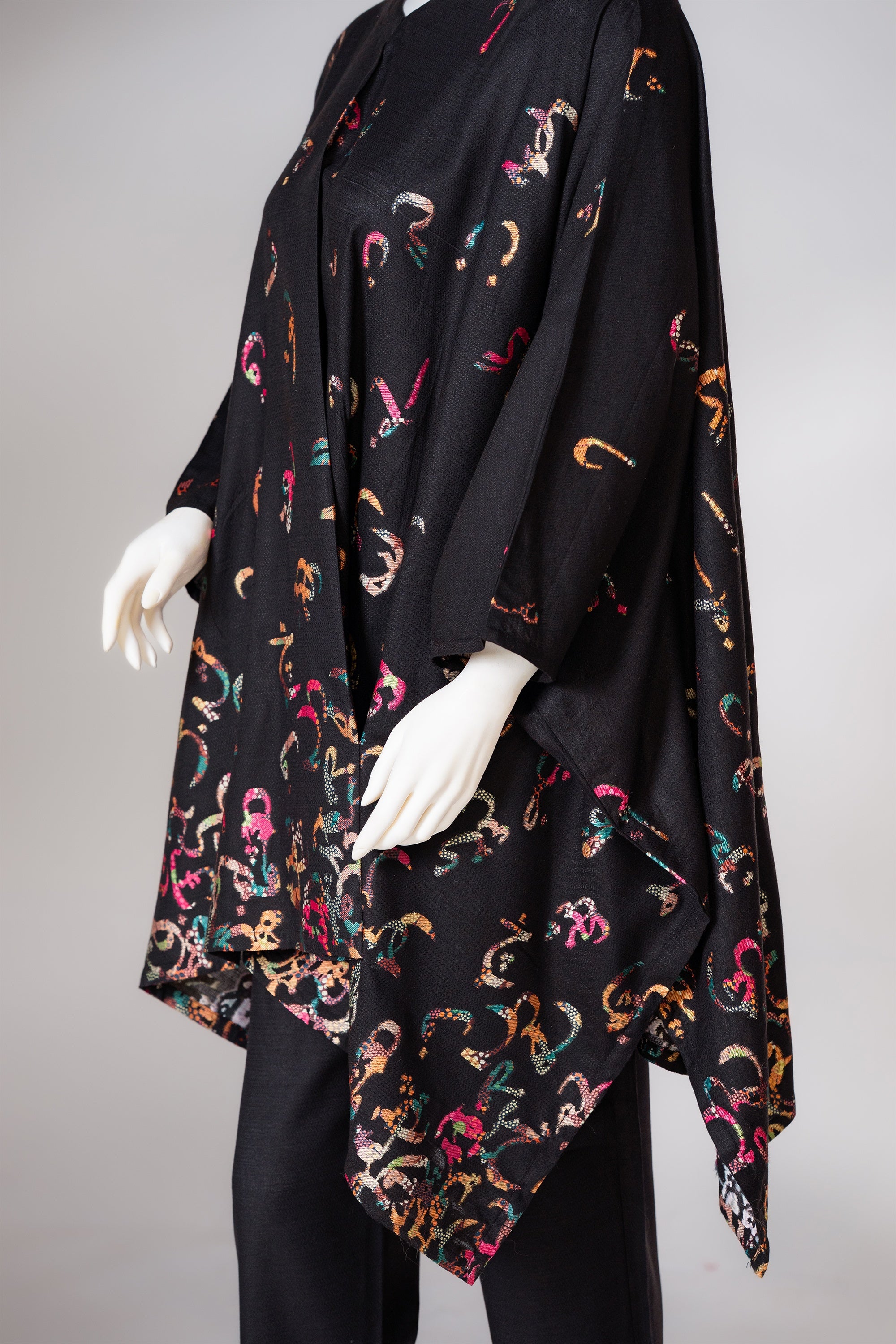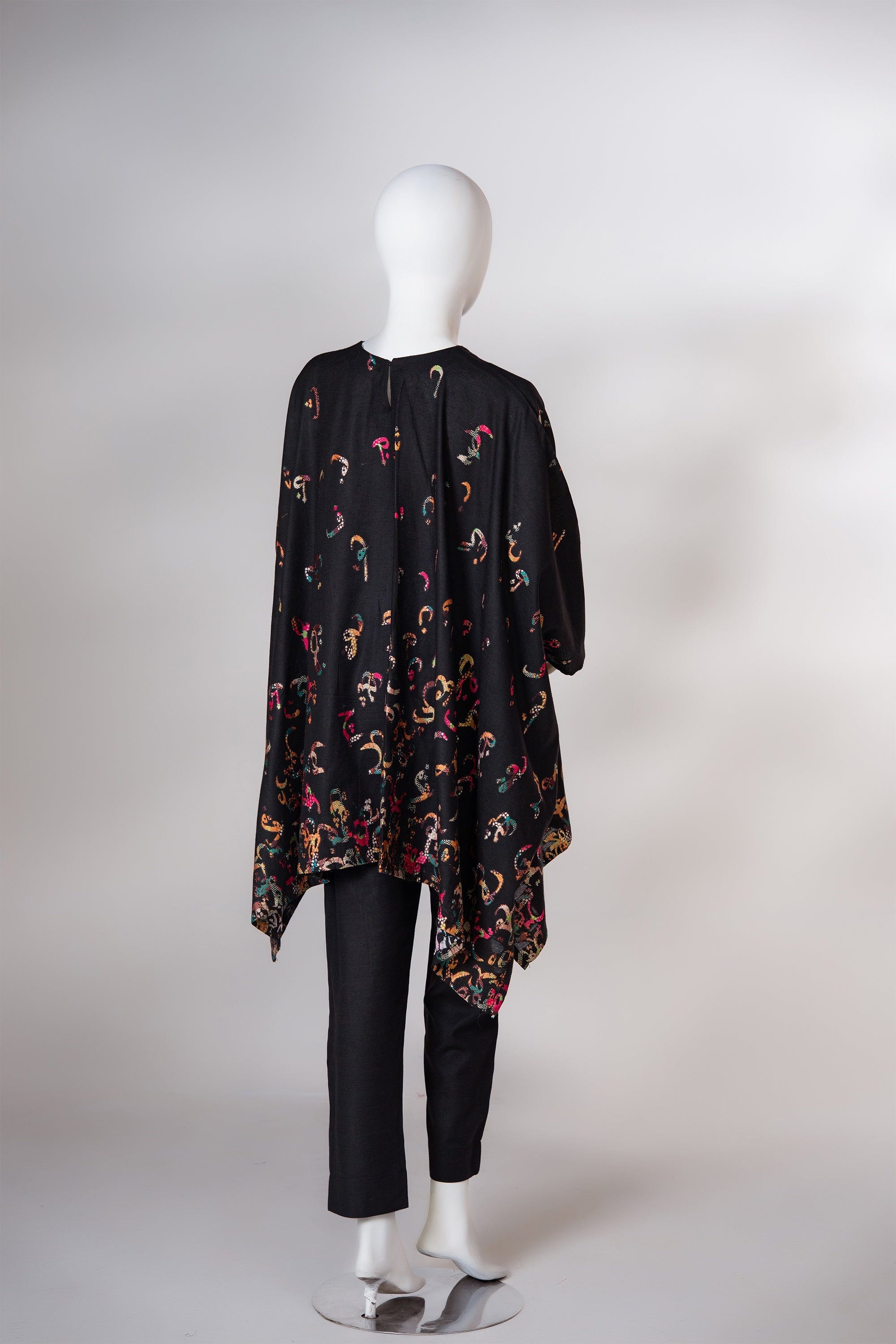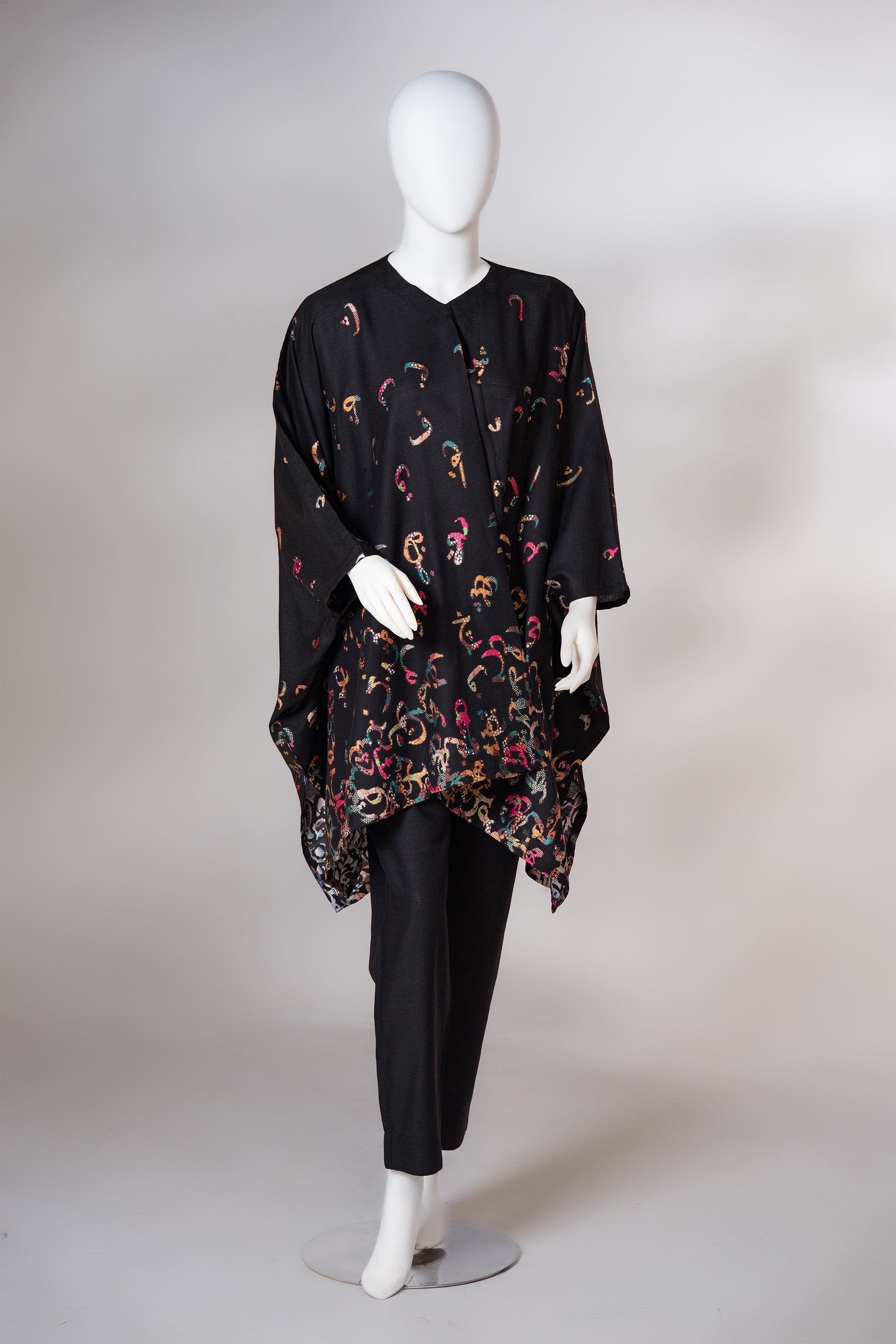 This ensemble features a unique, contemporary cut poncho that adds a modern edge to traditional elegance. The shirt showcases a calligraphic jacquard print, blending intricate textural weaves with artistic script-inspired motifs, creating a refined visual rhythm. Designed for effortless sophistication, it is paired with sleek straight pants, offering a balanced silhouette that highlights both structure and fluidity.