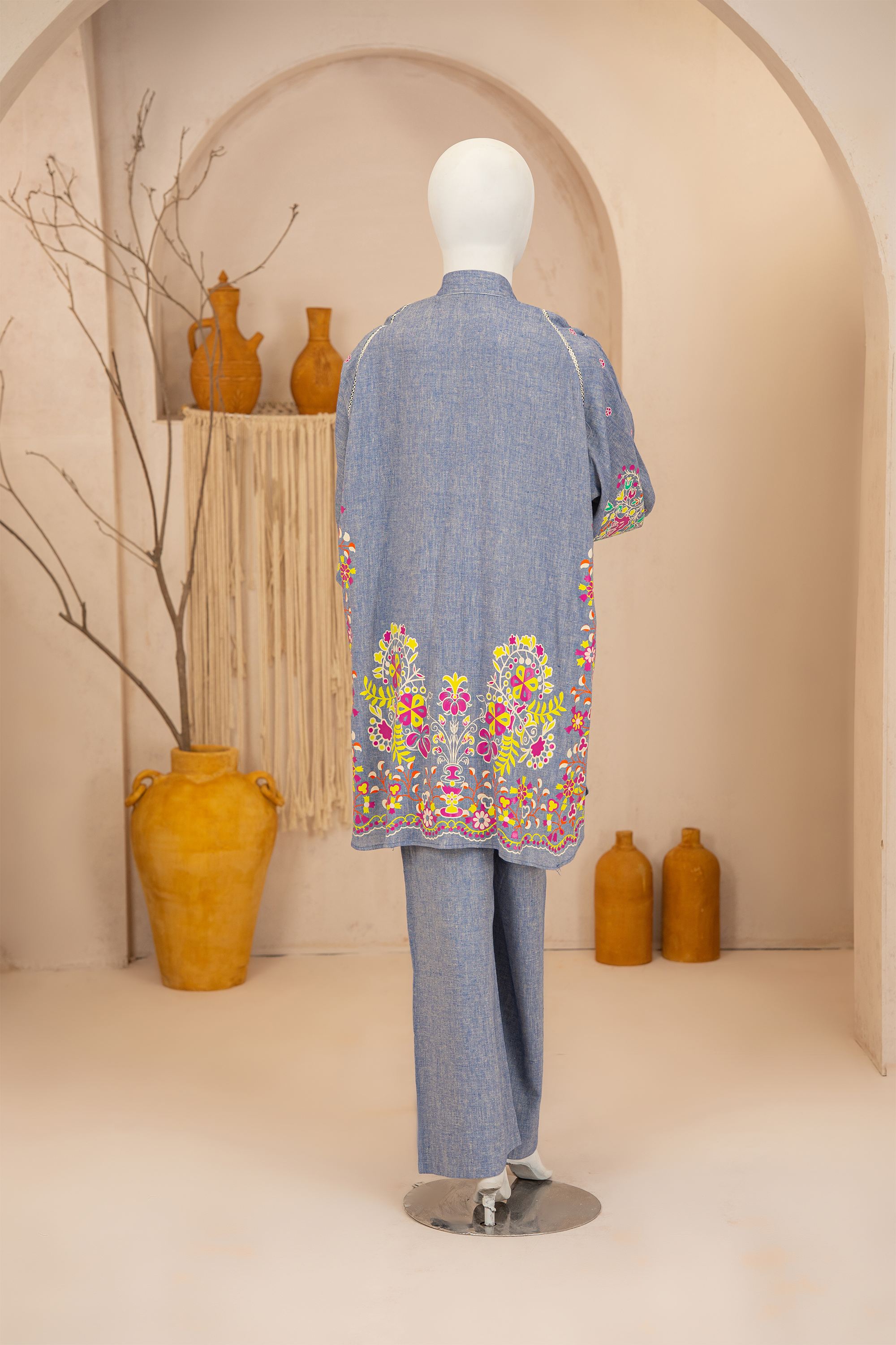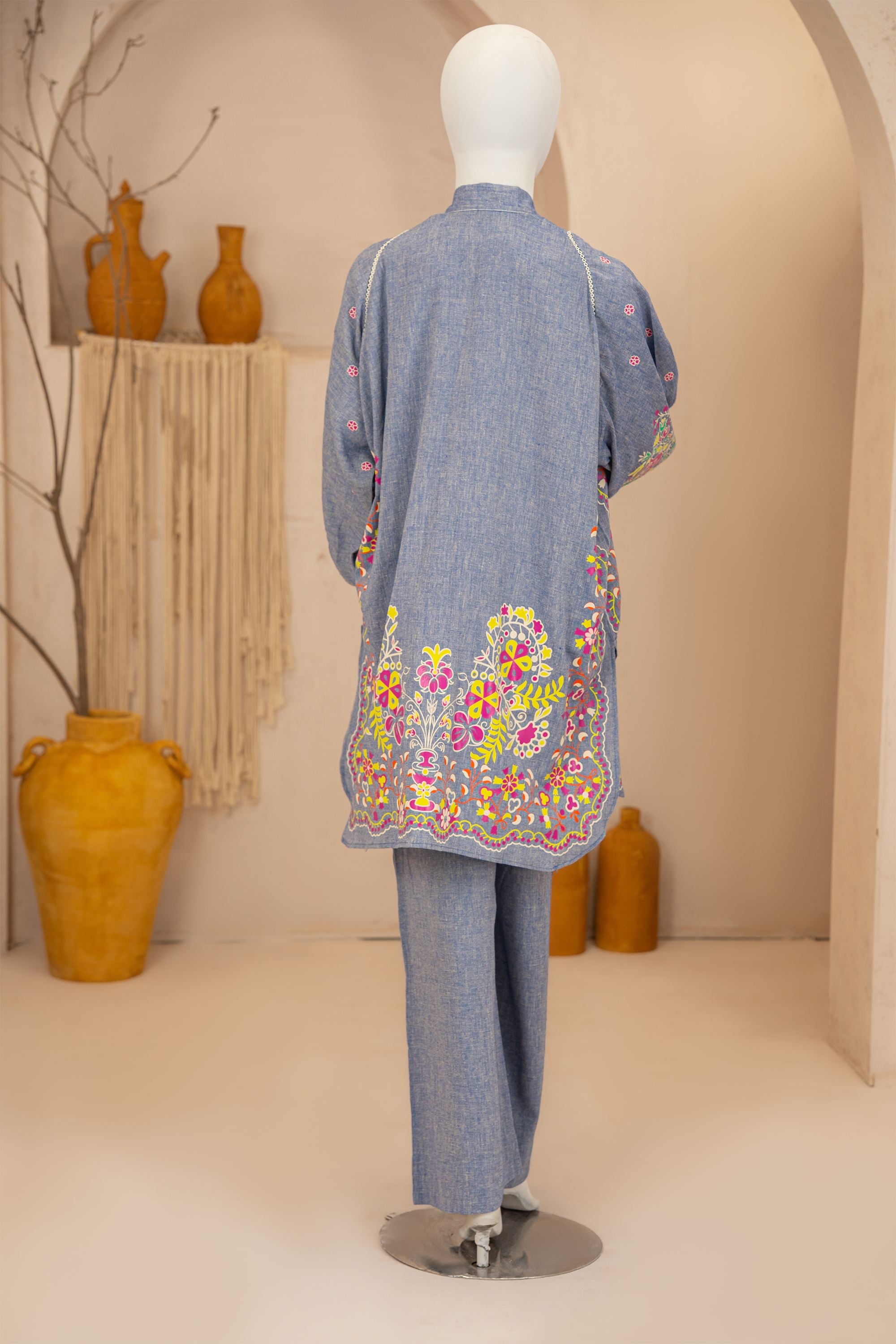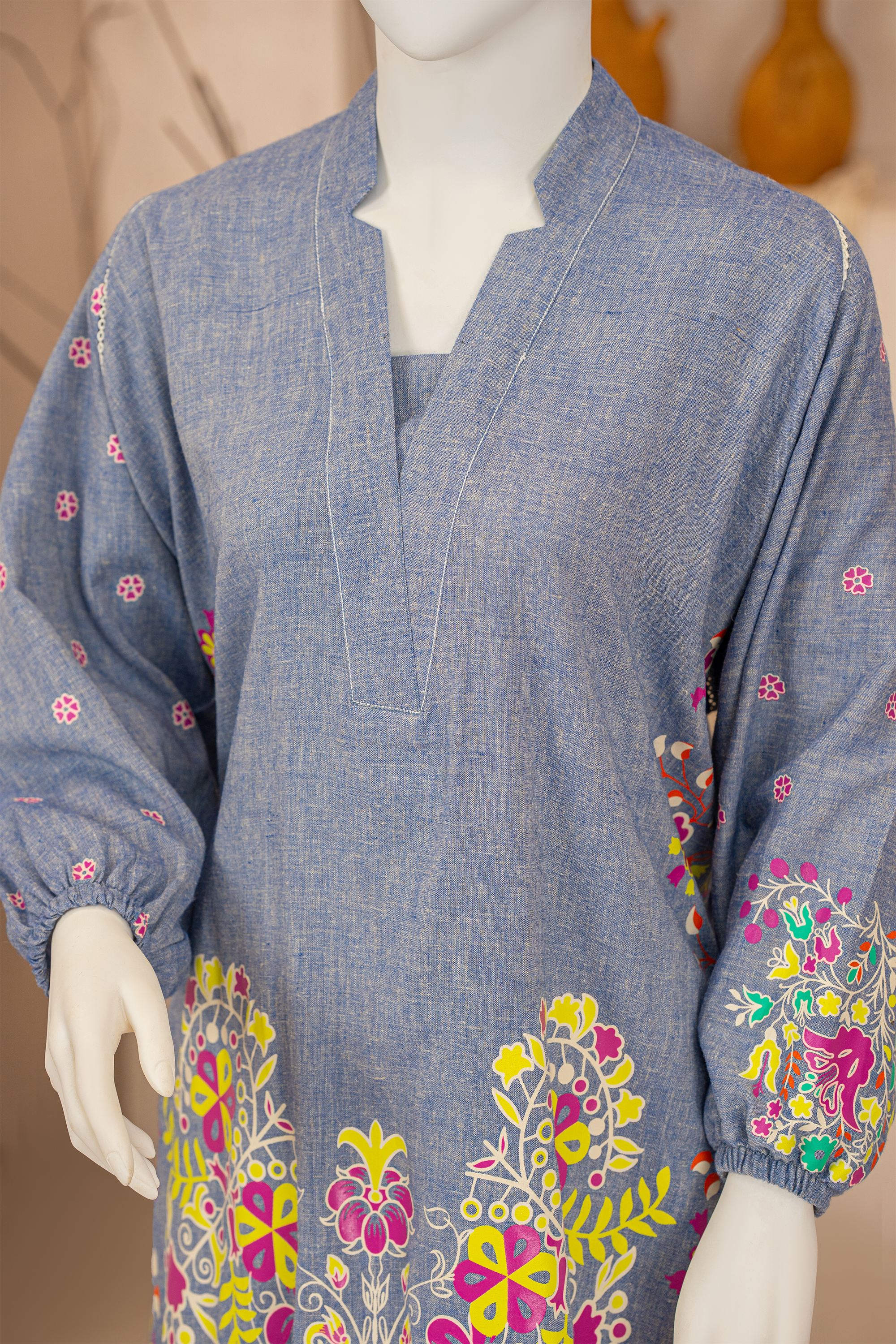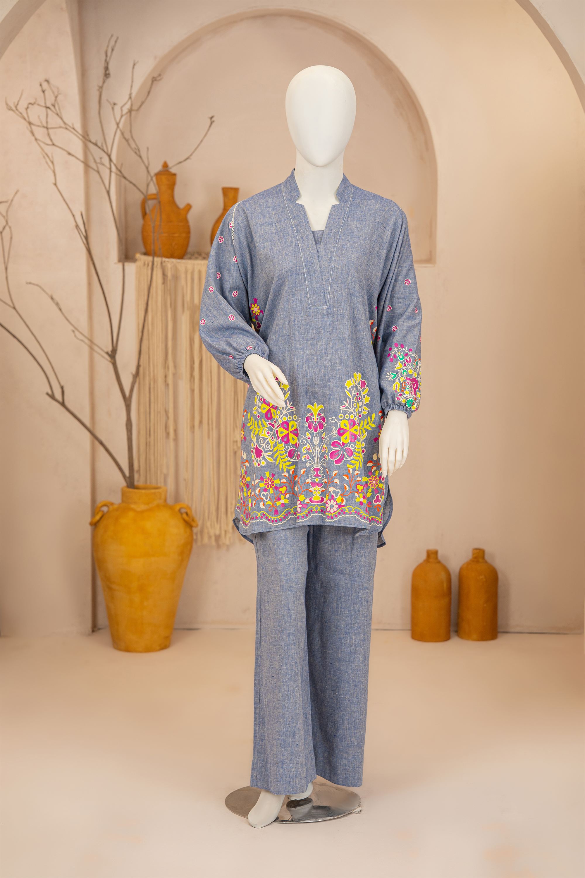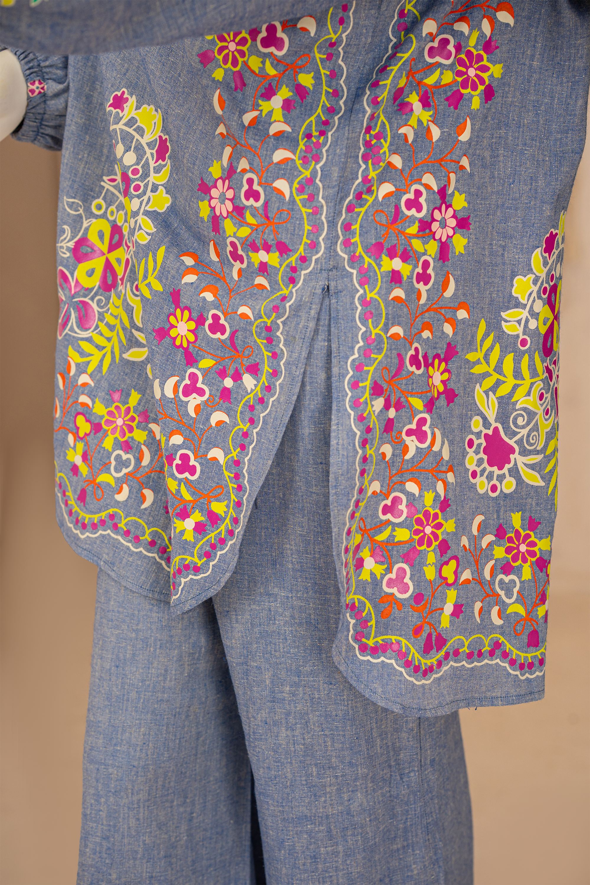 Embrace effortless elegance with this timeless linen co-ord set, adorned with intricate floral screen prints along the daman for a refined touch. The classic kurta features a smart collar neckline, blending sophistication with modern simplicity. Paired with wide-leg trousers, this ensemble exudes a chic, graceful charm perfect for a polished daytime look or understated evening elegance.
