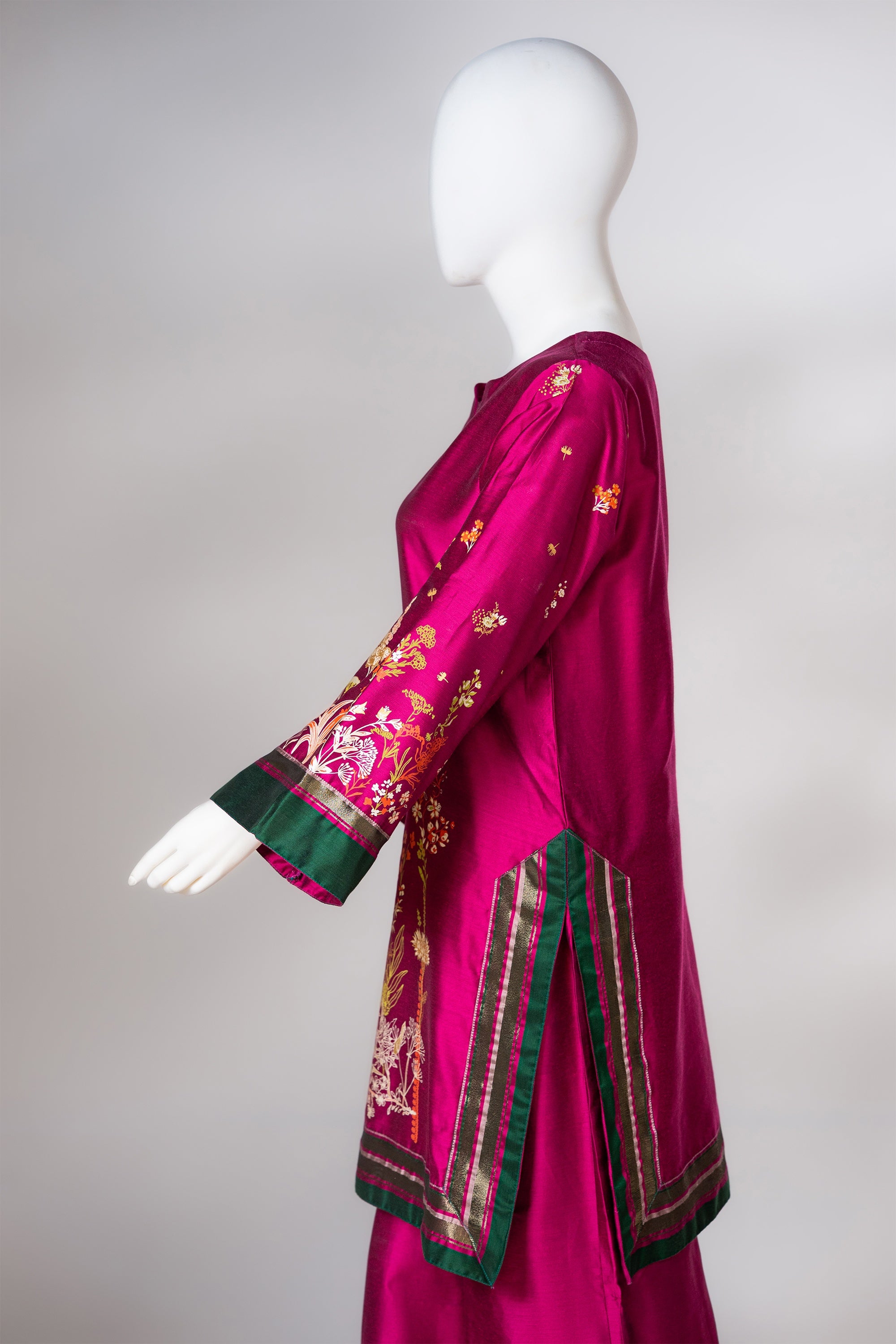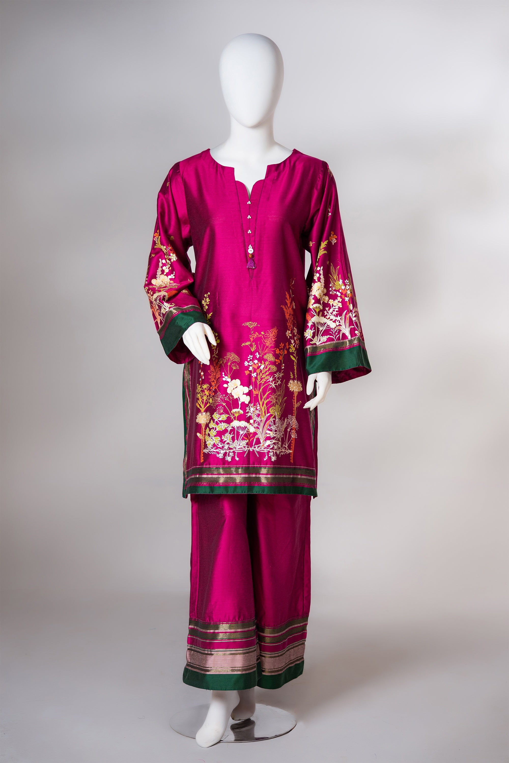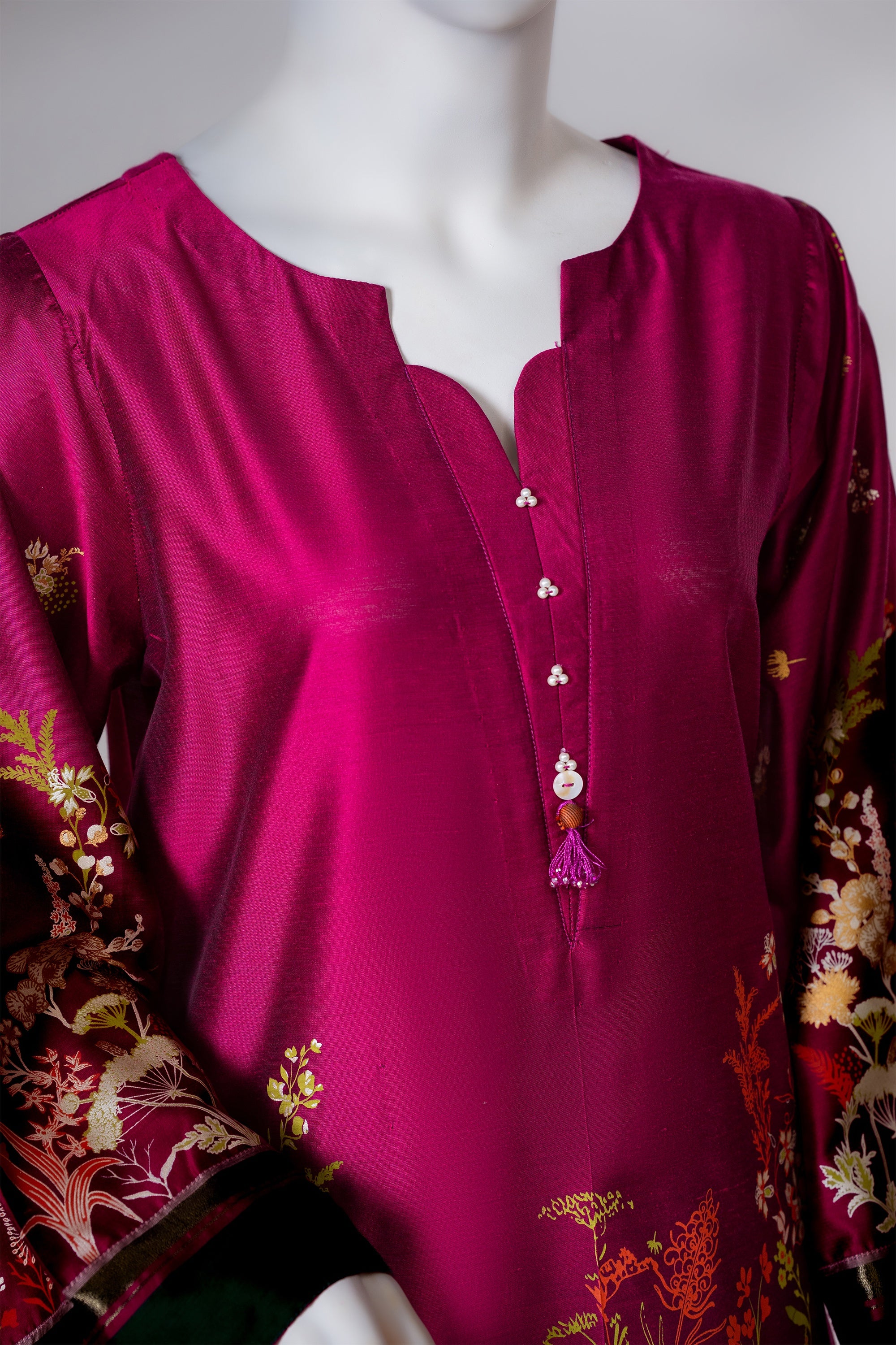 This bright fuchsia pink ensemble, where modern artistry meets timeless grace. A lush garden of contemporary screen-printed florals and botanical motifs blossoms across the front and sleeves, creating a refreshing yet sophisticated appeal. The shirt features a beautifully detailed neckline adorned with delicate pearls, adding a touch of refined charm. Paired with matching loose bottom.