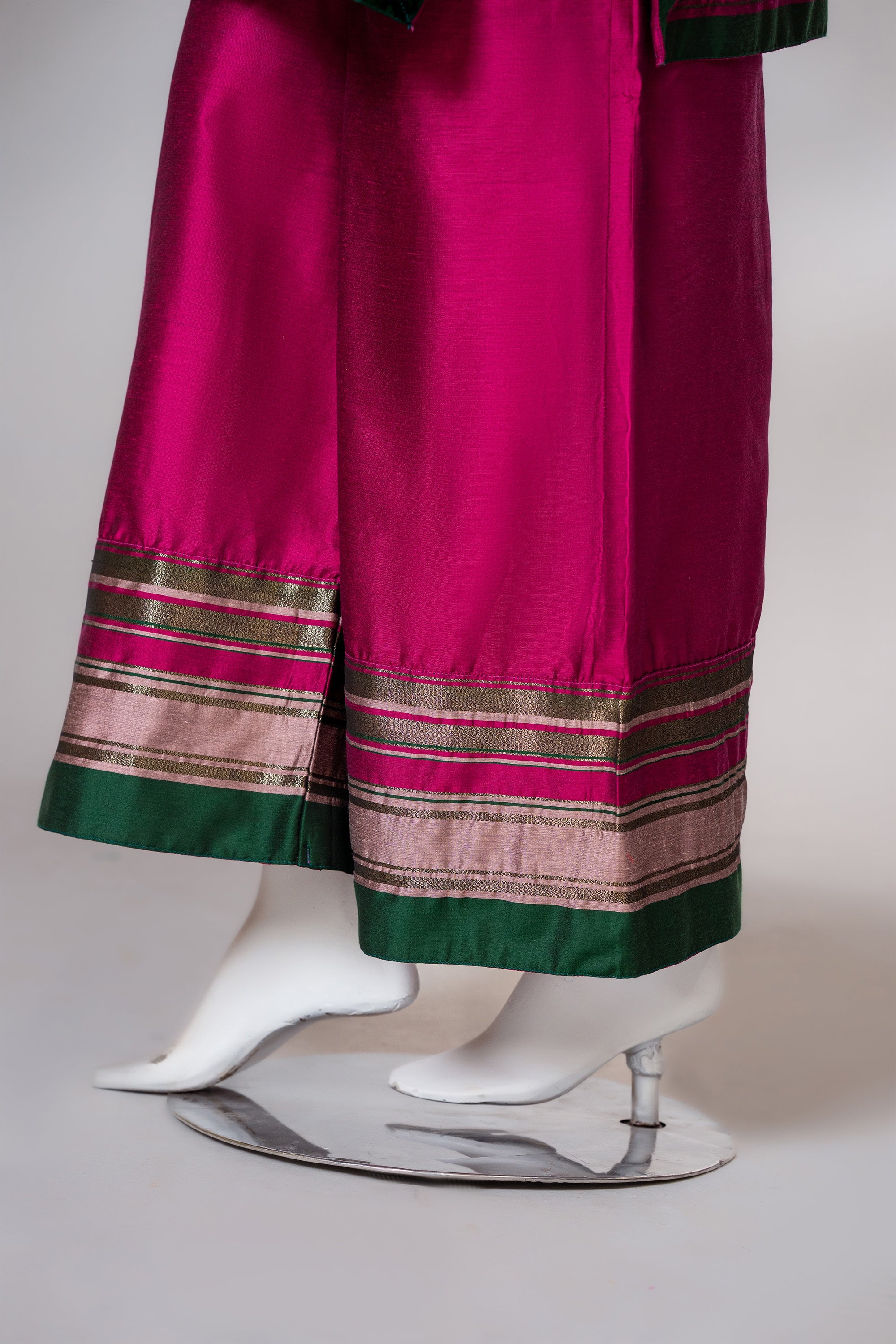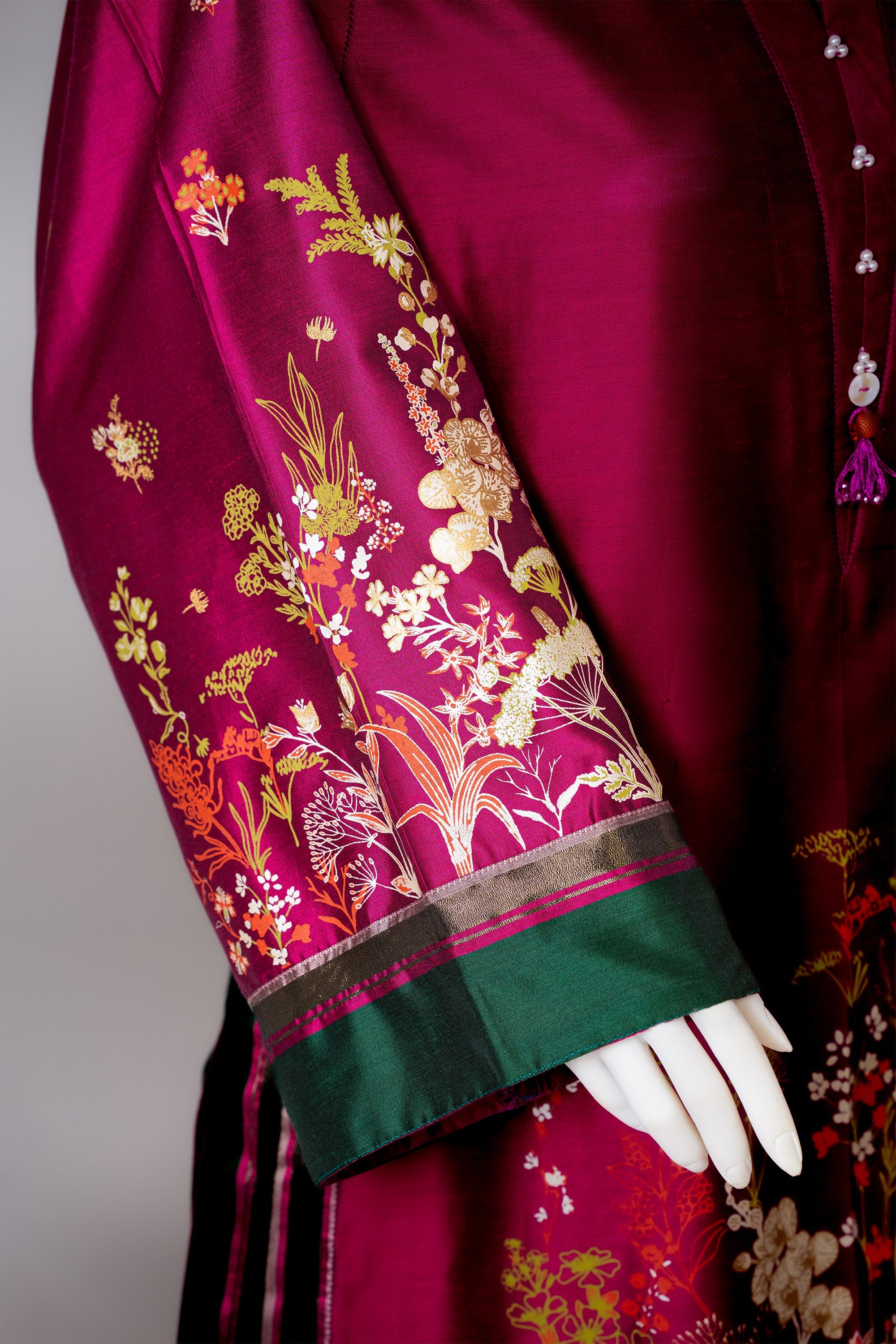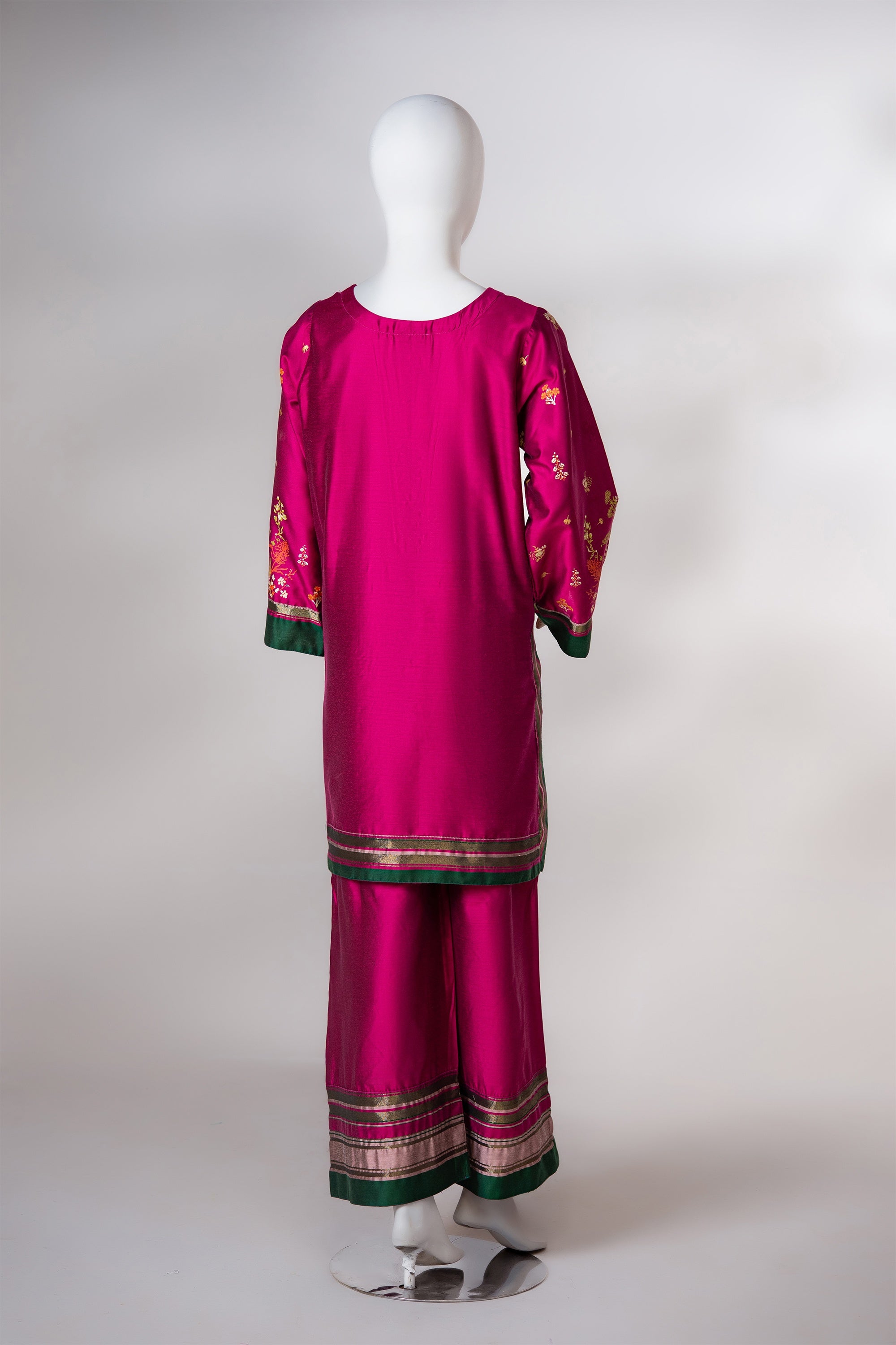 This bright fuchsia pink ensemble, where modern artistry meets timeless grace. A lush garden of contemporary screen-printed florals and botanical motifs blossoms across the front and sleeves, creating a refreshing yet sophisticated appeal. The shirt features a beautifully detailed neckline adorned with delicate pearls, adding a touch of refined charm. Paired with matching loose bottom.