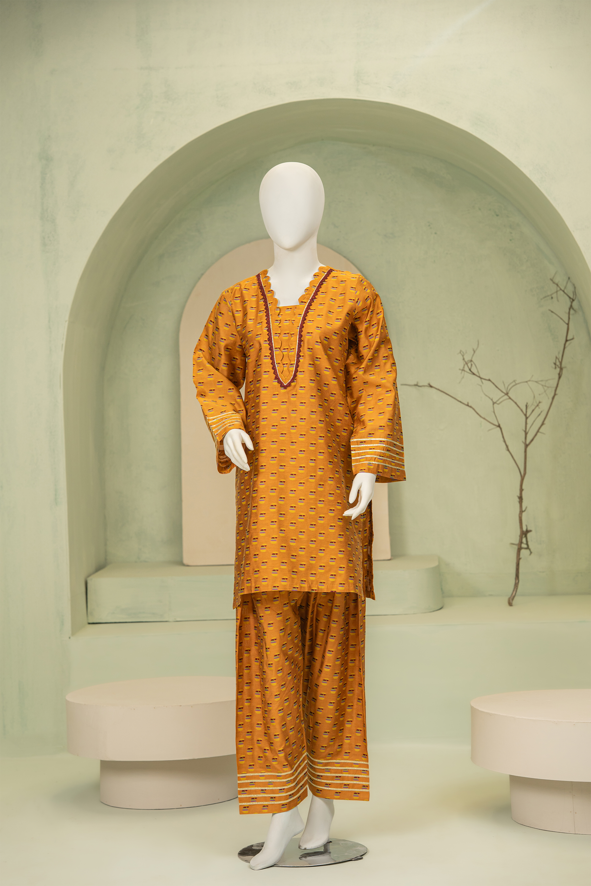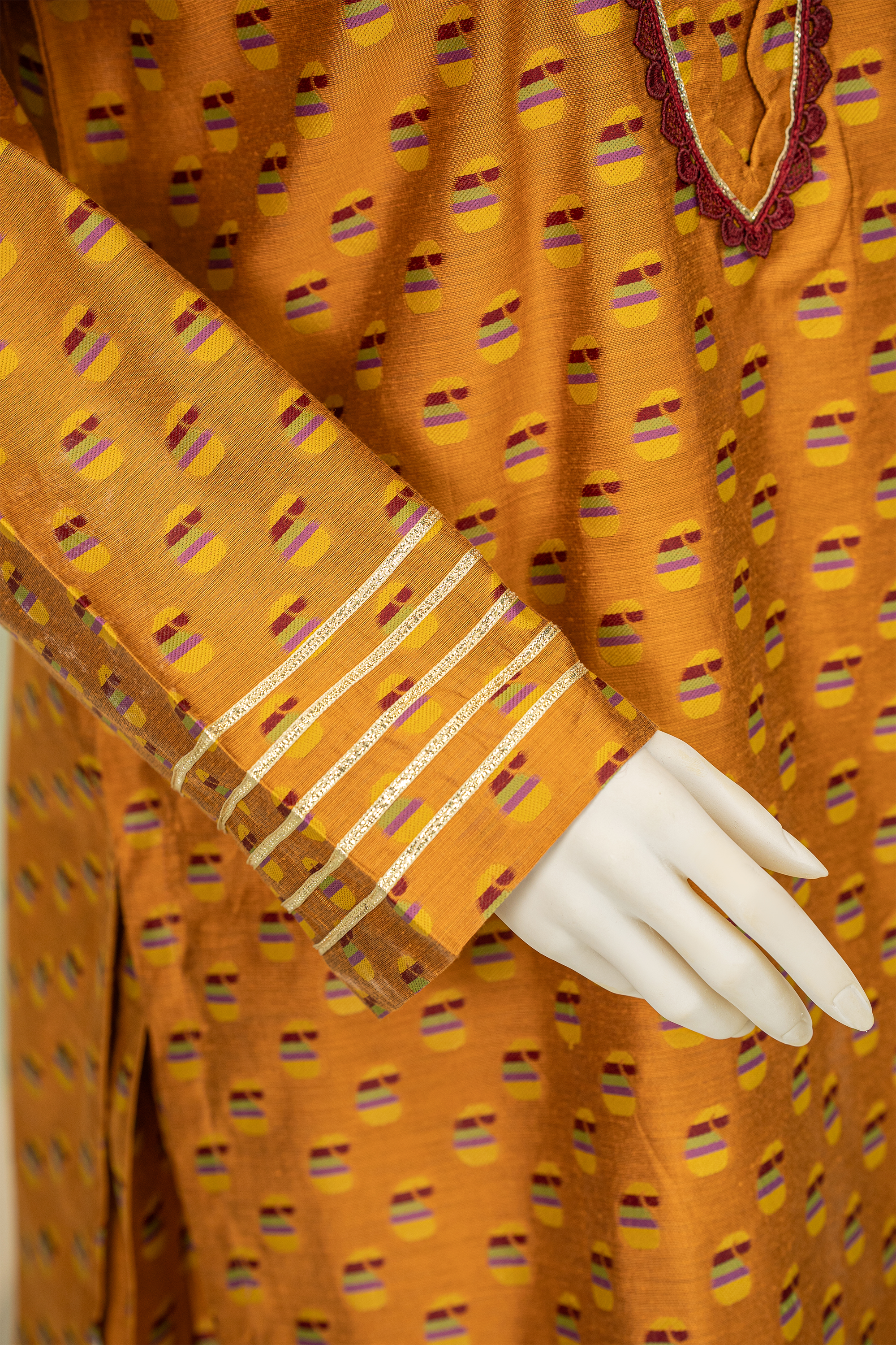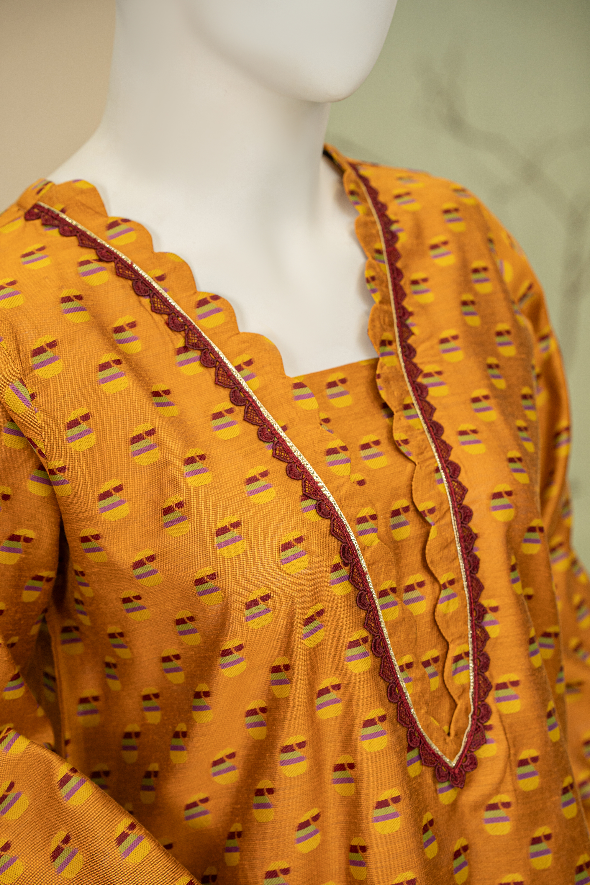 A vibrant mustard co-ord set crafted from soft viscose silk. The kurta features a broad neckline with scalloped detailing and sleeves adorned with gotta accents. Paired with a matching shalwar enhanced with gotta embellishment at the hem, this ensemble captures a refined Eastern charm.