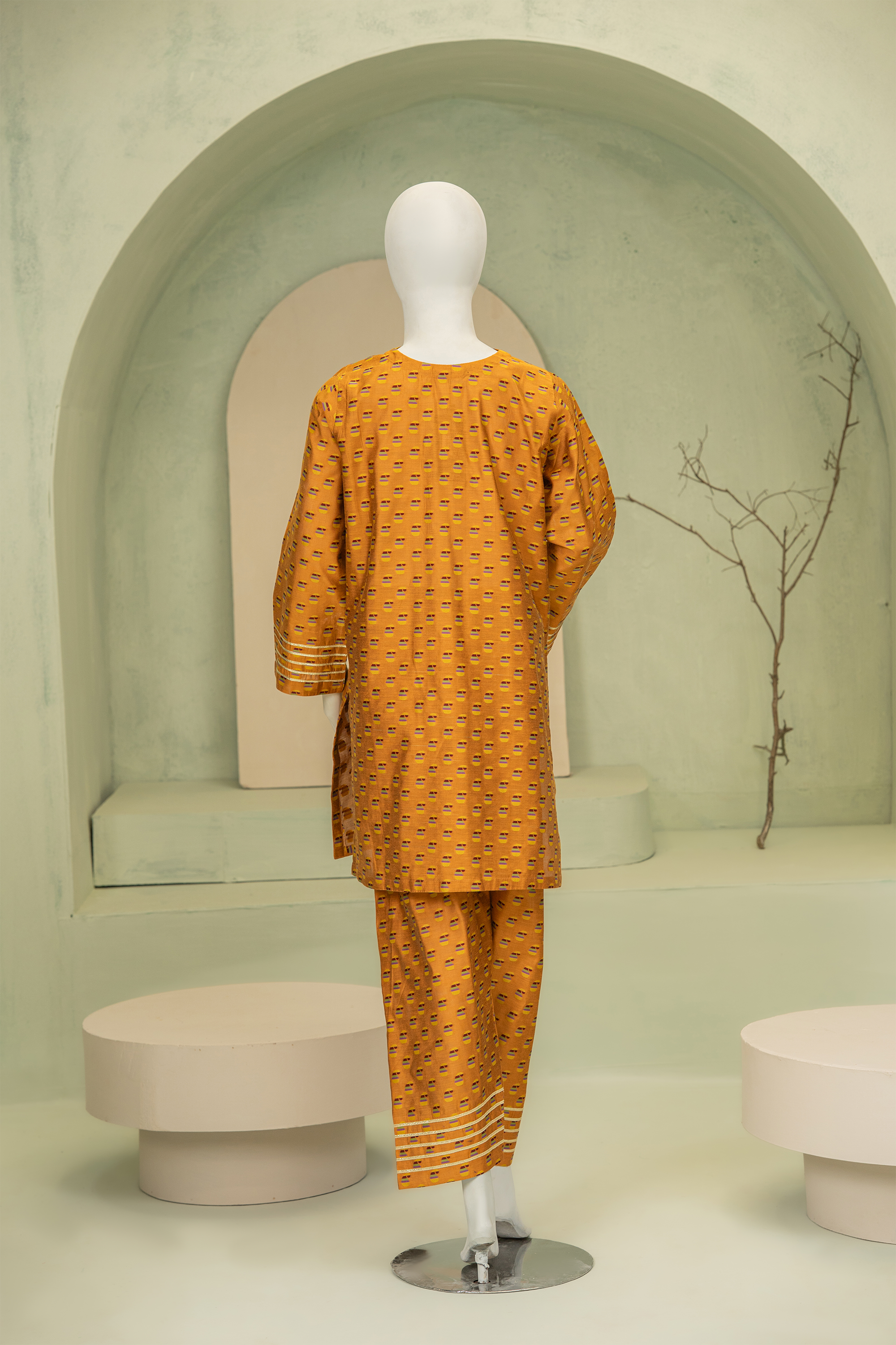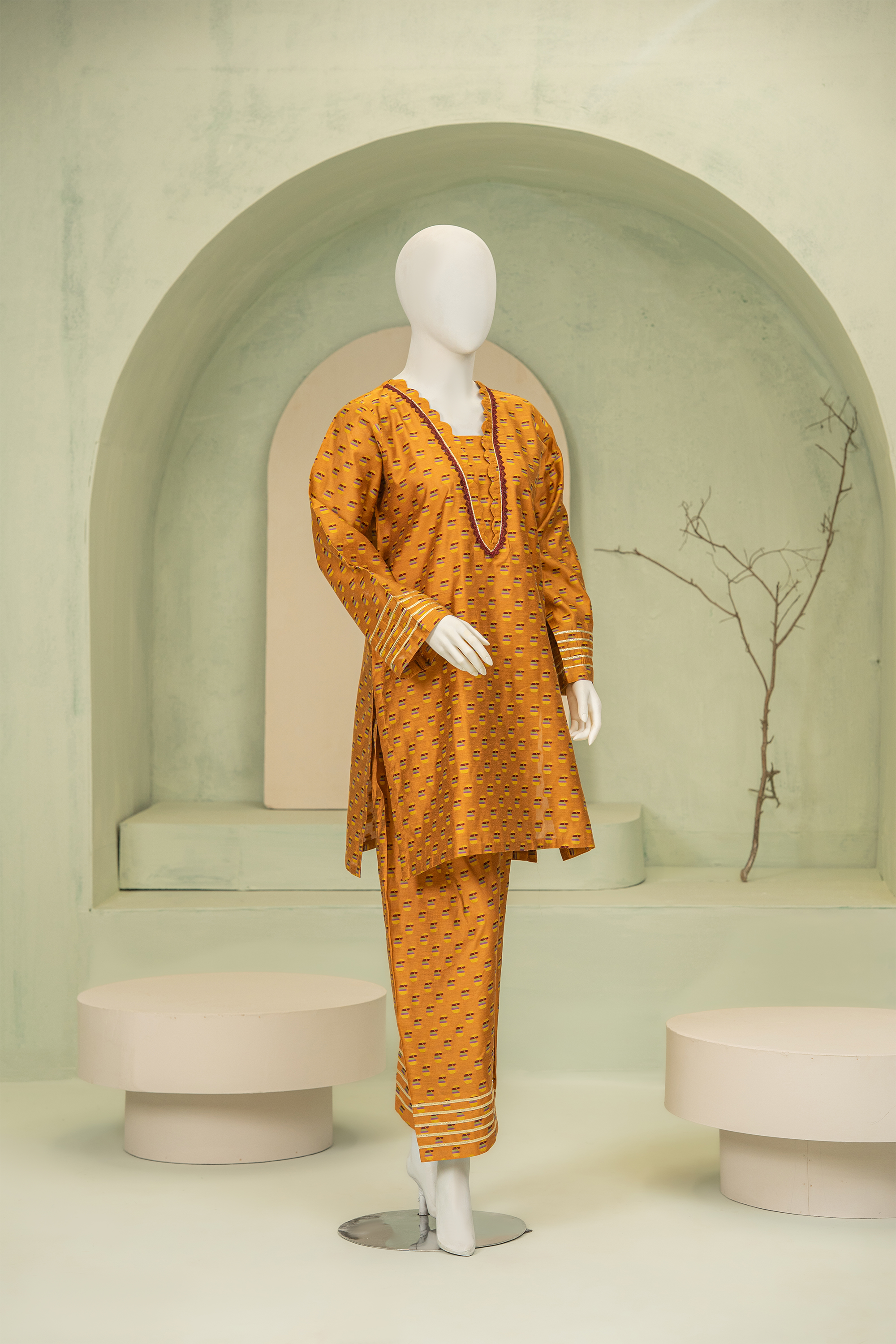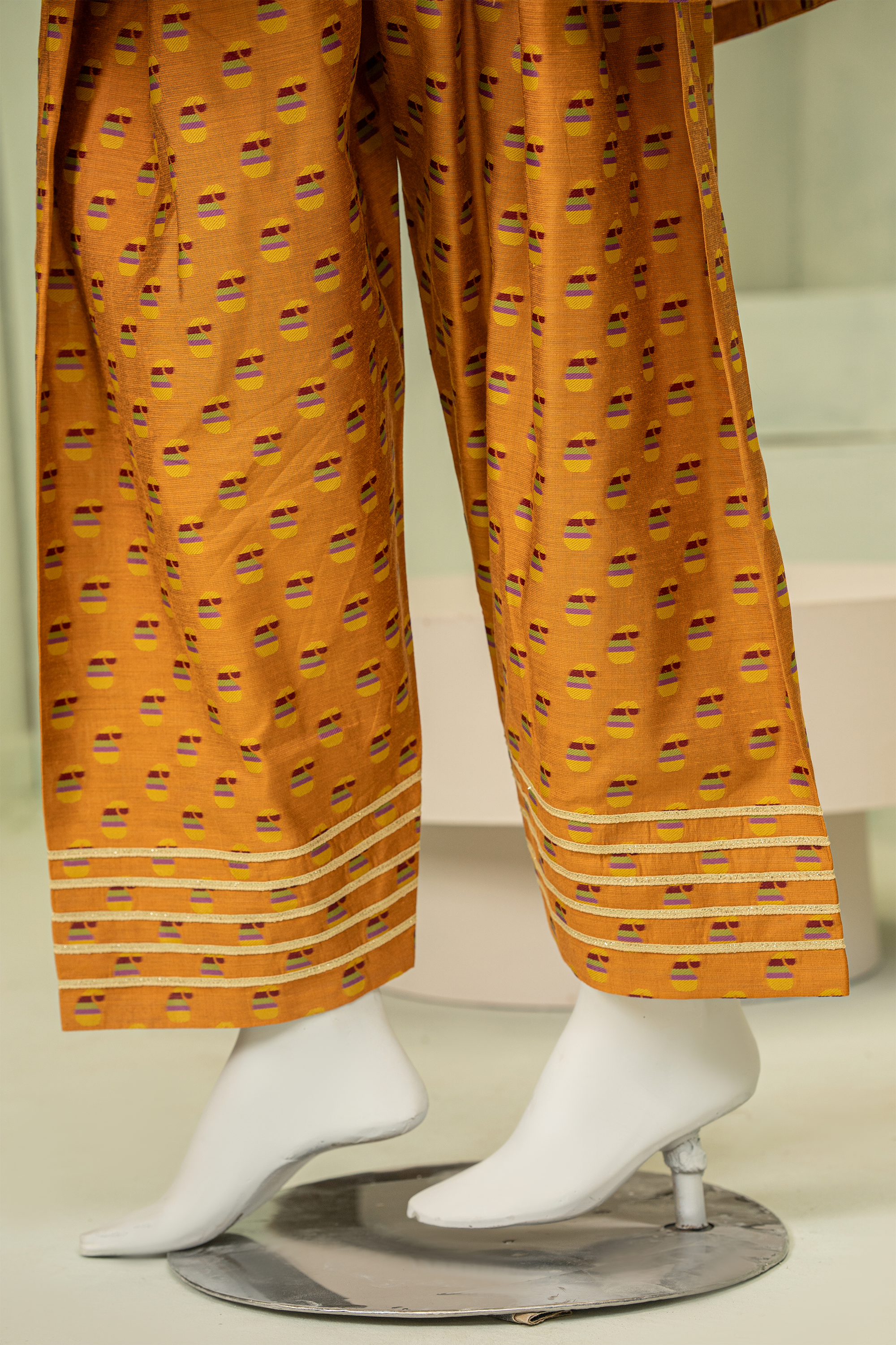 A vibrant mustard co-ord set crafted from soft viscose silk. The kurta features a broad neckline with scalloped detailing and sleeves adorned with gotta accents. Paired with a matching shalwar enhanced with gotta embellishment at the hem, this ensemble captures a refined Eastern charm.