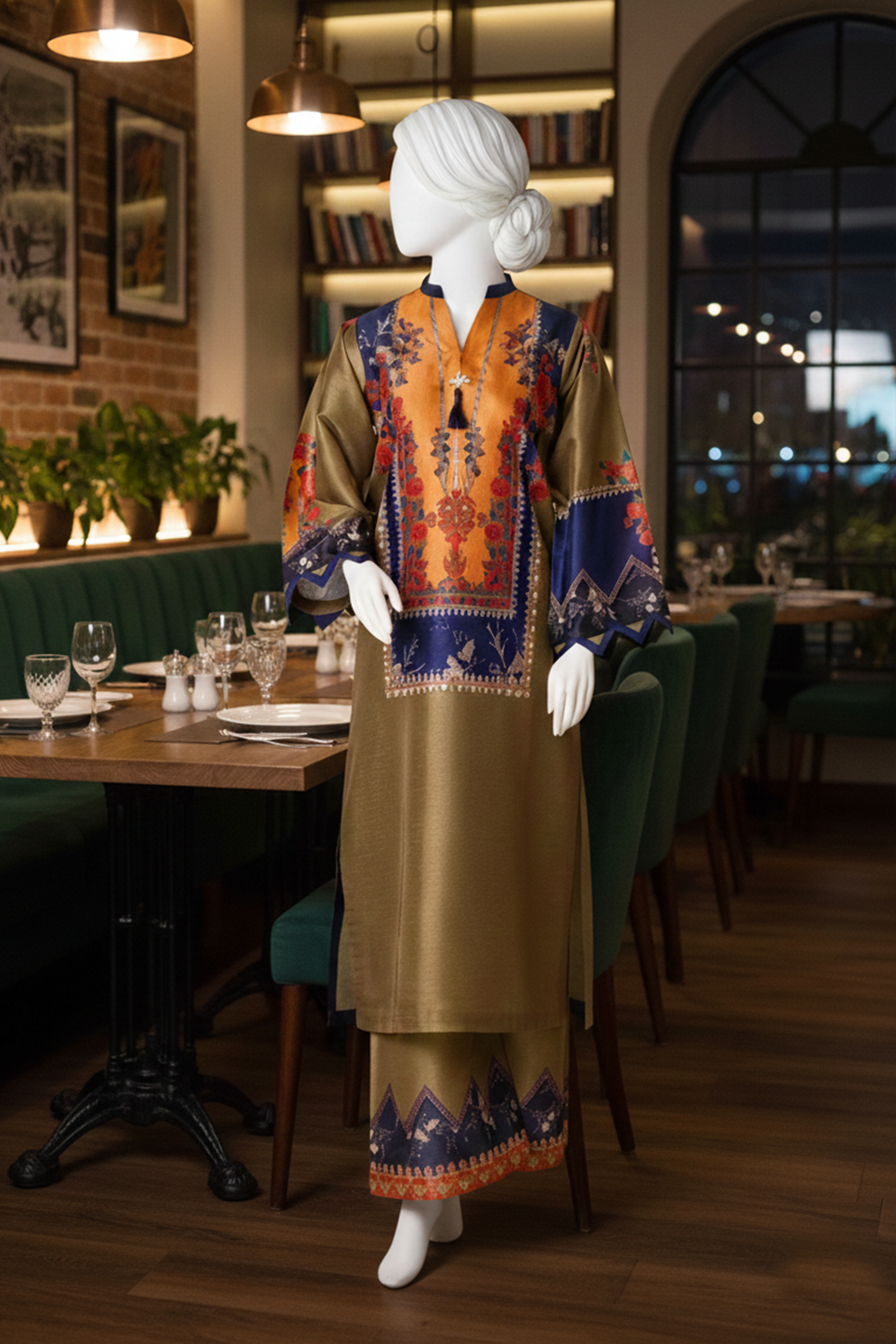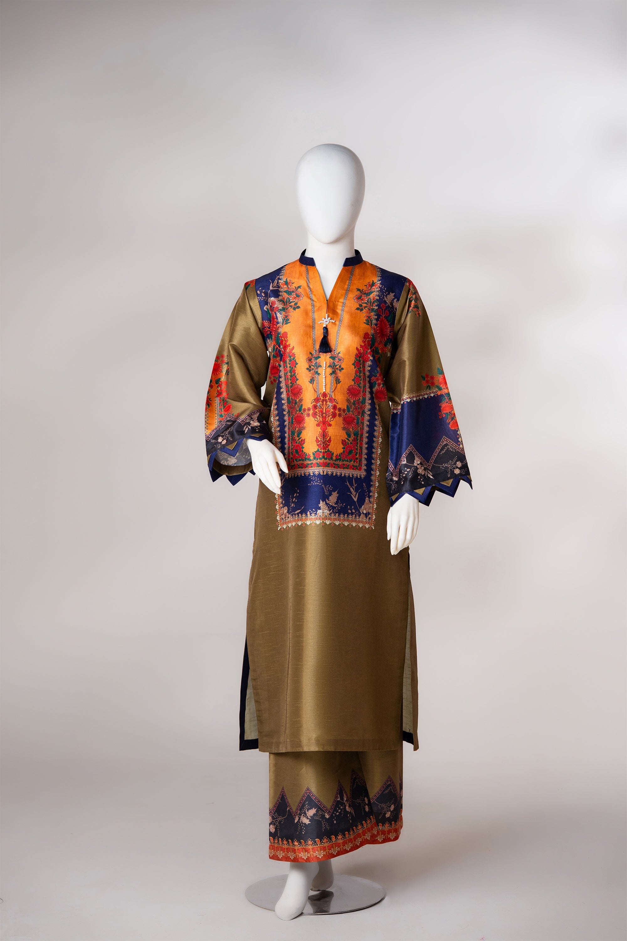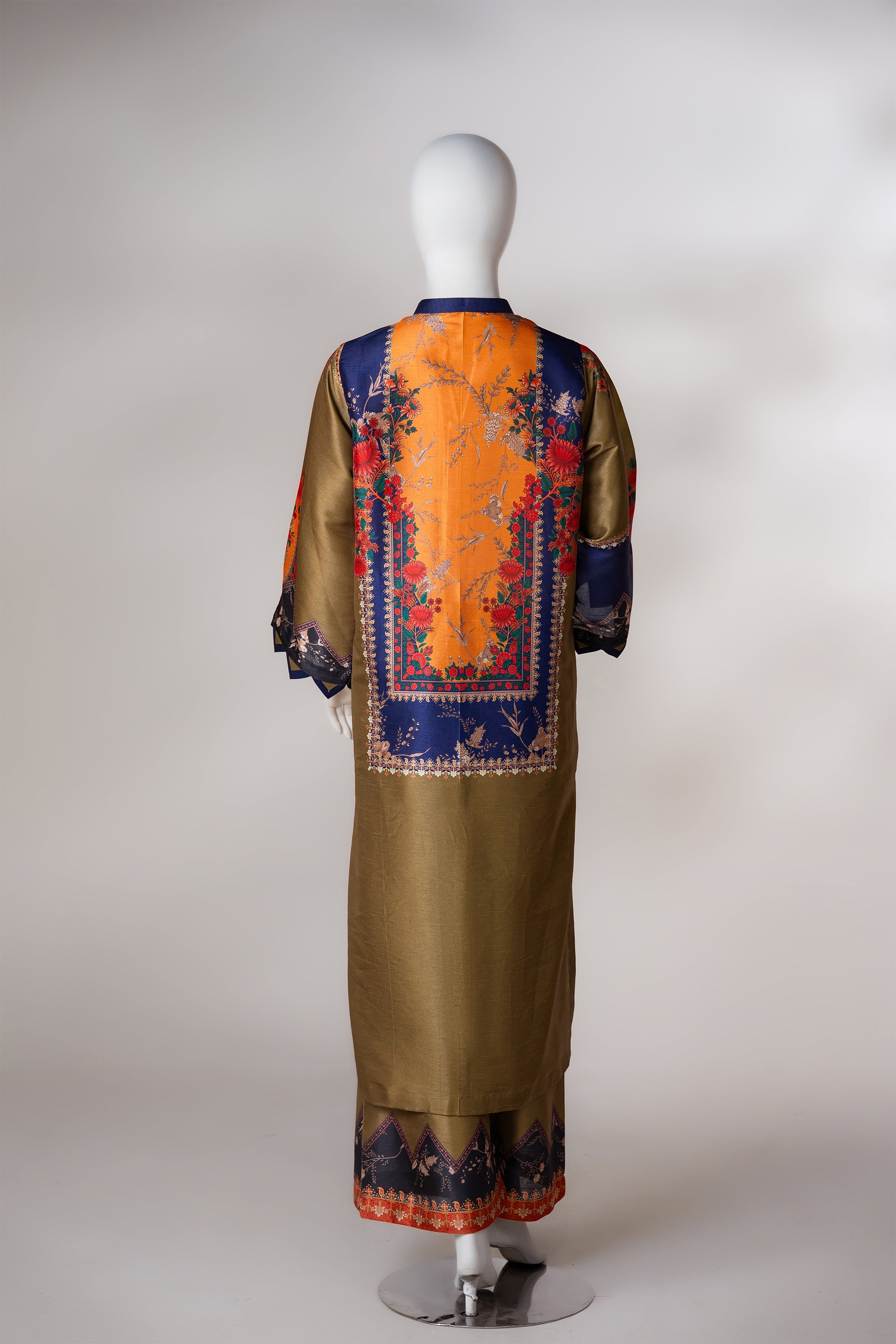 A two-piece printed set in vibrant green and orange color-blocking, featuring a blend of geometric patterns and soft florals. The neckline is accented with delicate tassels and buttons, while subtle cutwork adds texture to the sleeves. Paired with printed trousers, it creates a statement yet effortlessly wearable look.