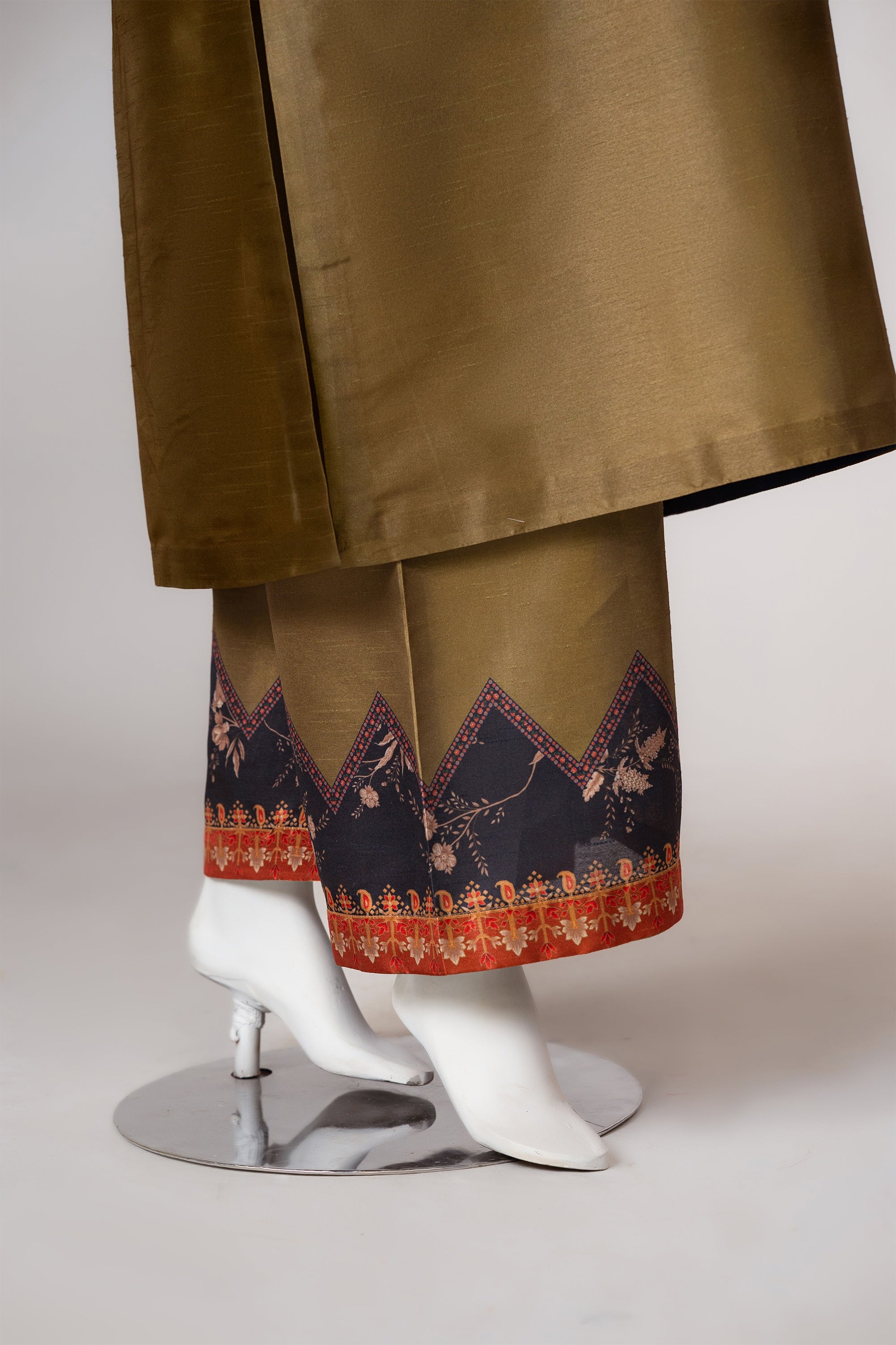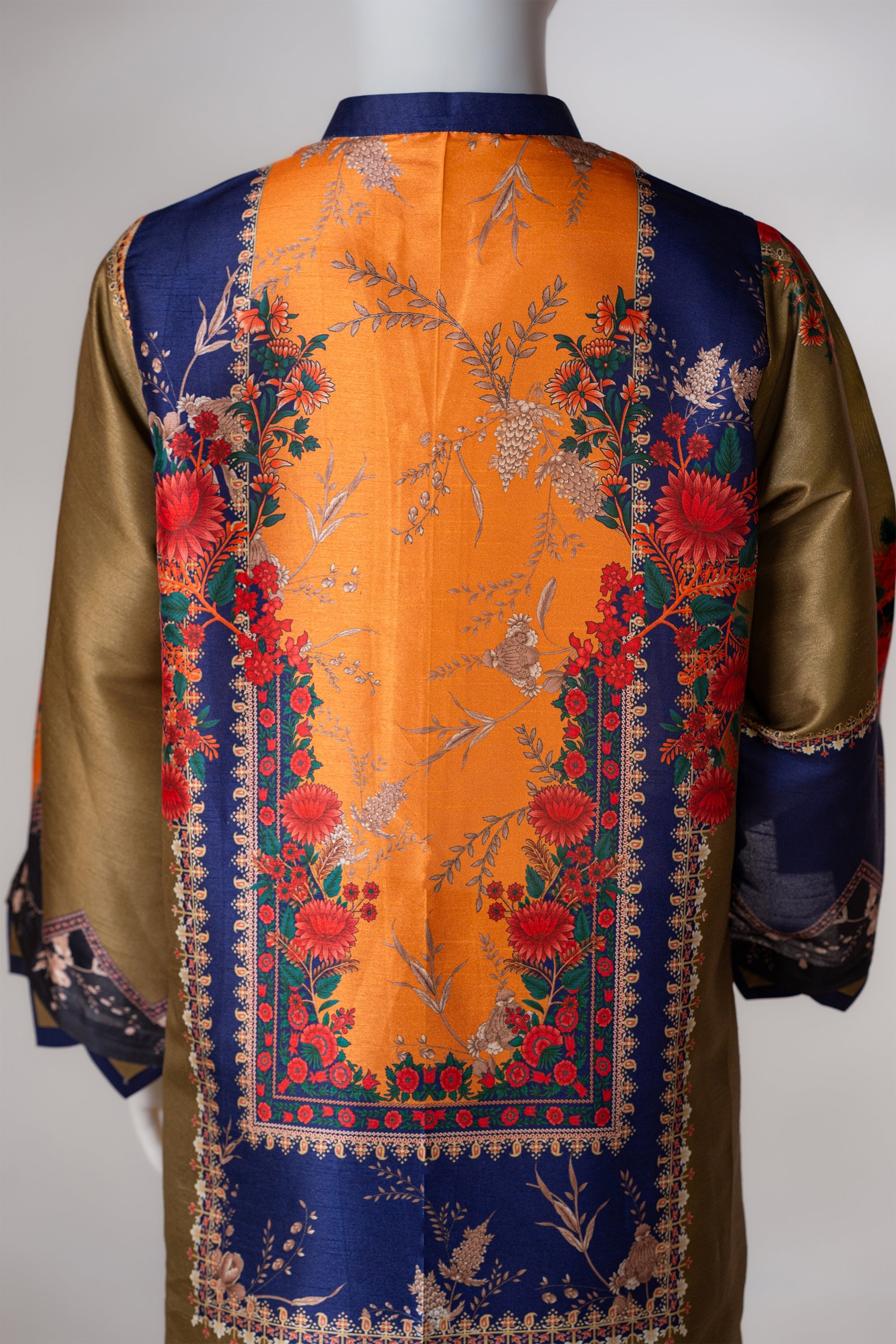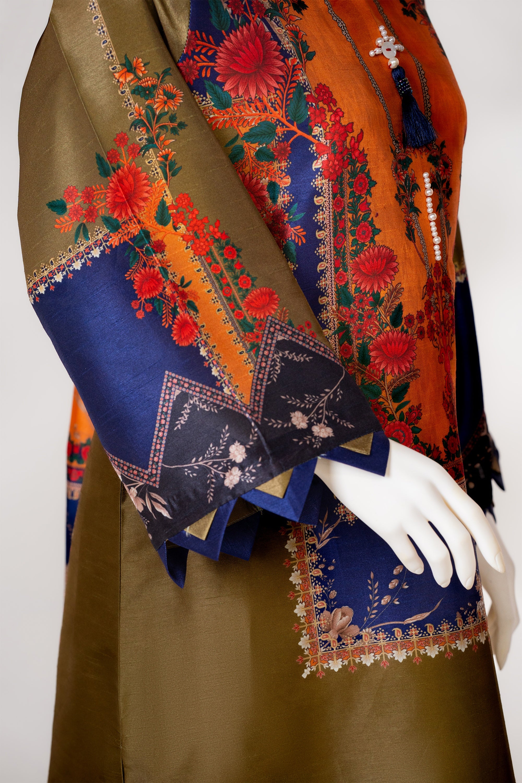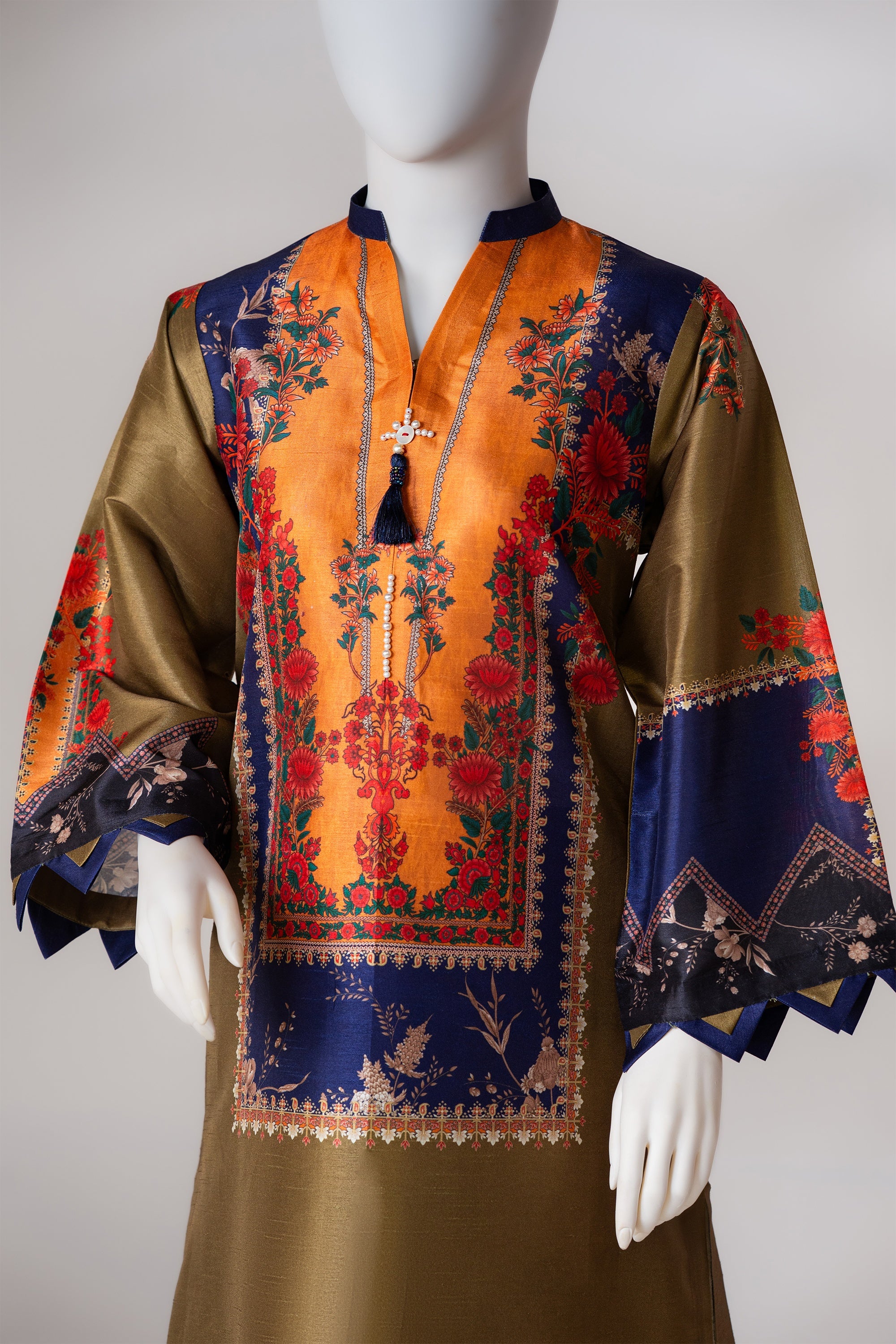 A two-piece printed set in vibrant green and orange color-blocking, featuring a blend of geometric patterns and soft florals. The neckline is accented with delicate tassels and buttons, while subtle cutwork adds texture to the sleeves. Paired with printed trousers, it creates a statement yet effortlessly wearable look.