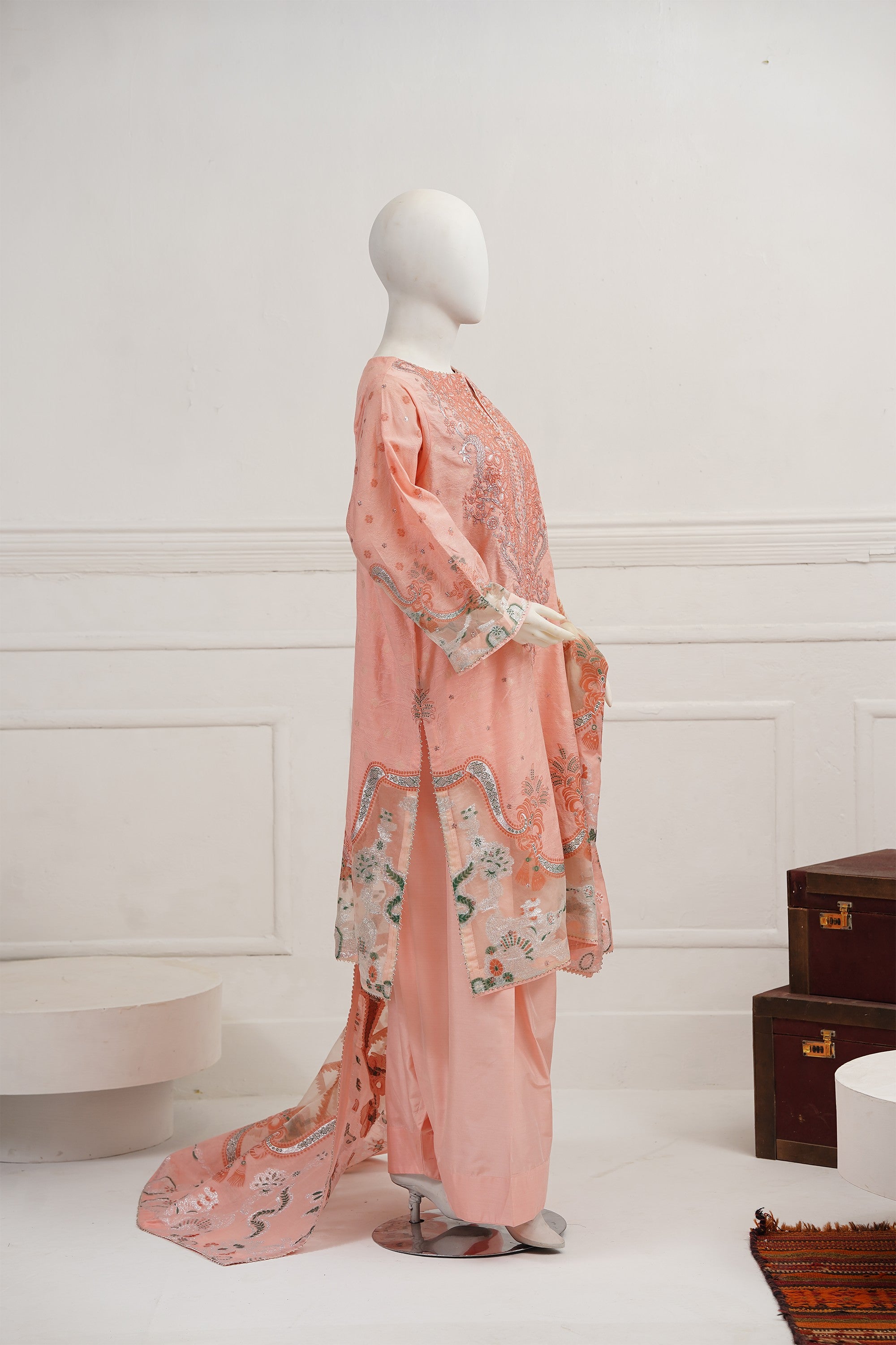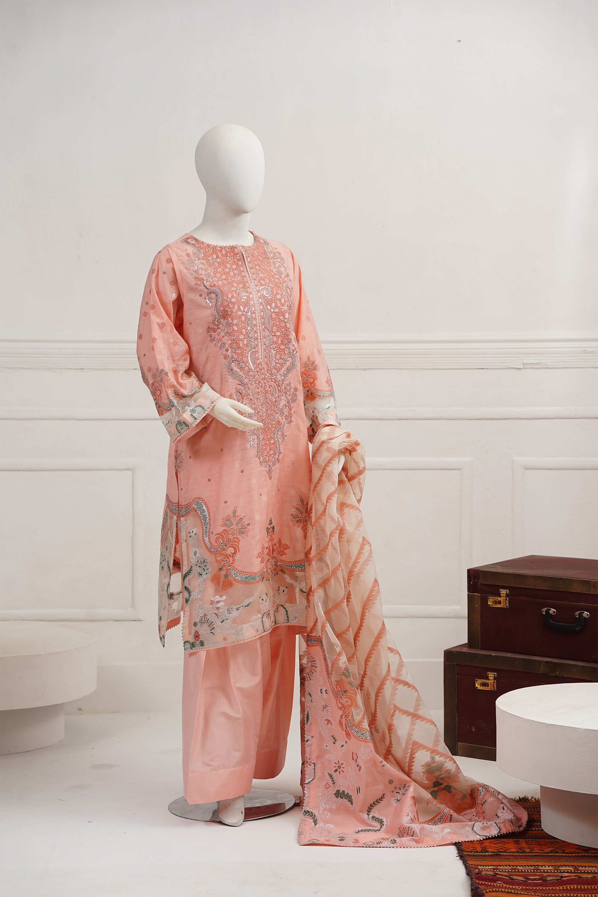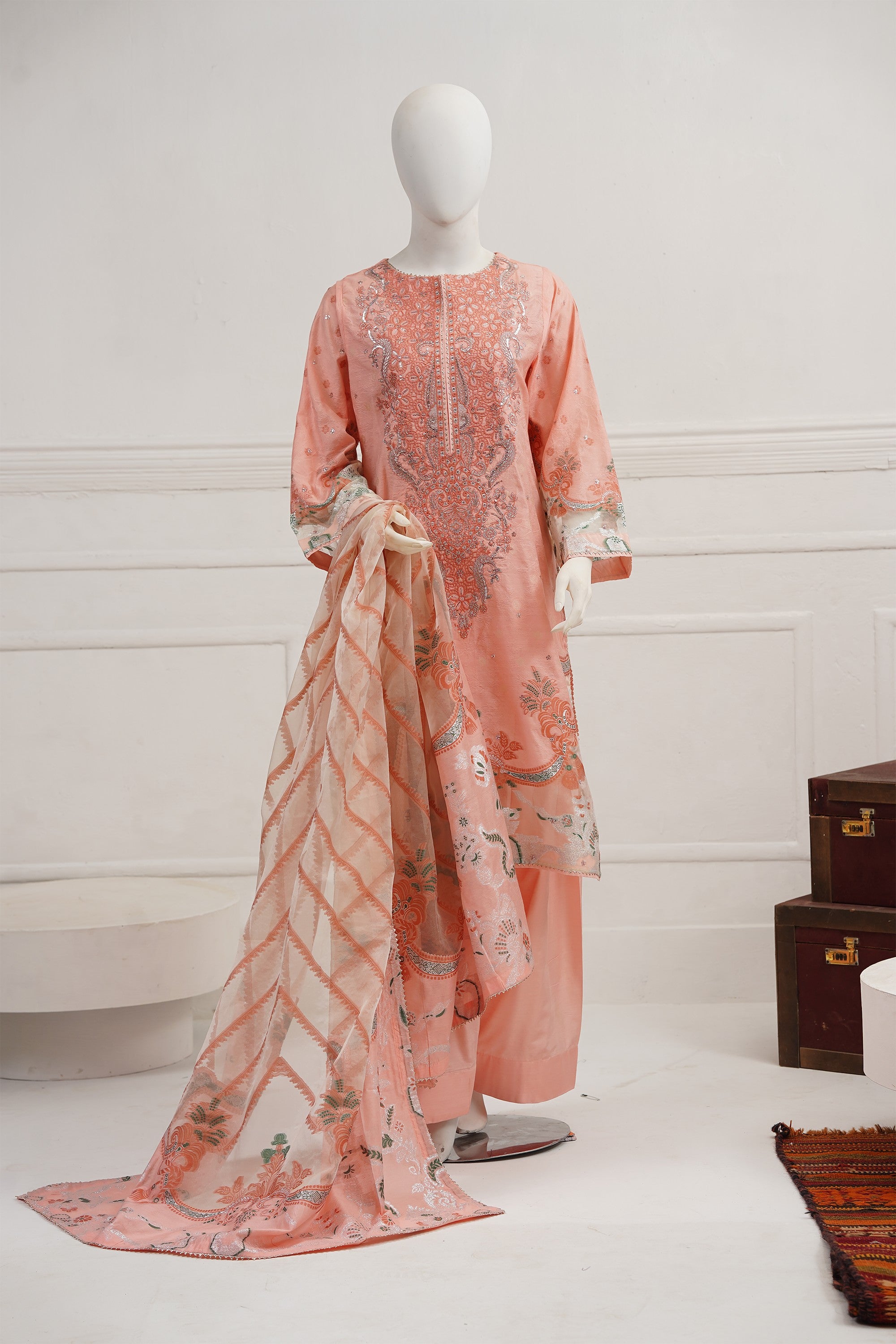 A beautifully embroidered self–viscose silk shirt front, enhanced with exquisite organza-detailed jacquard on the daman and sleeves. It is paired with matching trousers featuring elegant stitched hem accents. The look is completed with a luxurious organza silk jacquard dupatta, creating a statement ensemble ideal for festive and celebratory occasions.