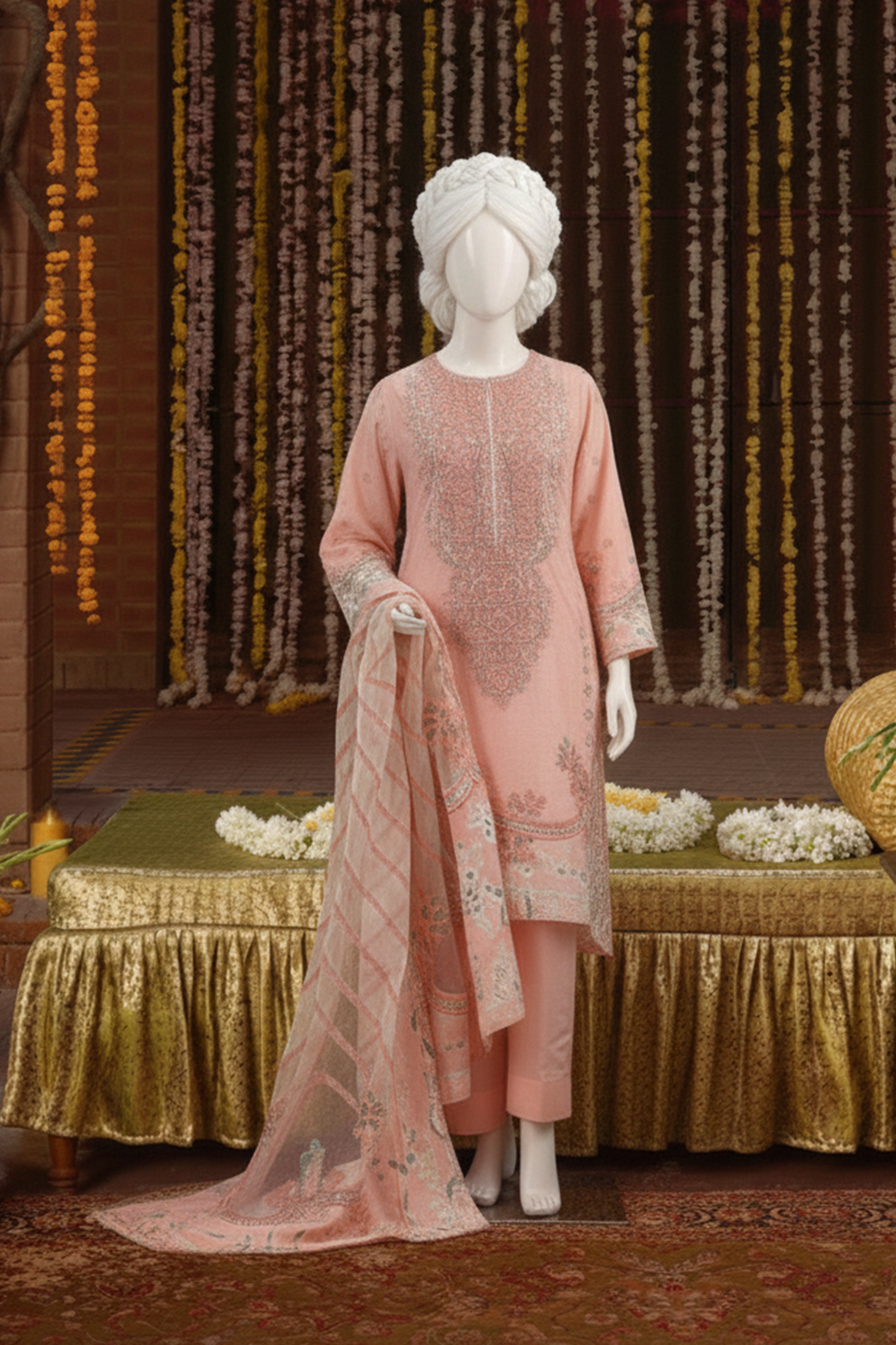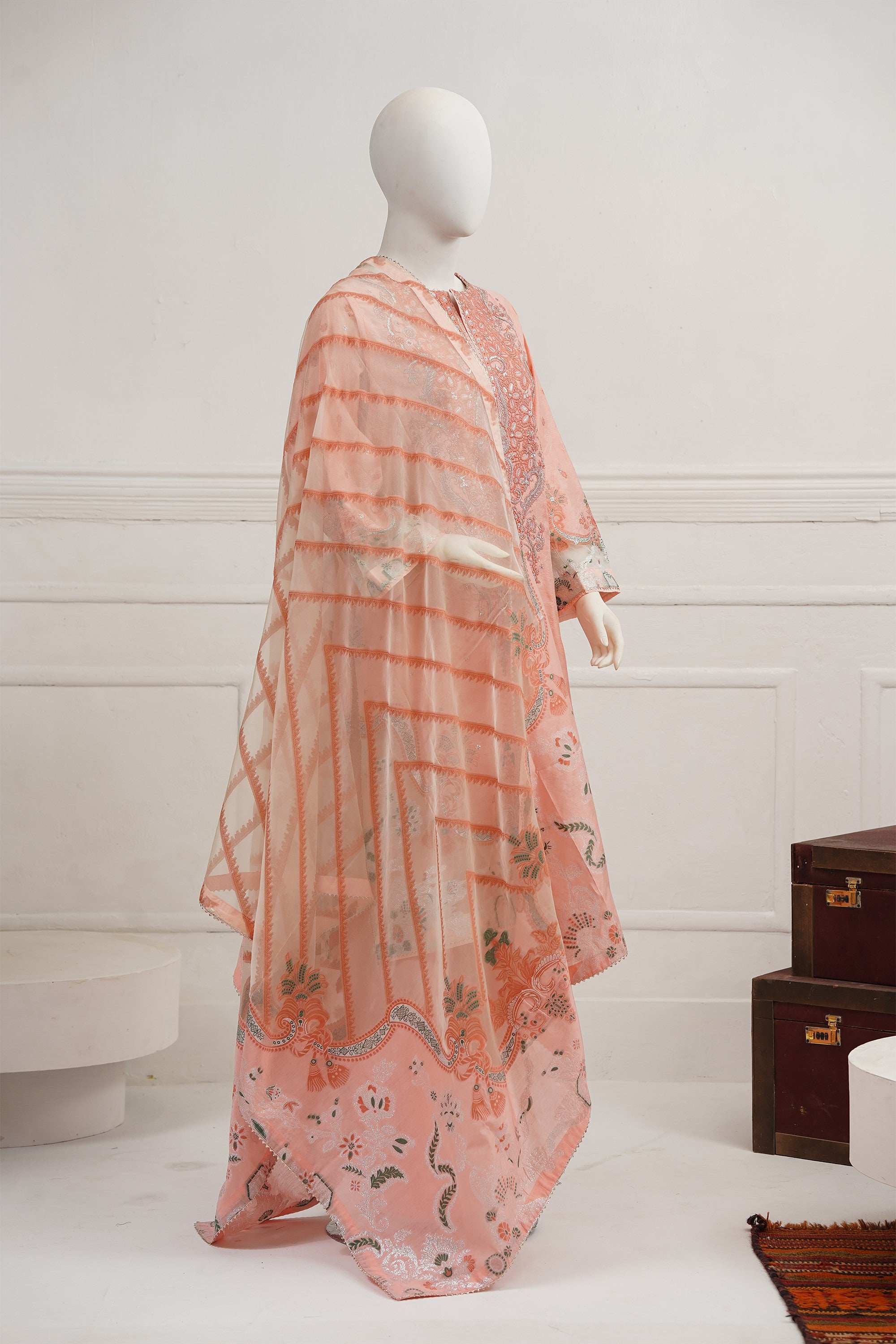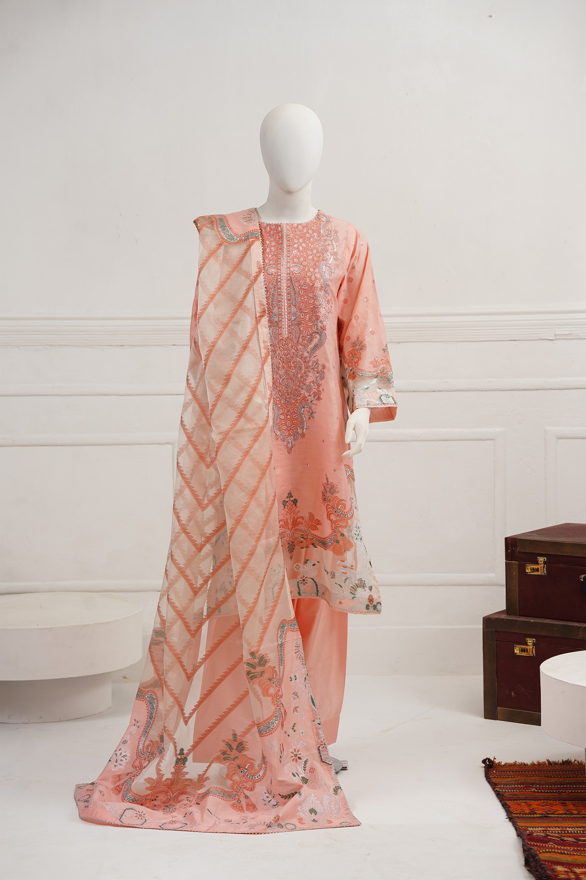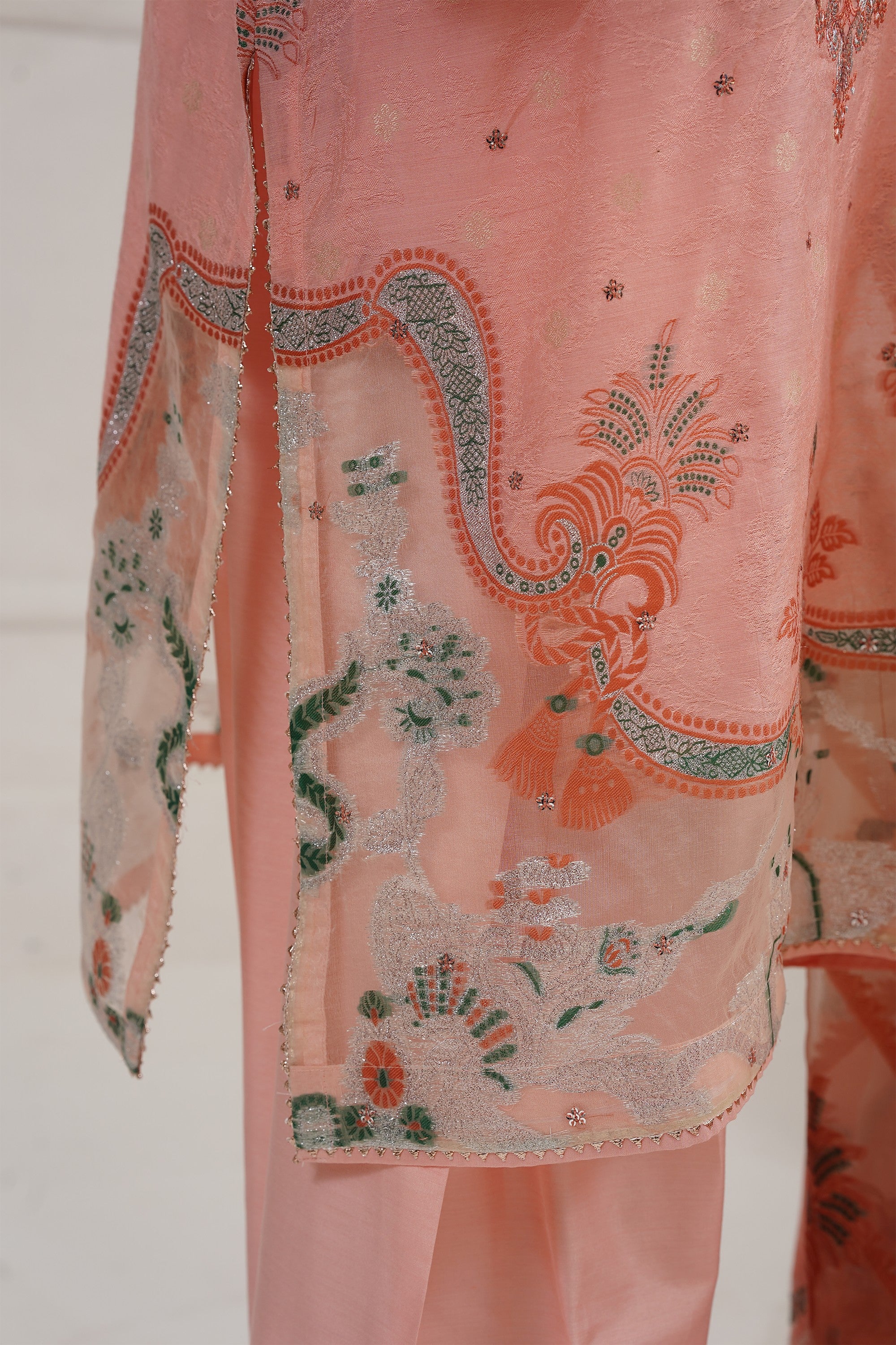 A beautifully embroidered self–viscose silk shirt front, enhanced with exquisite organza-detailed jacquard on the daman and sleeves. It is paired with matching trousers featuring elegant stitched hem accents. The look is completed with a luxurious organza silk jacquard dupatta, creating a statement ensemble ideal for festive and celebratory occasions.