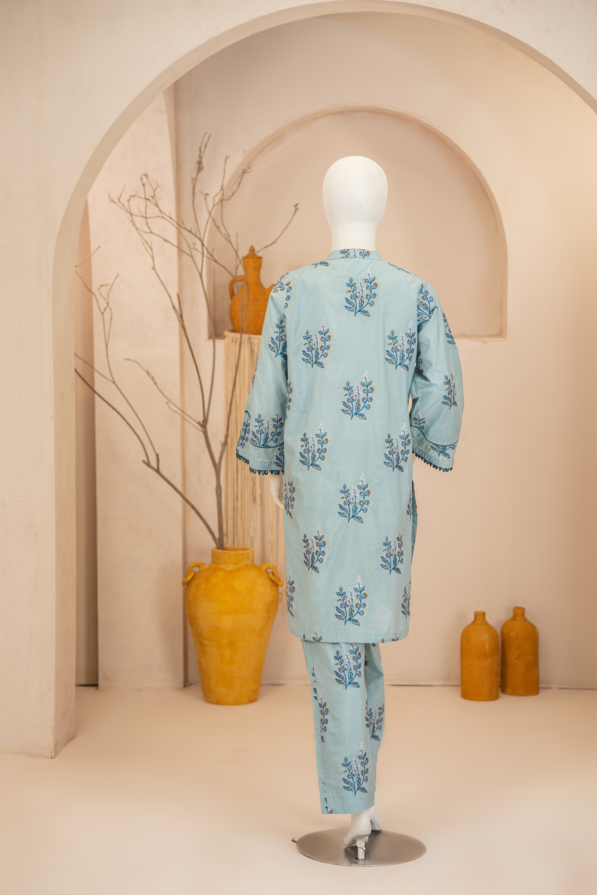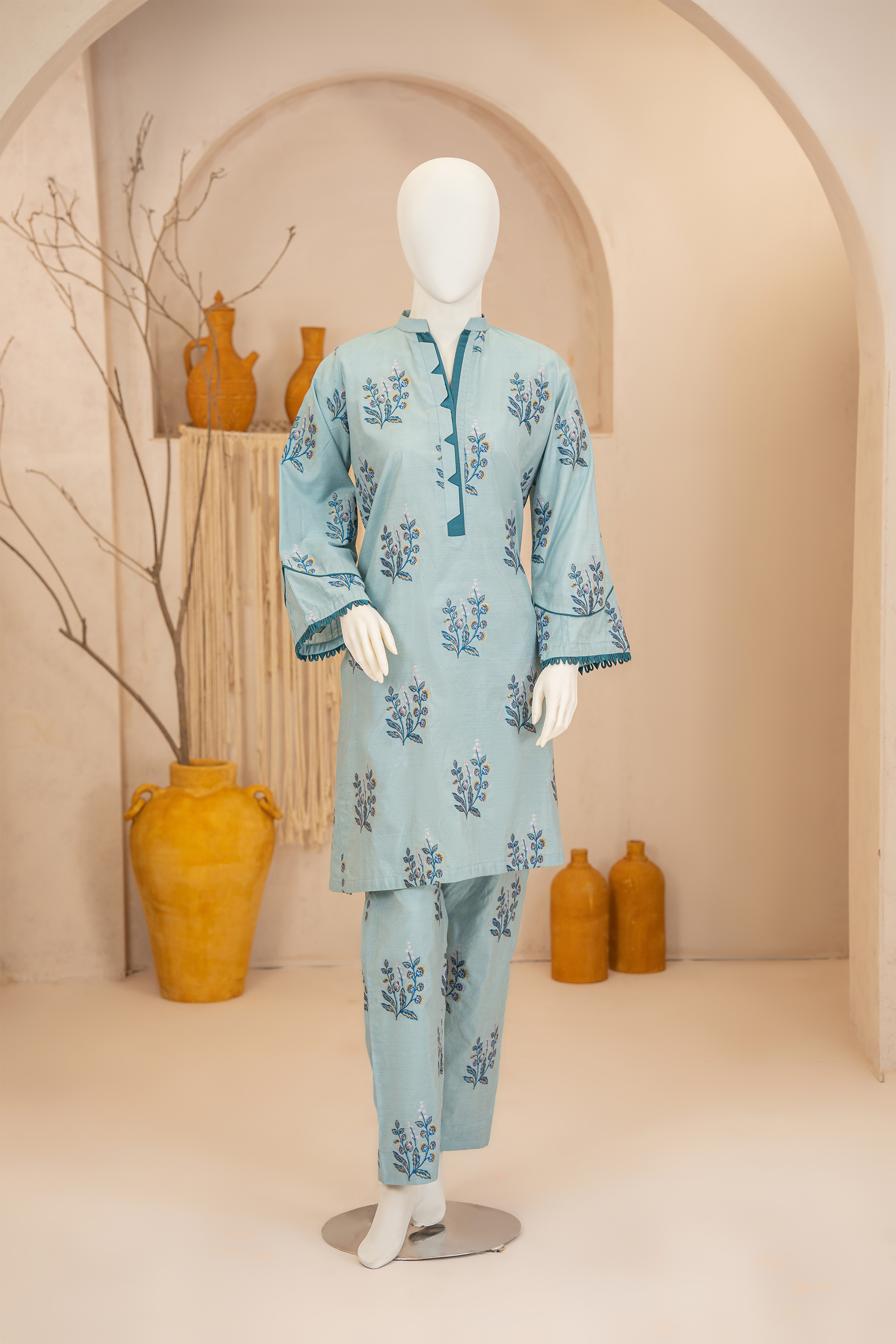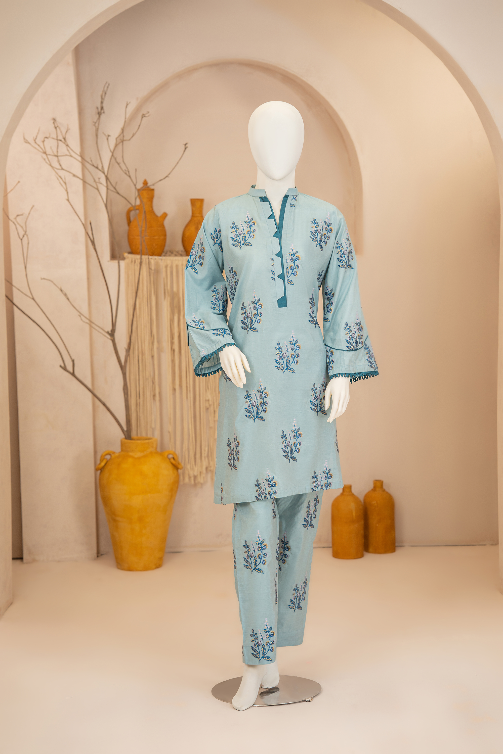 Immerse yourself in a sea colors, this embroidered look alike jacquard co-ord suit is a celebration of joyous artistry. The straight look shirt, while the coordinating trousers. This stunning ensemble is the epitome of cheerful sophistication.