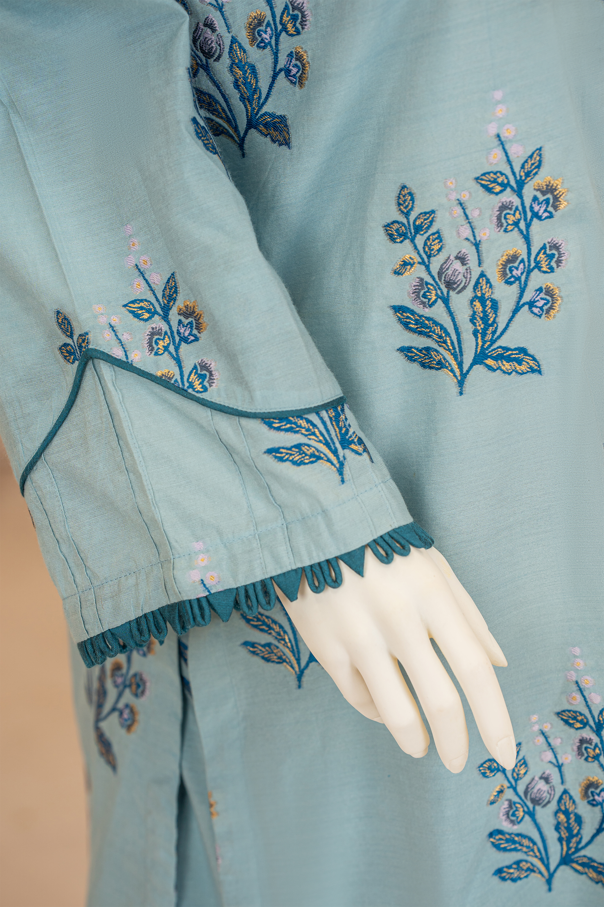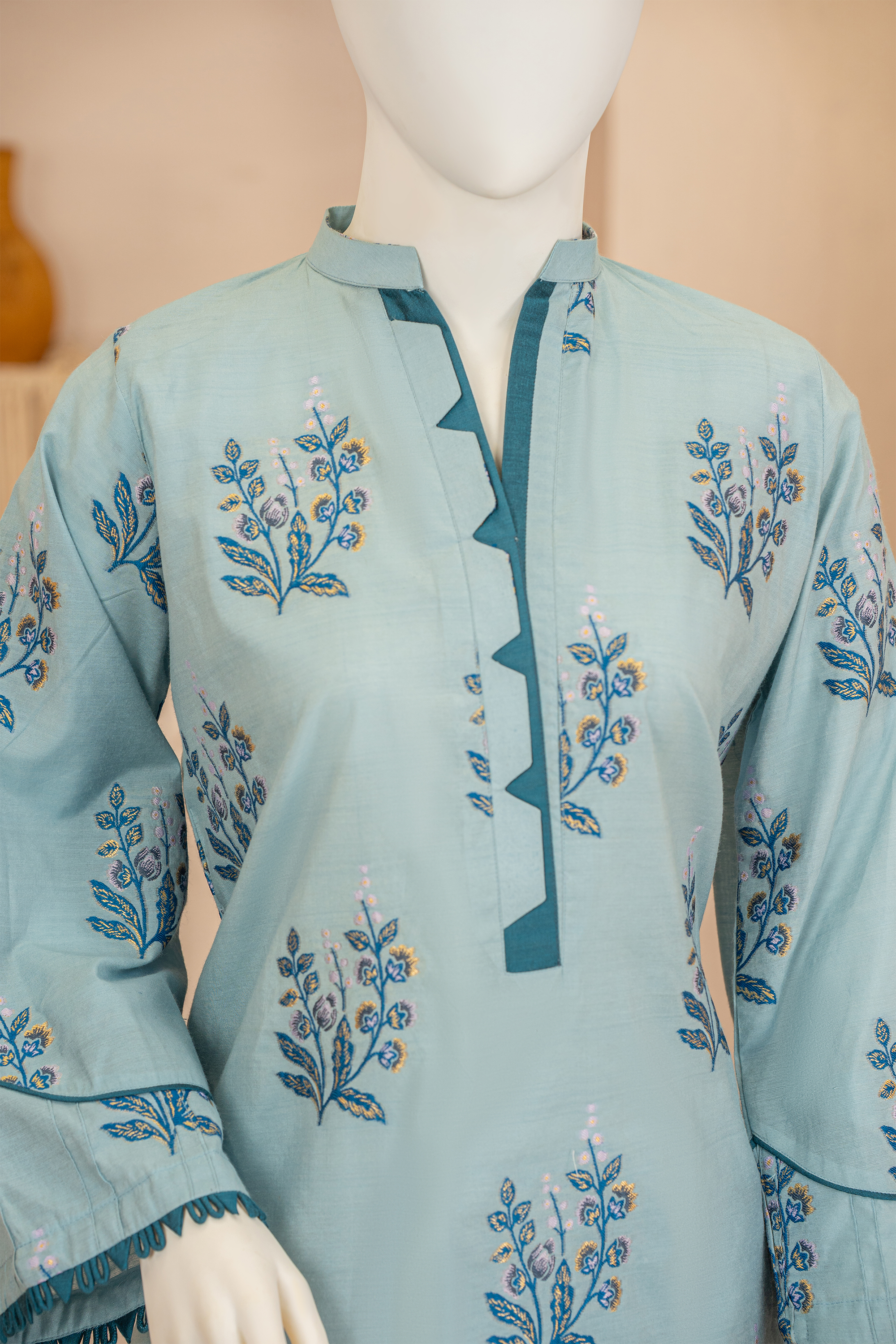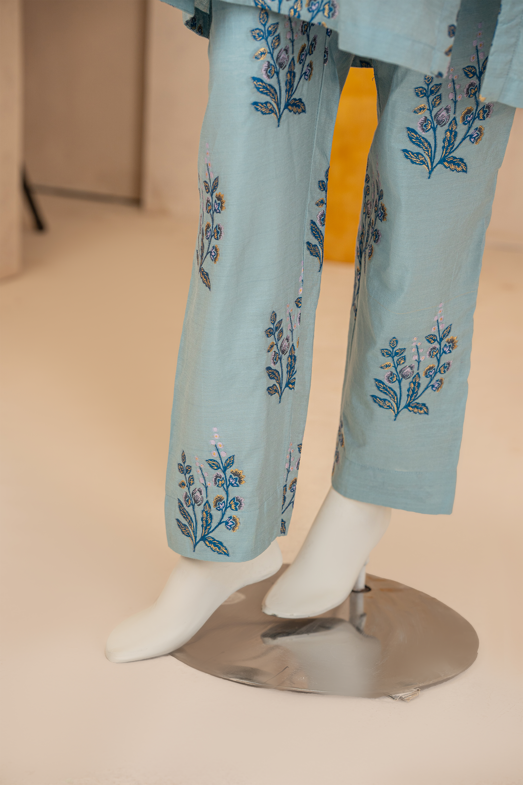Immerse yourself in a sea colors, this embroidered look alike jacquard co-ord suit is a celebration of joyous artistry. The straight look shirt, while the coordinating trousers. This stunning ensemble is the epitome of cheerful sophistication.