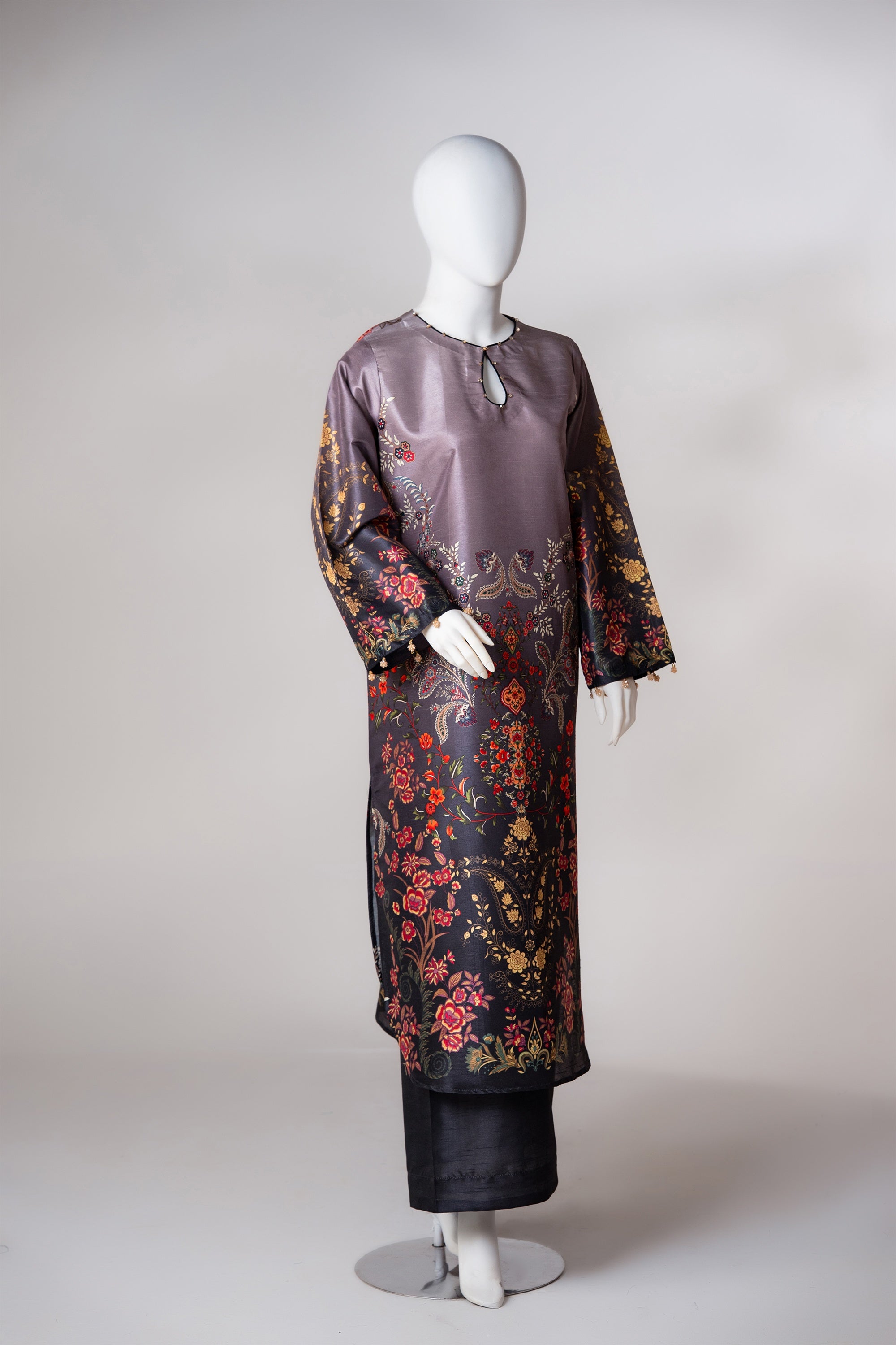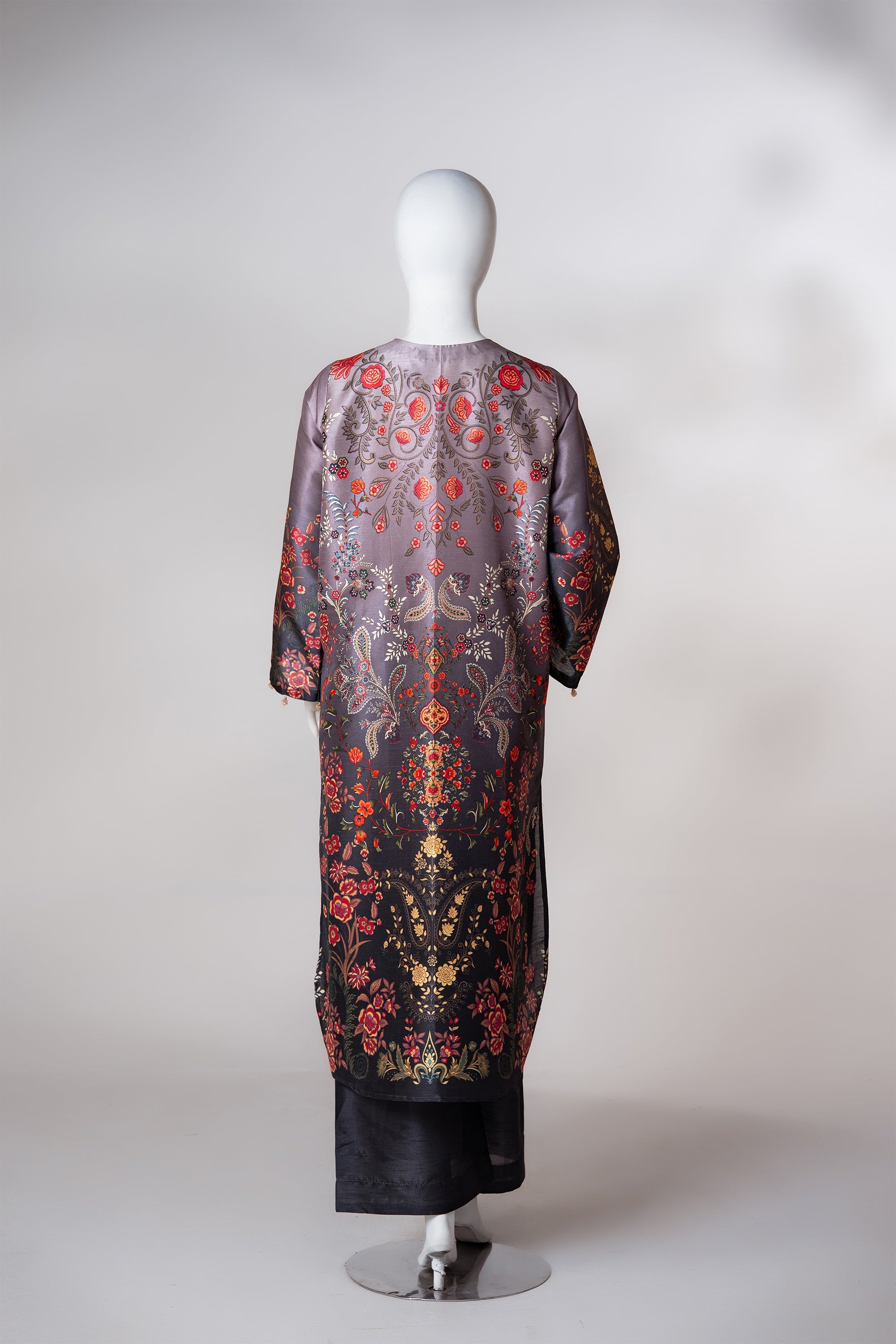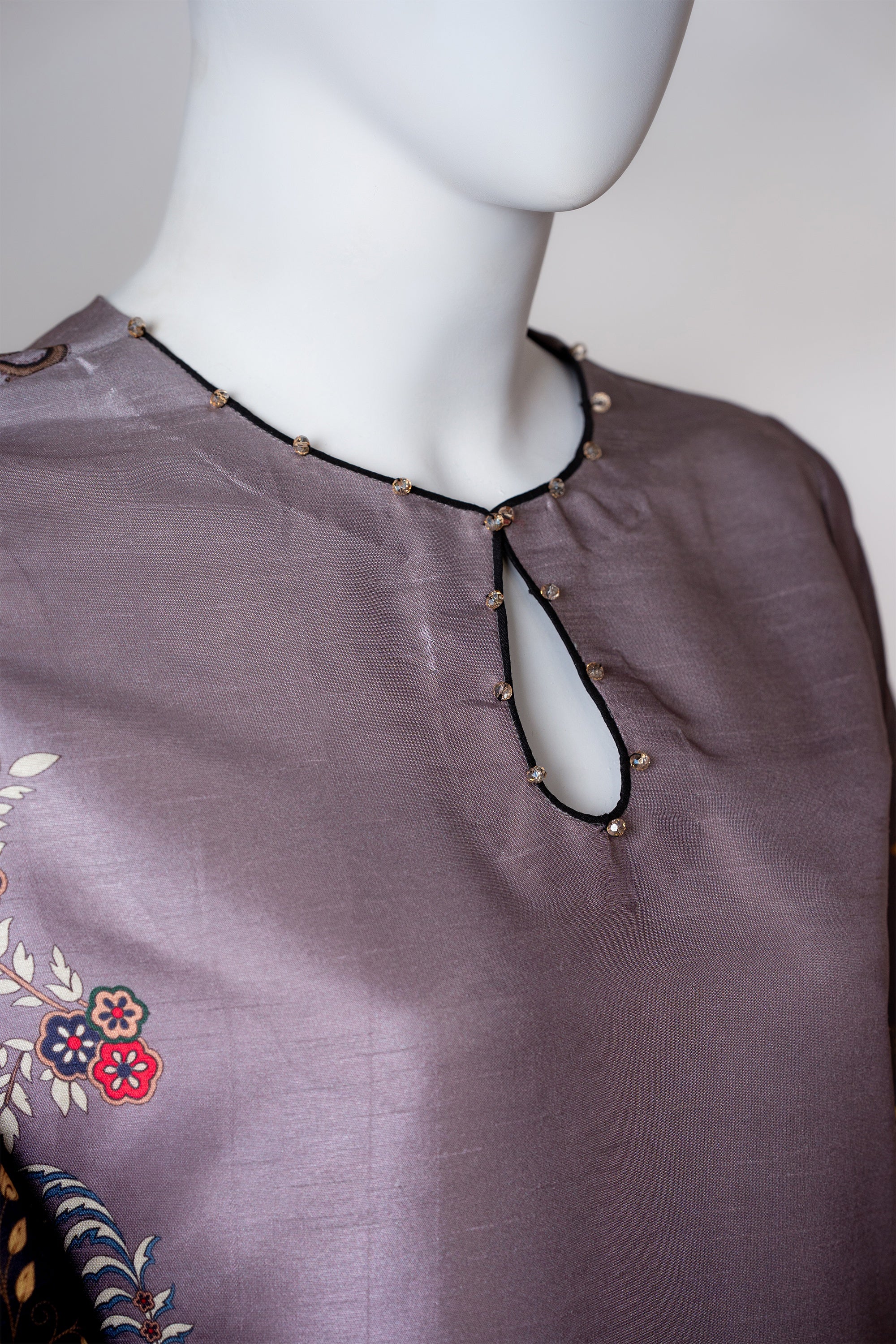 This sophisticated grey ensemble showcases a relaxed silhouette enhanced with digital prints. The neckline features a keyhole design adorned with crystals, while the sleeves are accented with crystal buttons. Paired with matching trousers for a refined finish.