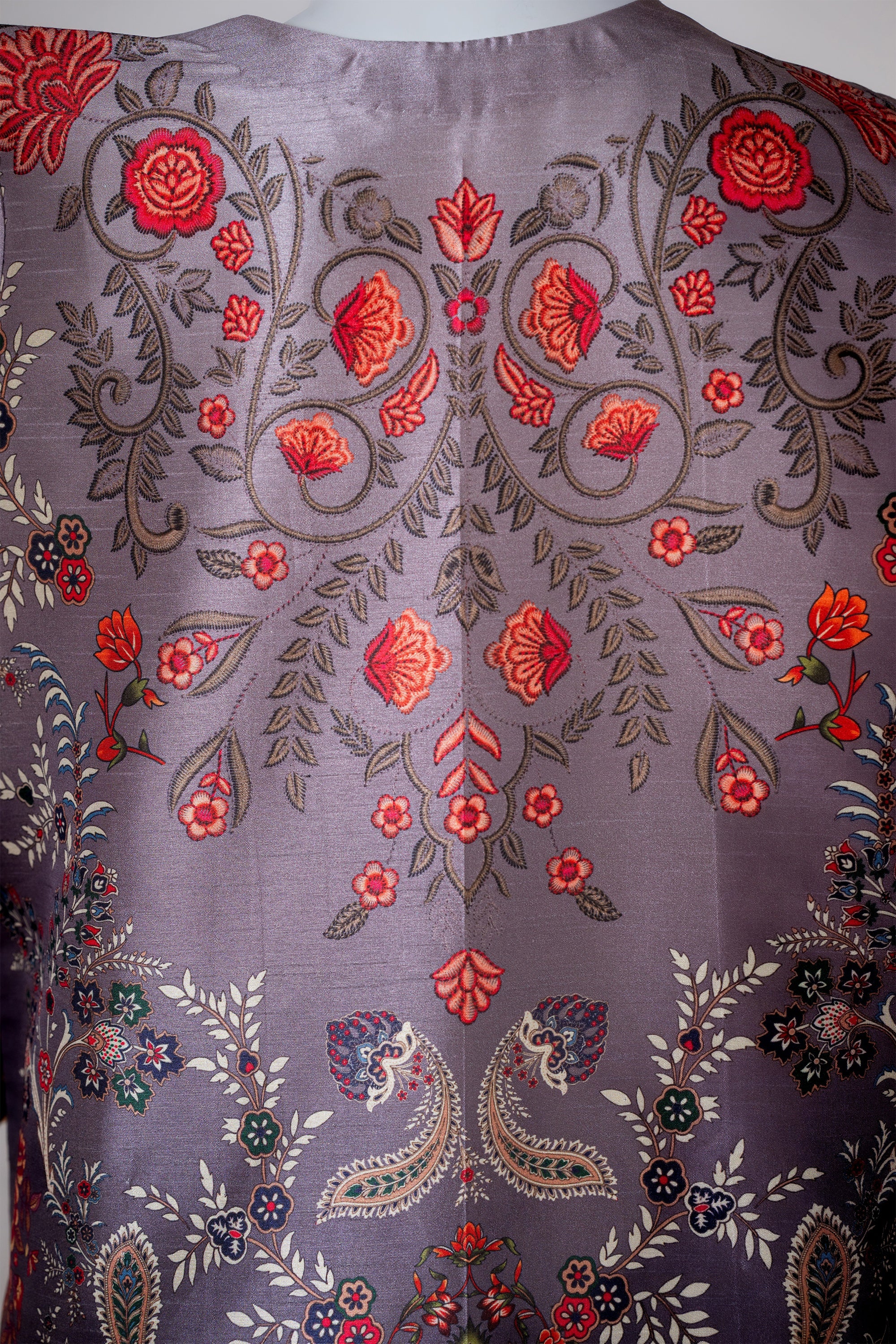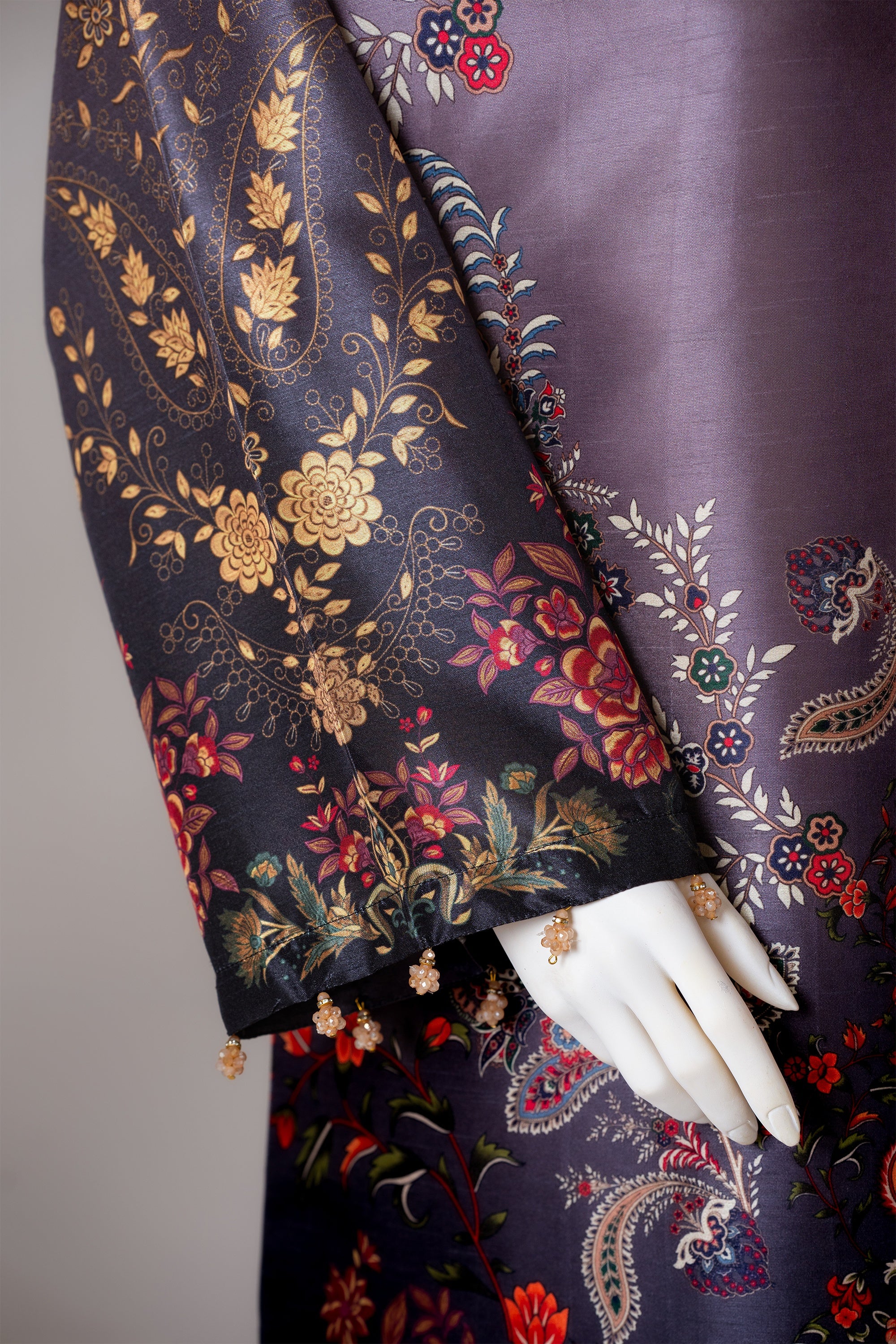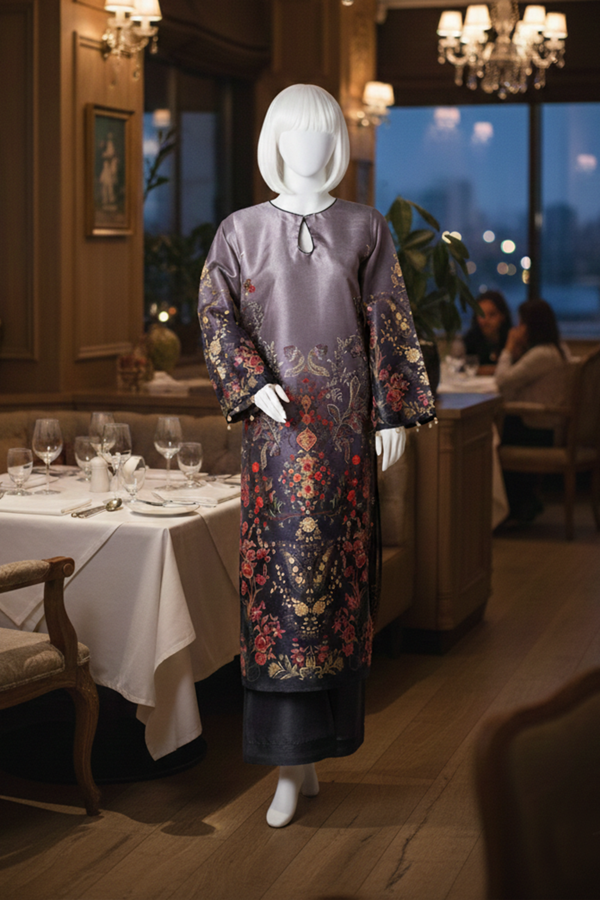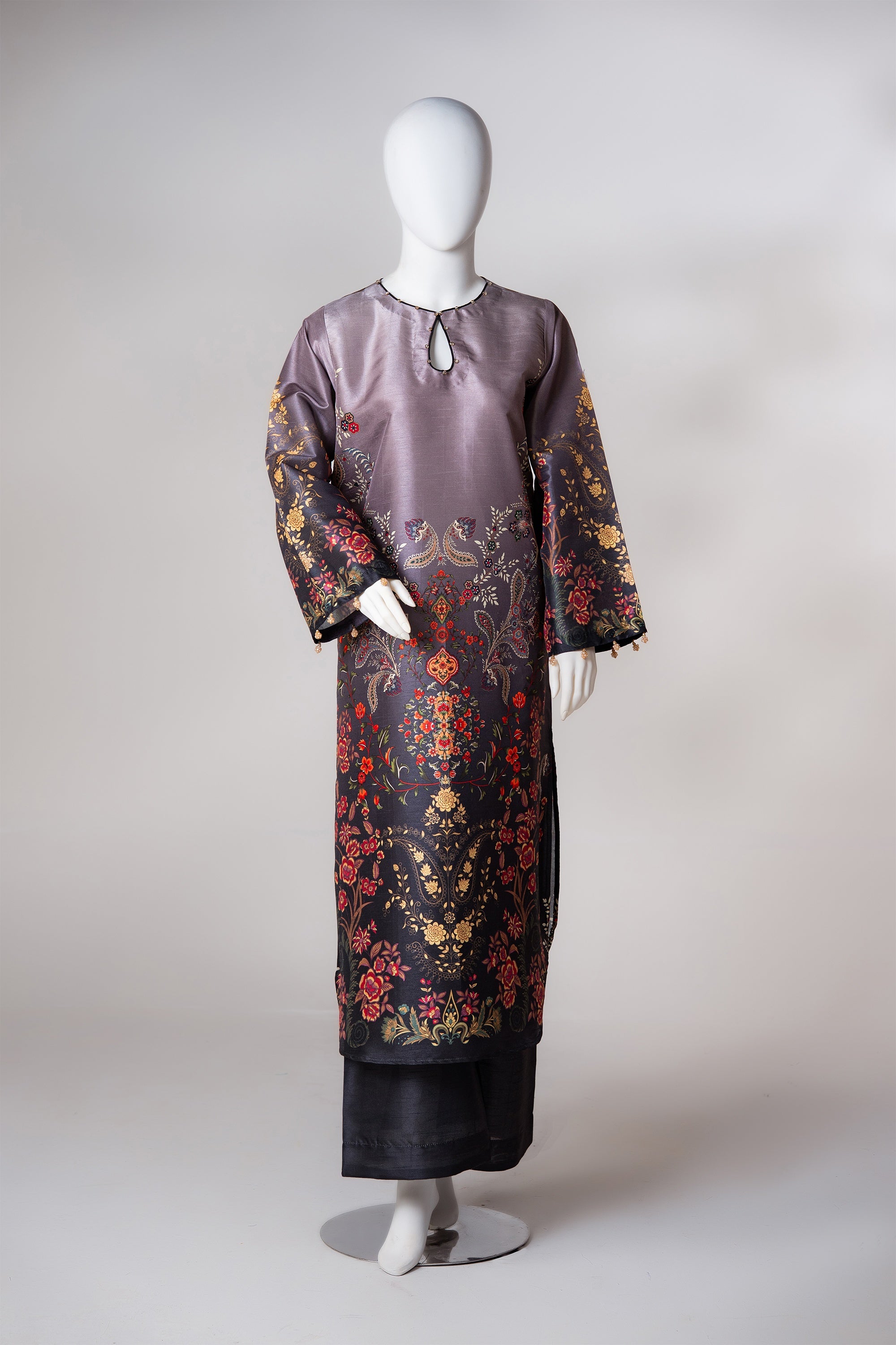 This sophisticated grey ensemble showcases a relaxed silhouette enhanced with digital prints. The neckline features a keyhole design adorned with crystals, while the sleeves are accented with crystal buttons. Paired with matching trousers for a refined finish.