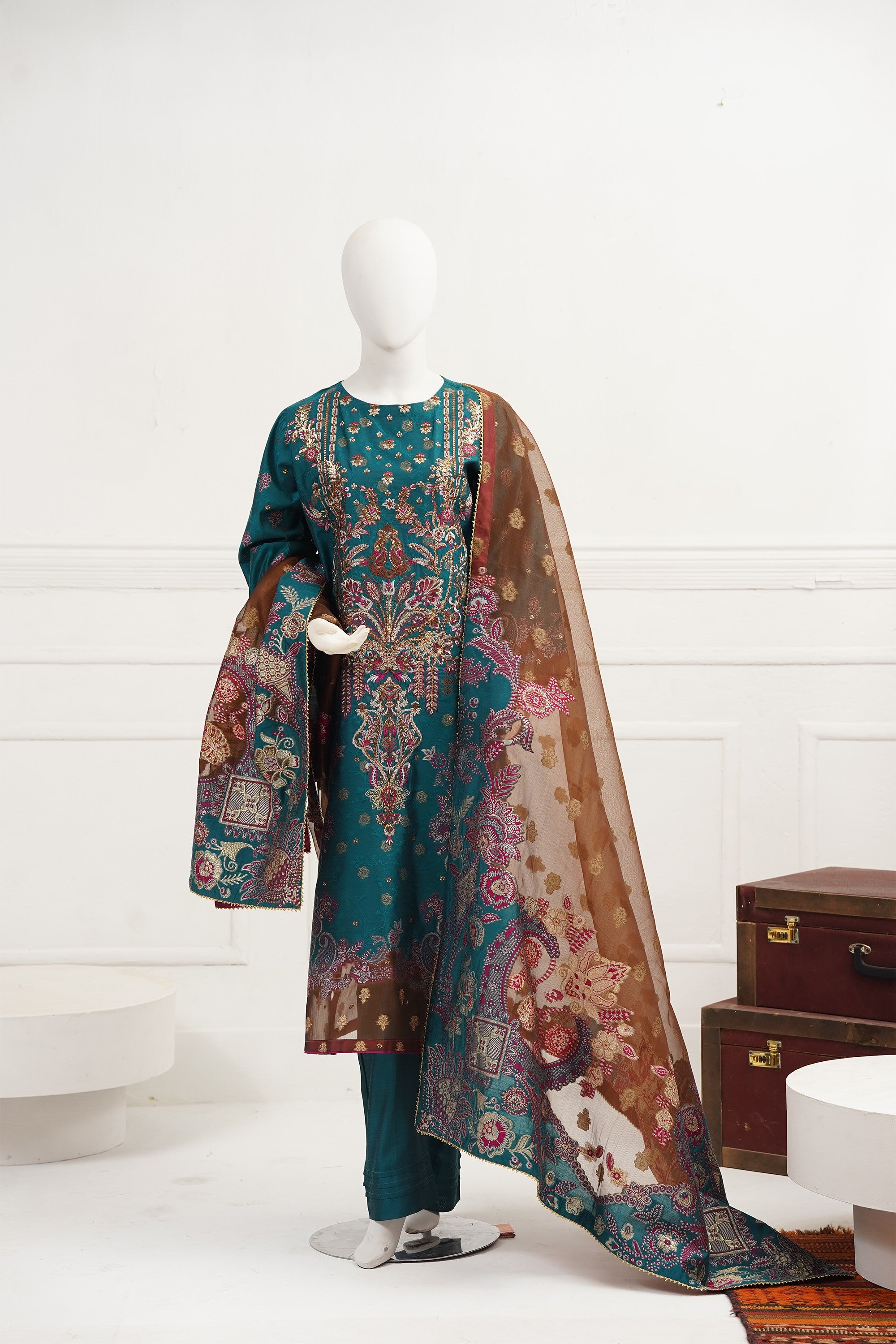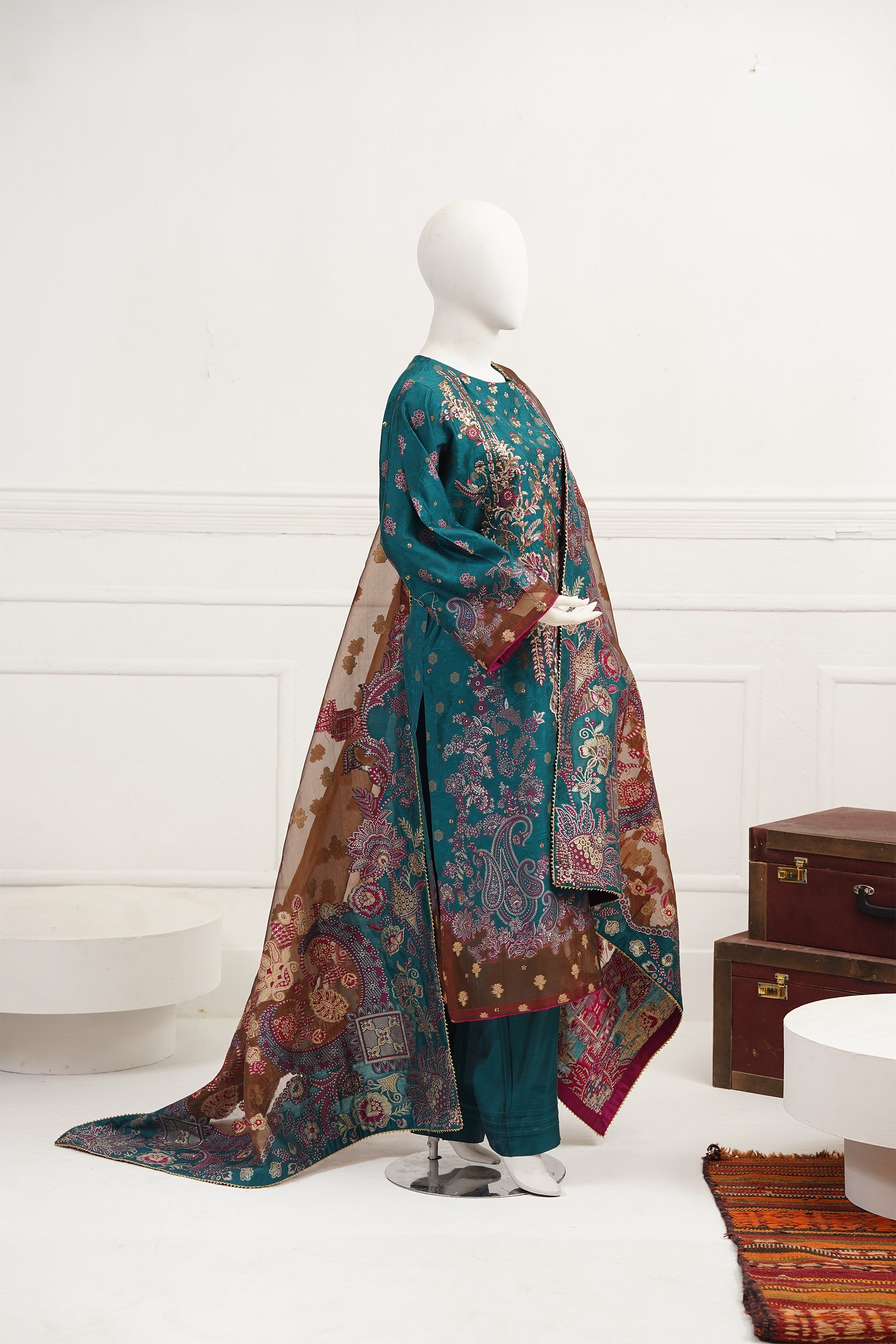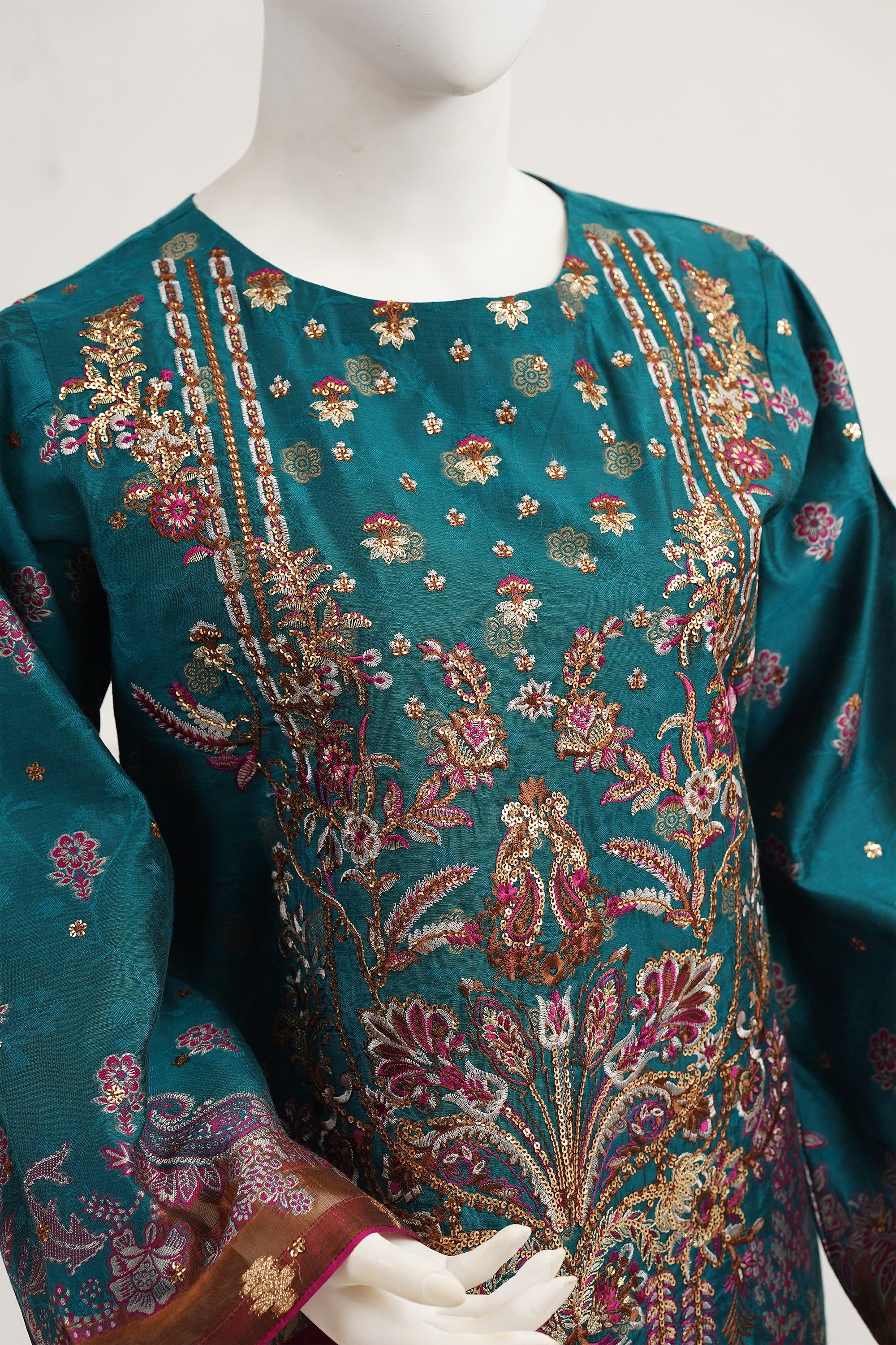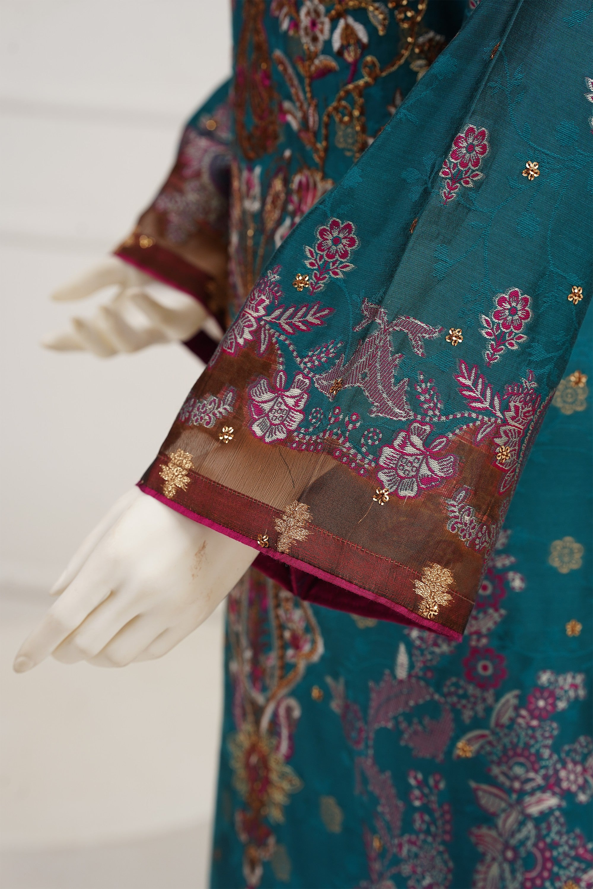 Featuring an opulently embroidered front crafted from self–viscose silk, this shirt is beautifully accented with organza jacquard detailing on the daman and sleeves. It comes paired with sleek trousers designed with subtle stitched hem finishes. The ensemble is elevated with a luxurious organza silk jacquard dupatta, creating a standout look ideal for festive occasions and special celebrations.