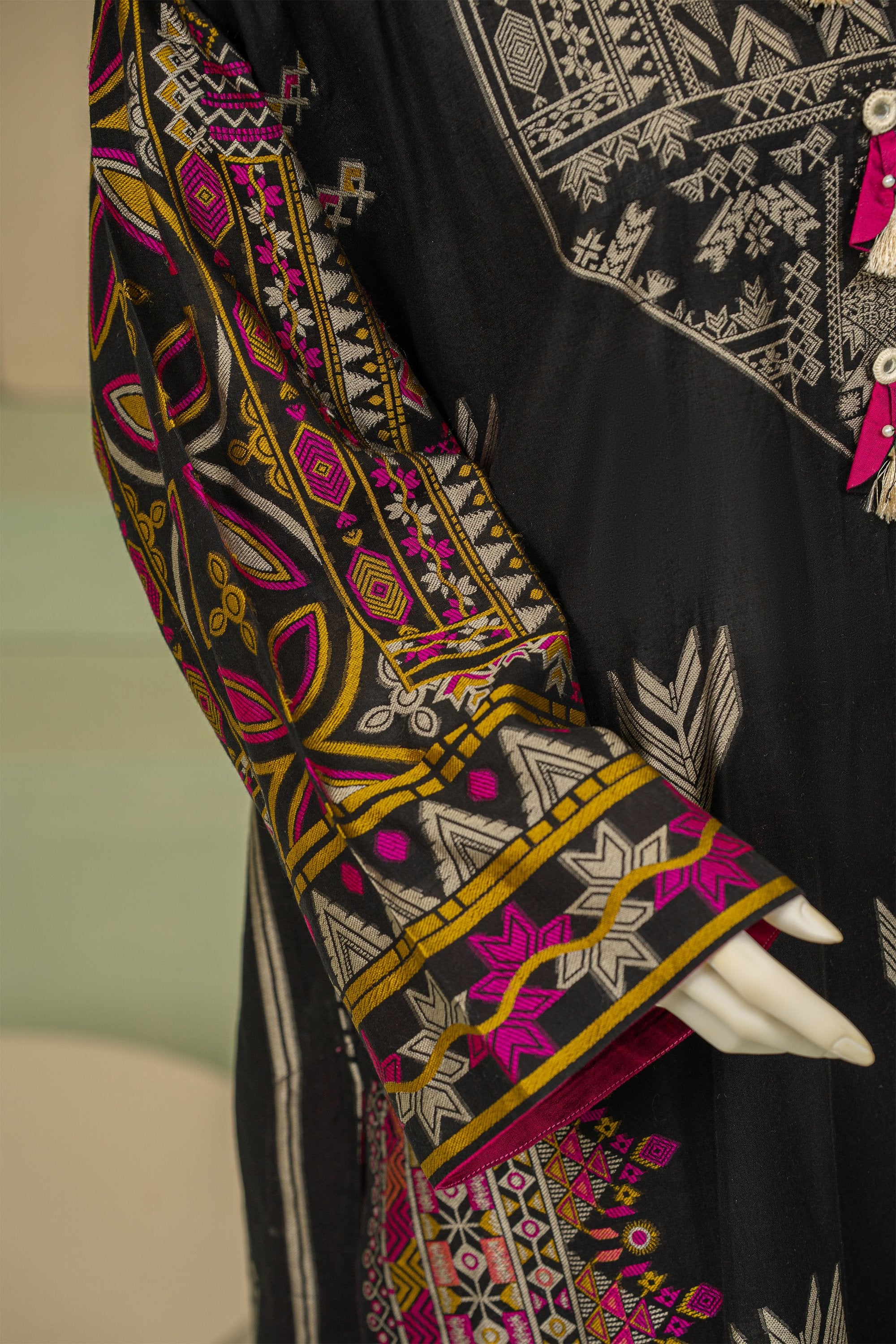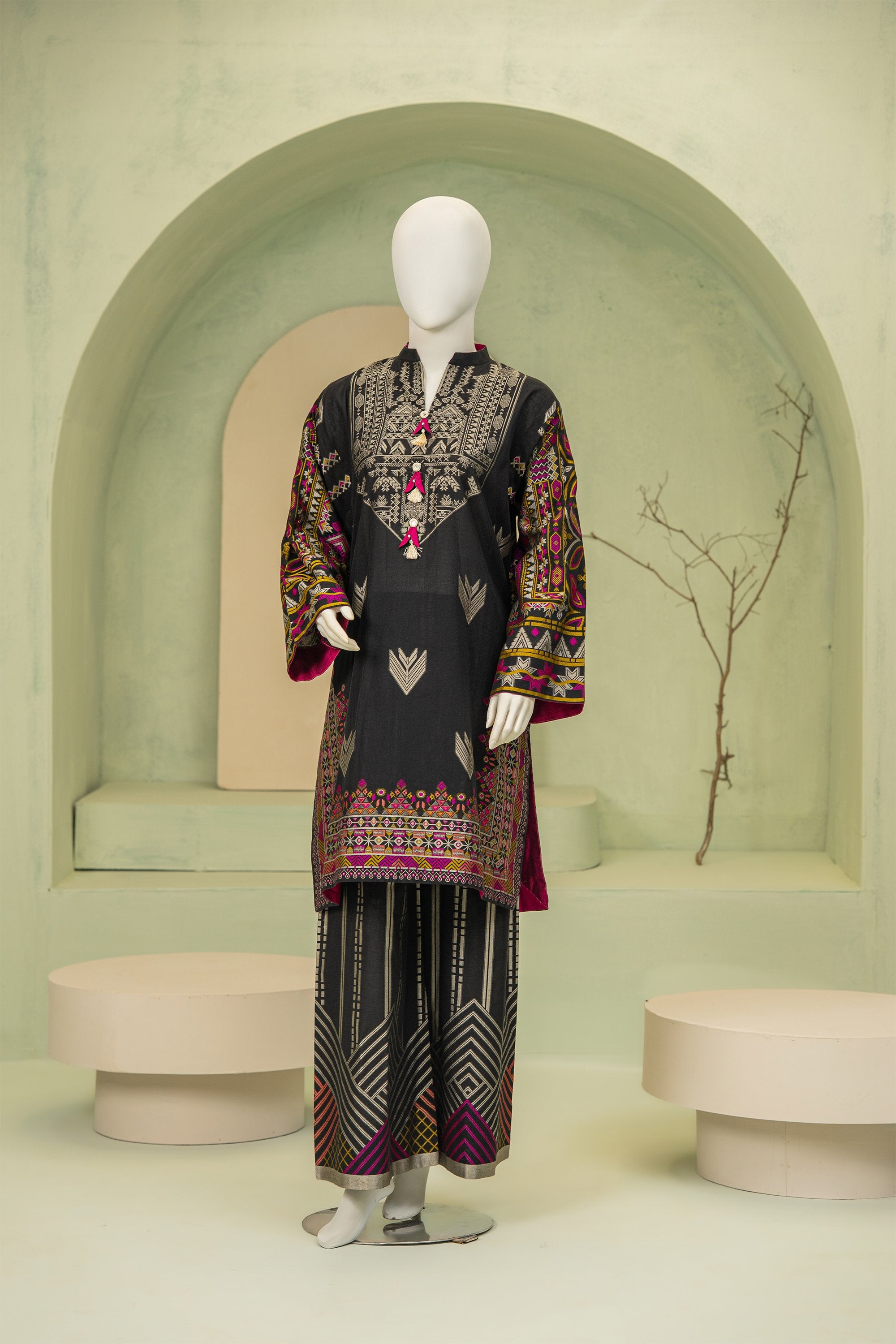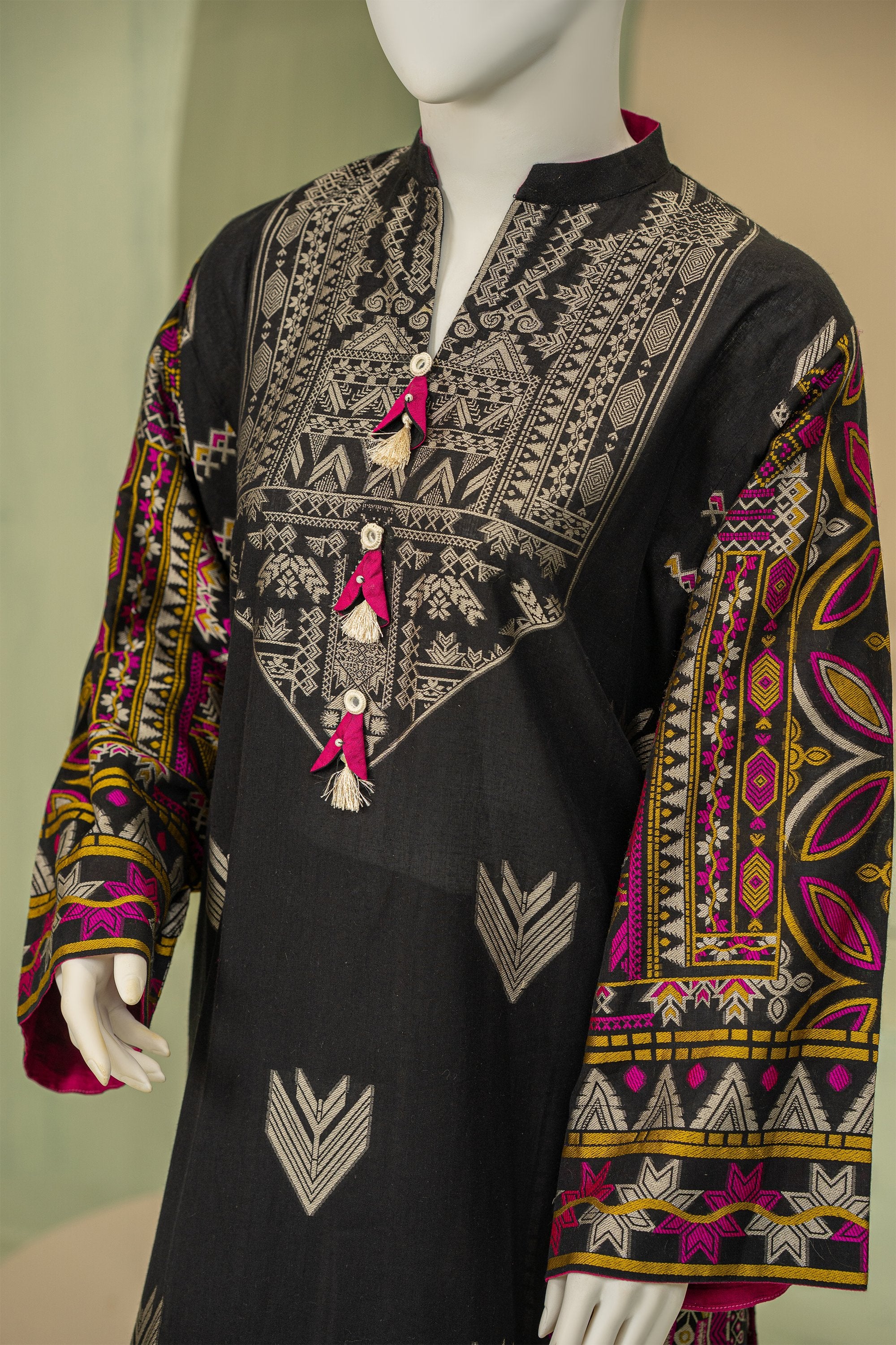 A striking ensemble showcasing bold jacquard motifs on a statement long kurta, paired with matching jacquard loose trousers for a cohesive and elegant appeal. The neckline is beautifully enhanced with intricate fabric manipulation, adding a touch of artistry and sophistication to the overall look.
