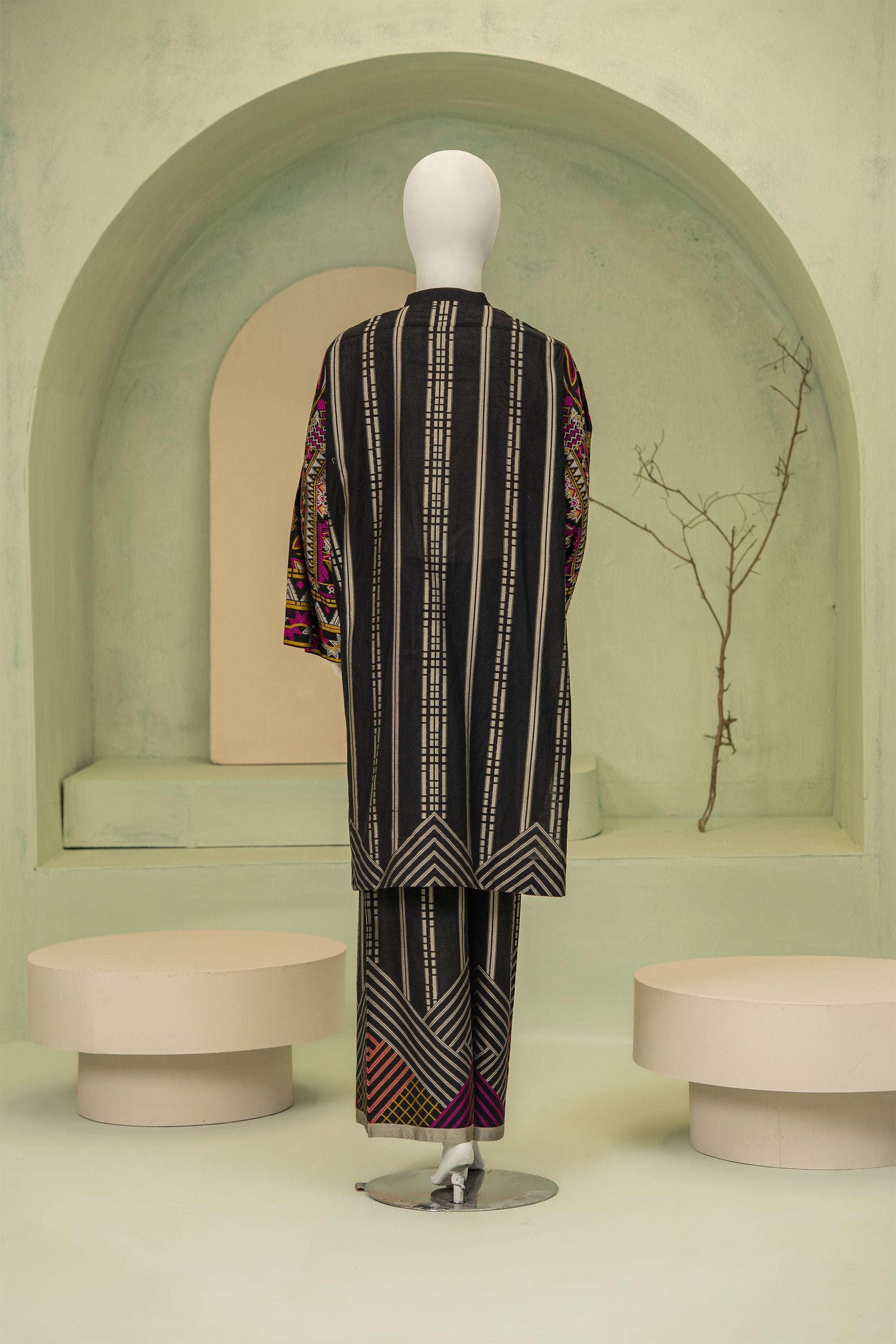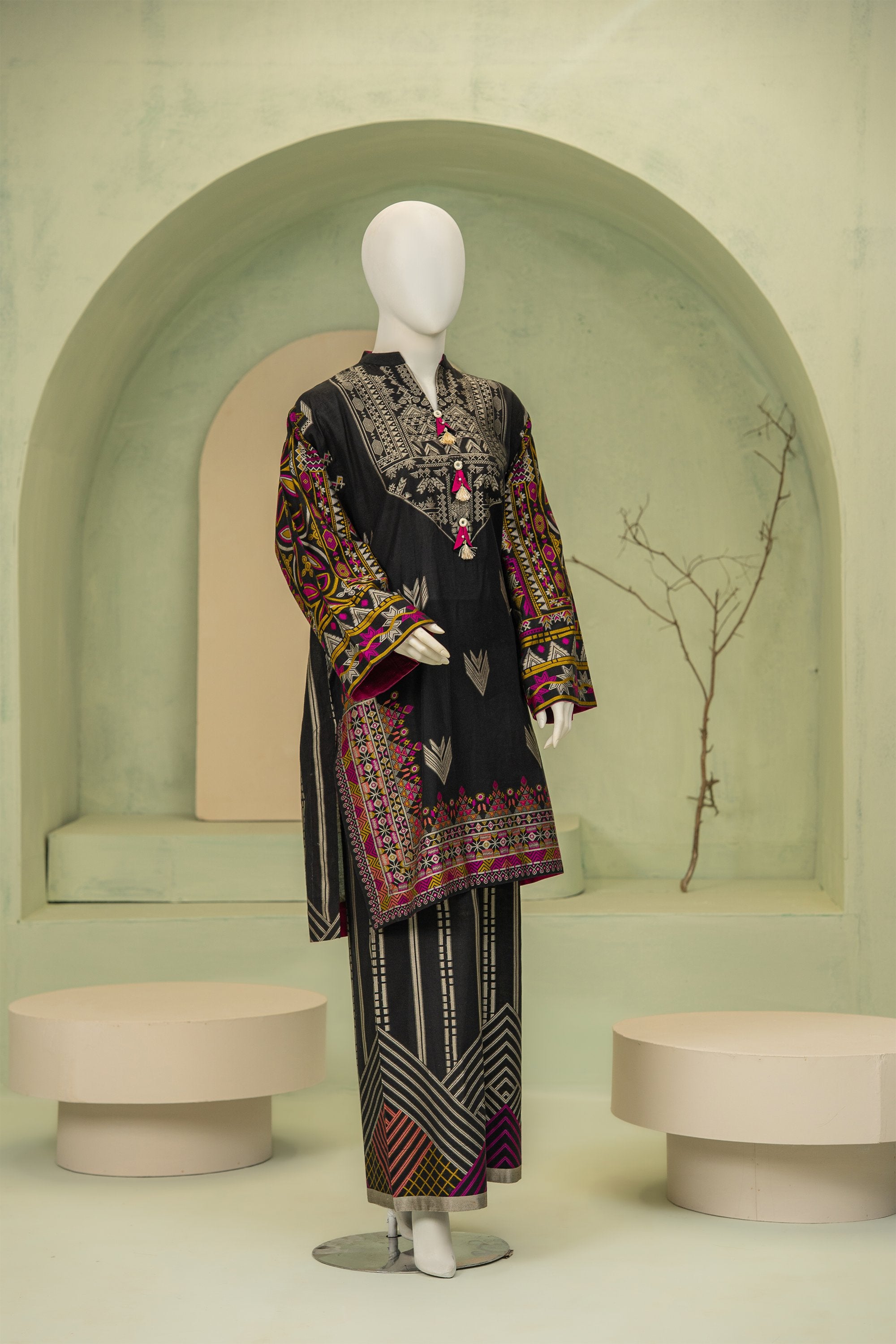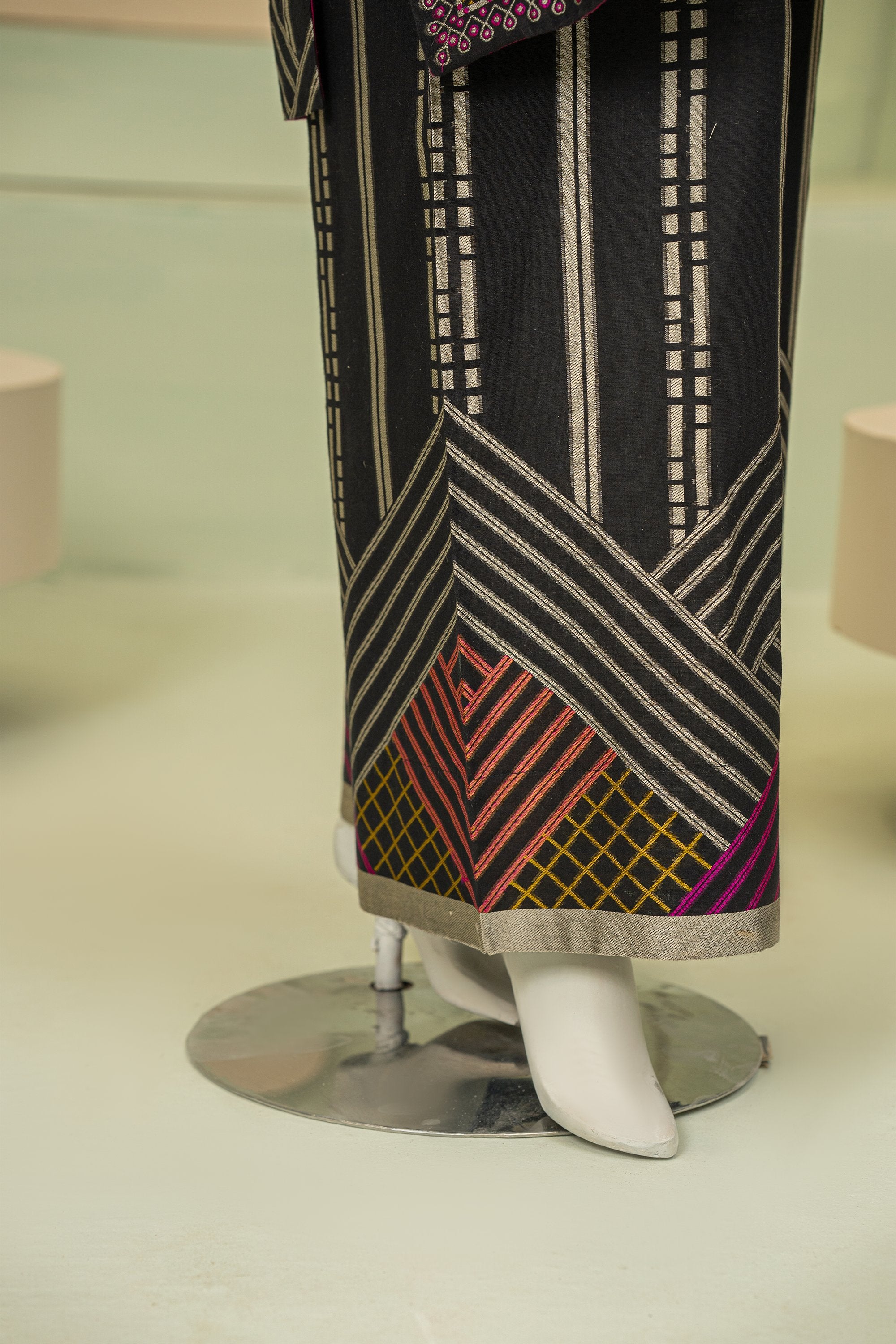 A striking ensemble showcasing bold jacquard motifs on a statement long kurta, paired with matching jacquard loose trousers for a cohesive and elegant appeal. The neckline is beautifully enhanced with intricate fabric manipulation, adding a touch of artistry and sophistication to the overall look.