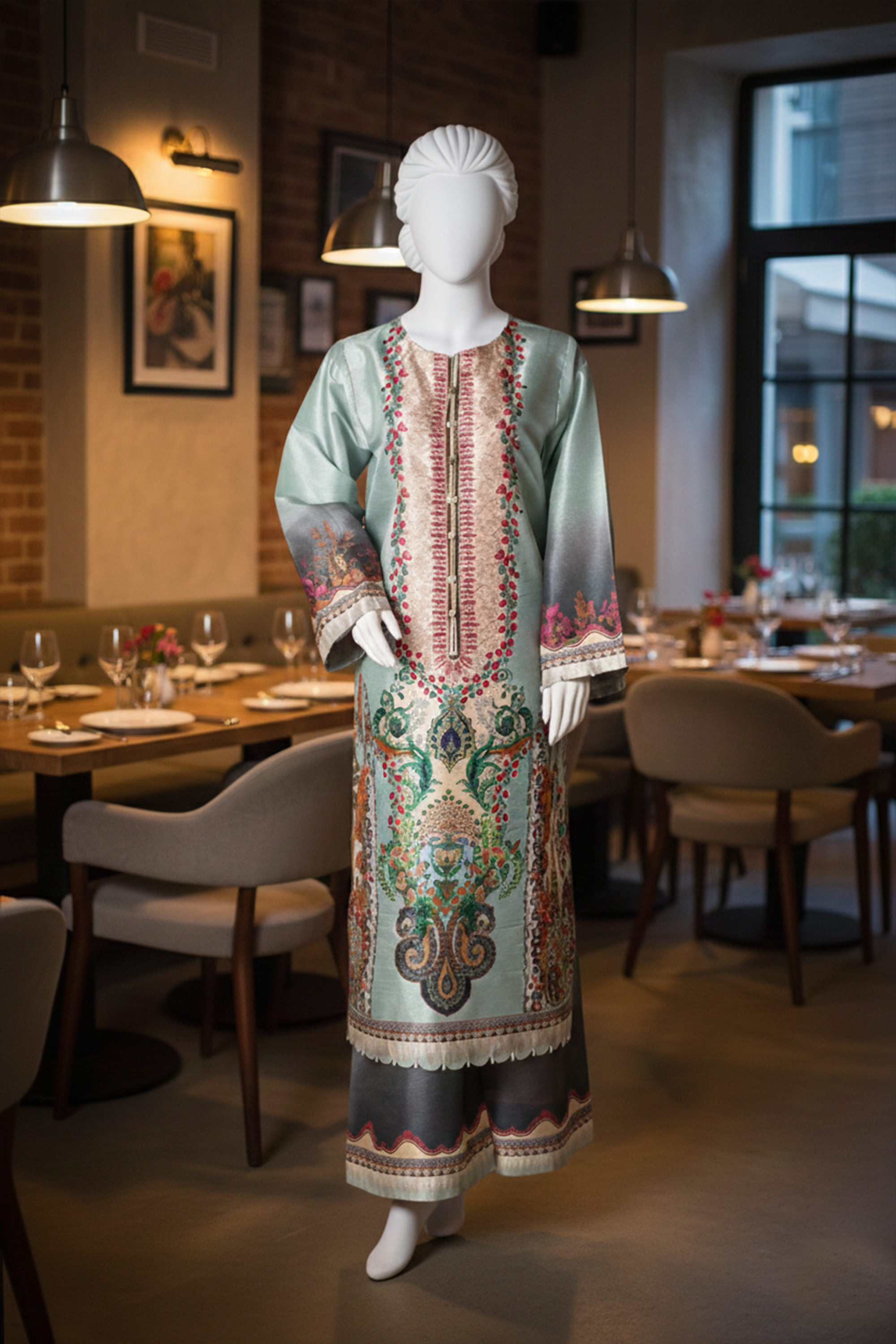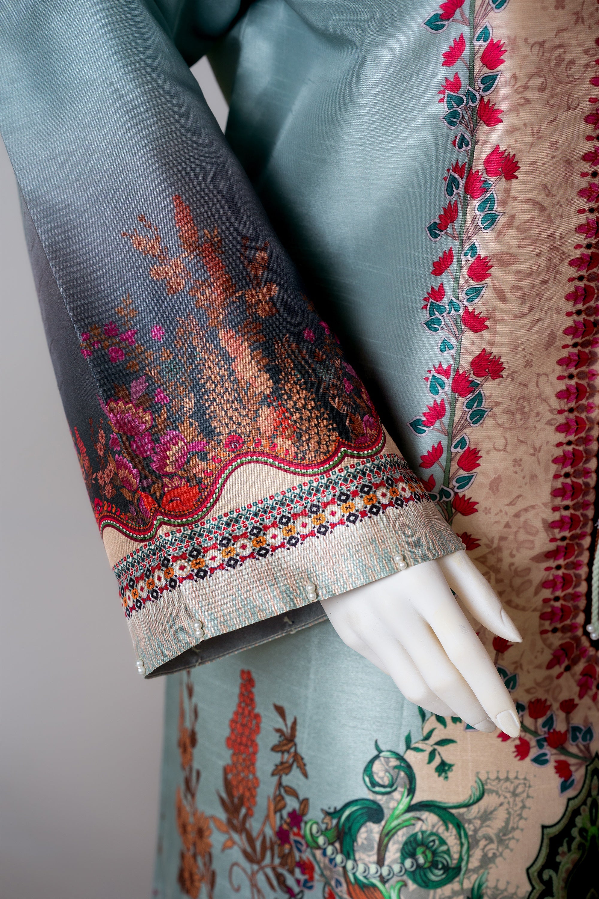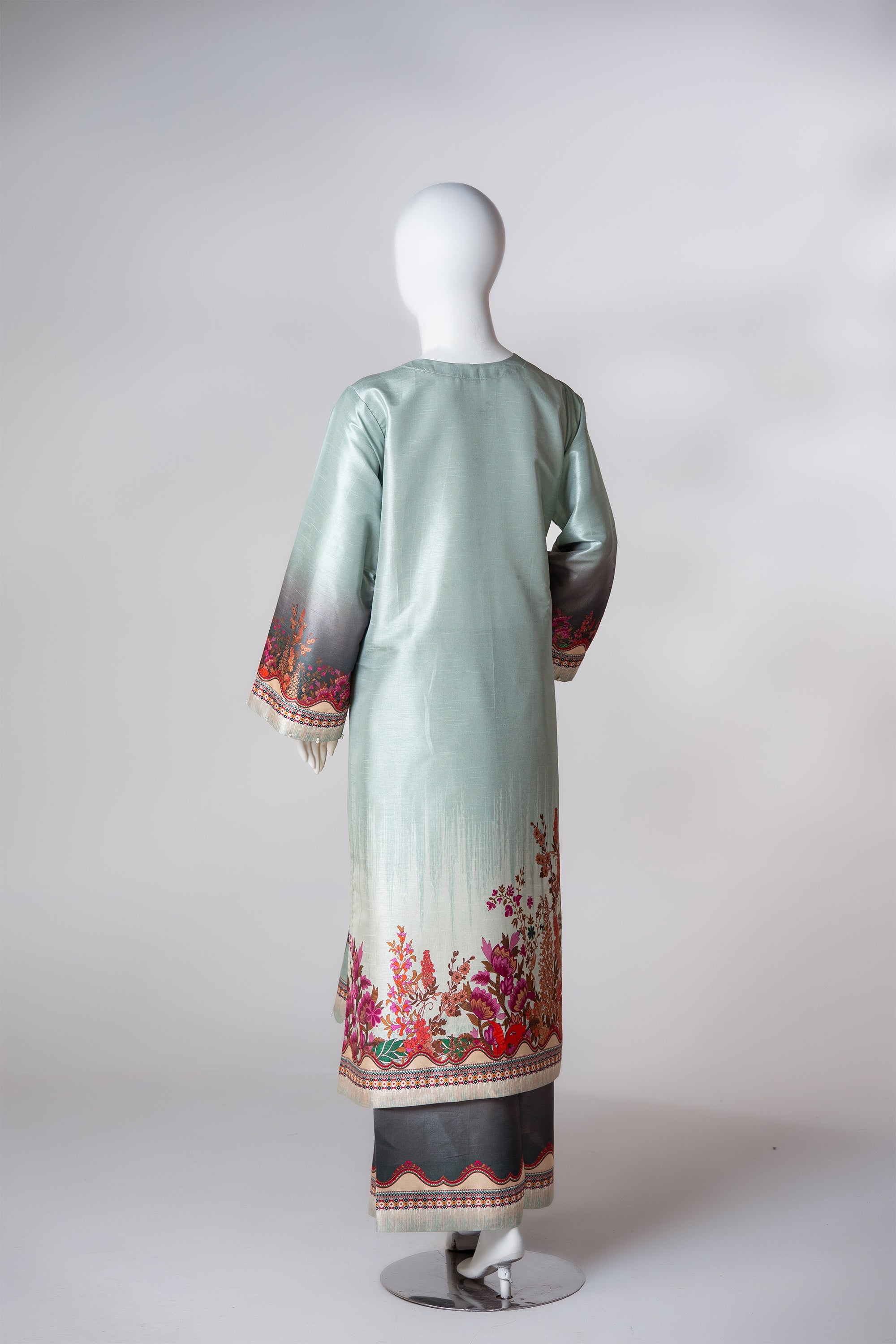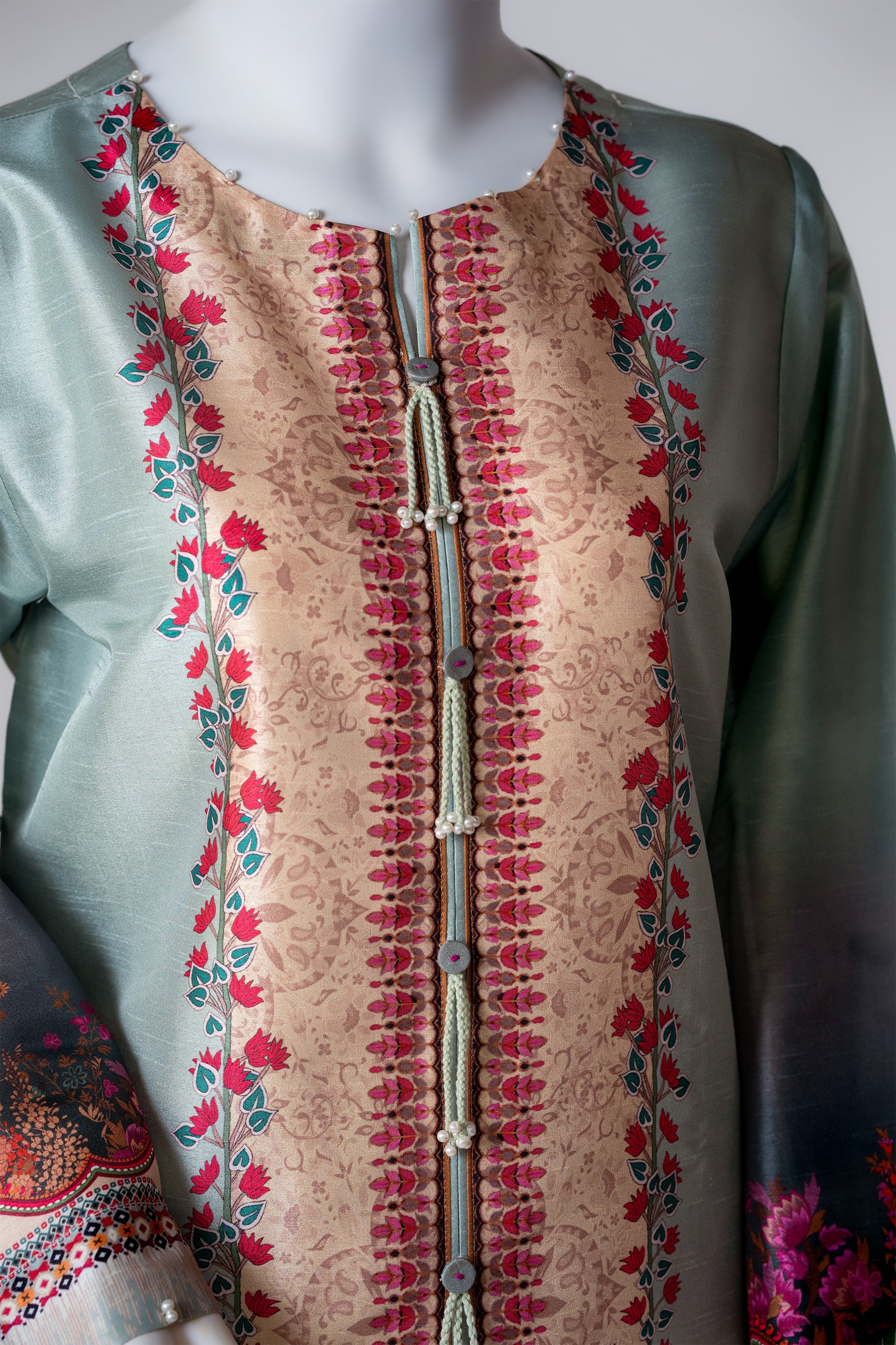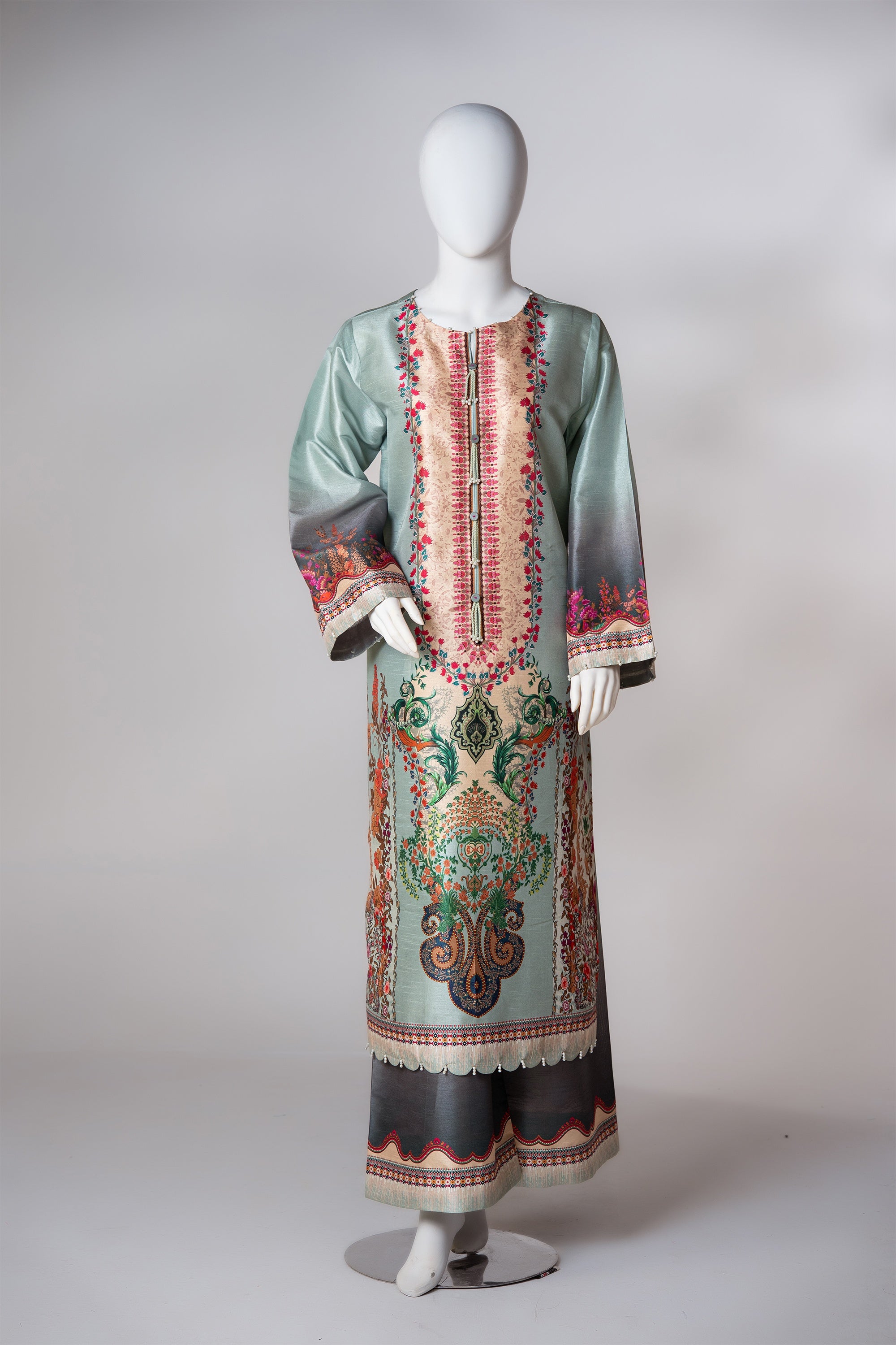 A refreshing mint-toned two-piece set adorned with delicate modern prints. The neckline is artfully finished with knot accents handcrafted tassels, while scalloped daman cutwork and straight sleeves detailed with pearls offer an elegant, airy charm. Completed with matching printed trousers for a refined silhouette.