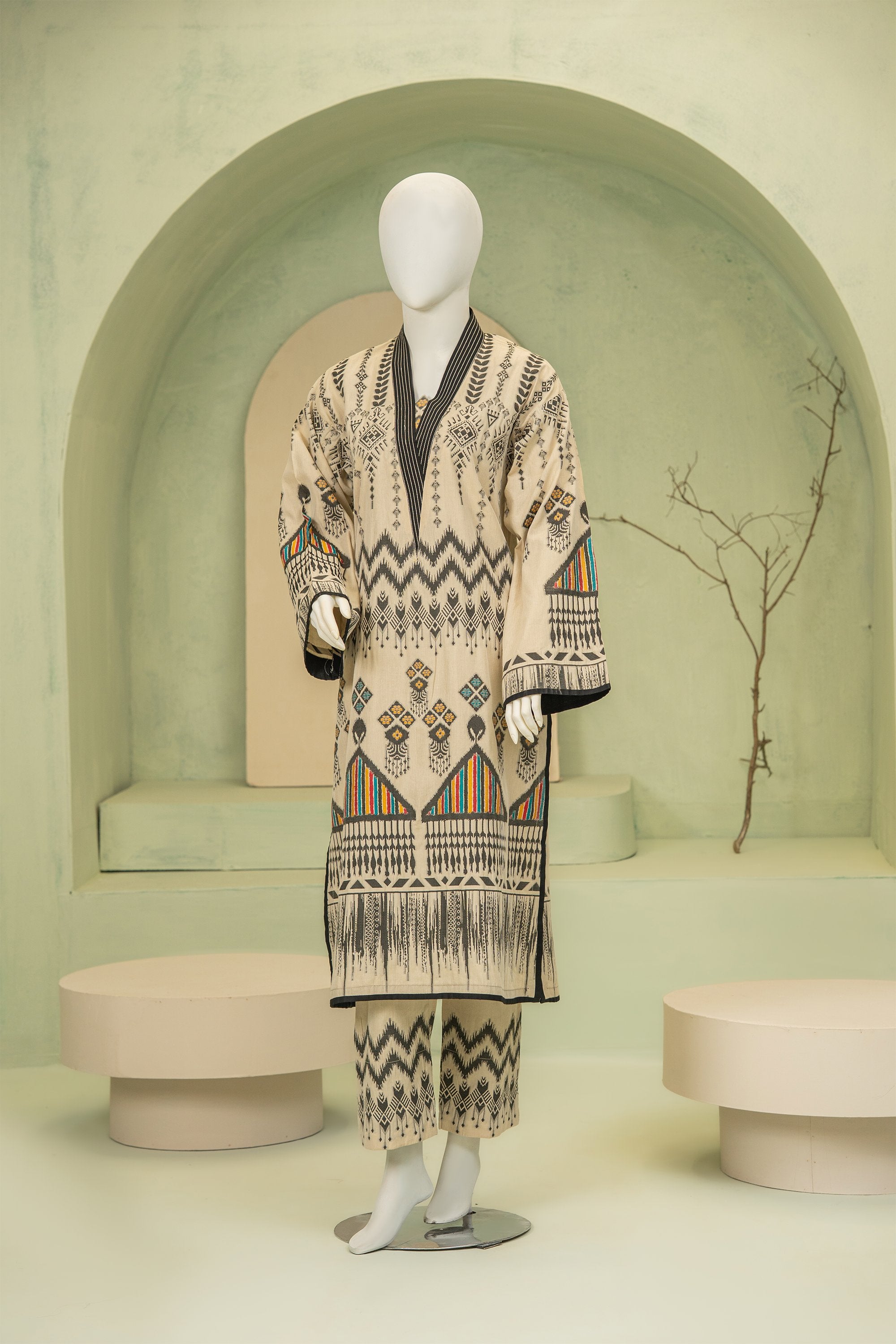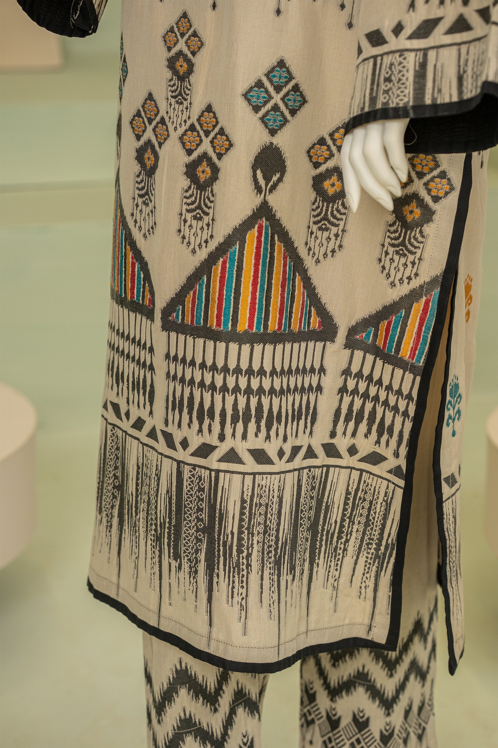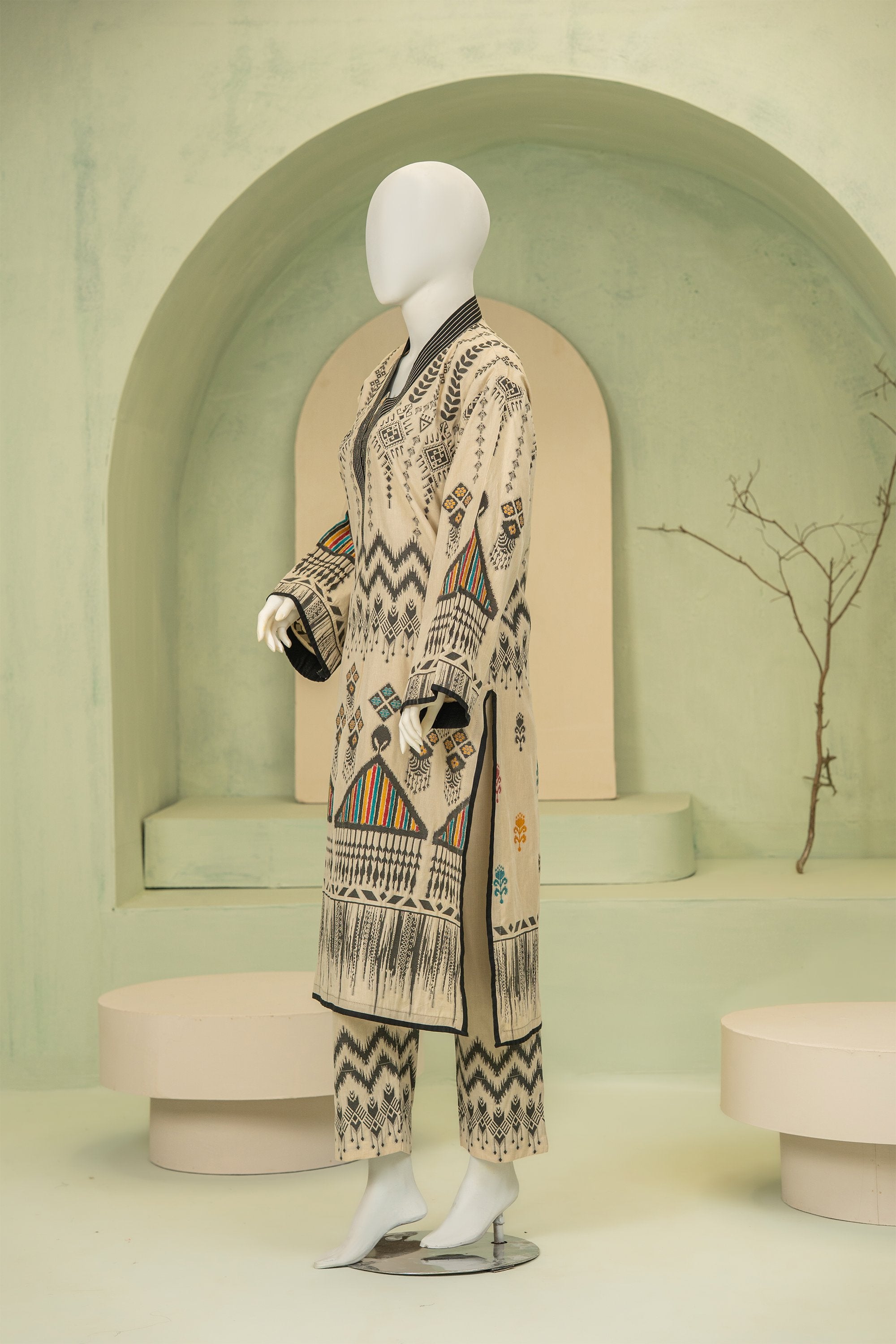 A refined jacquard ensemble featuring a statement long kurta with bold motifs, paired with matching jacquard trousers. The intricately manipulated neckline adds a sophisticated, artistic touch, blending timeless craftsmanship with modern elegance.