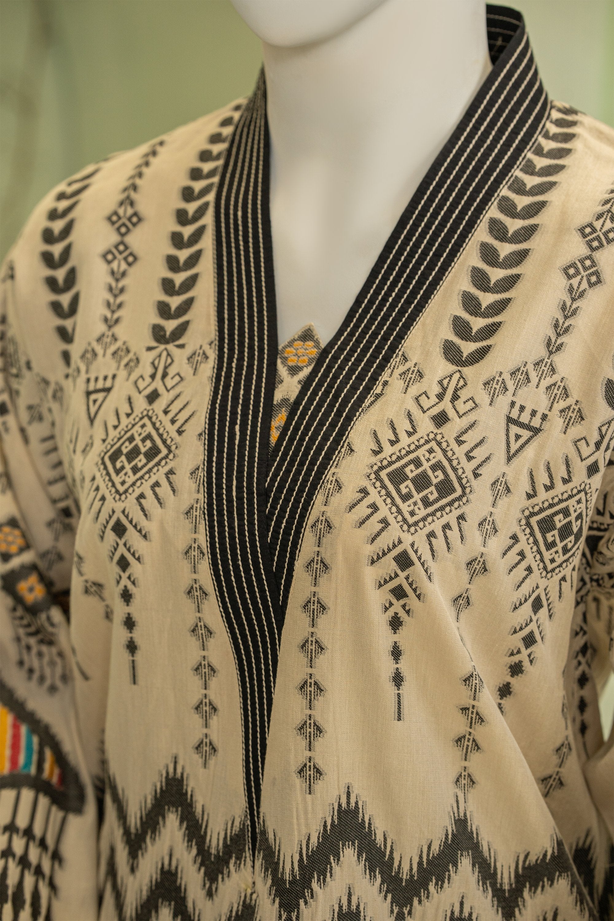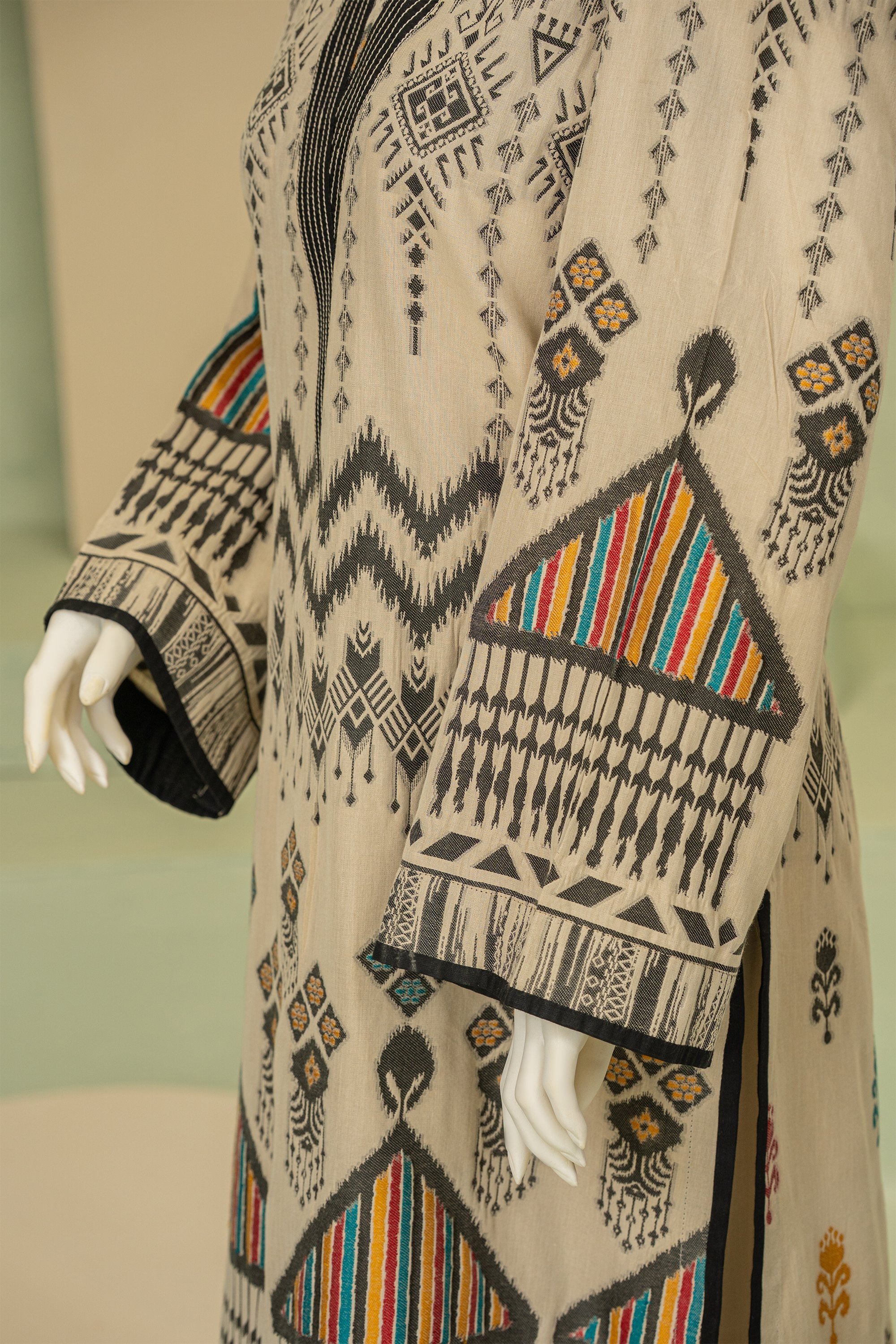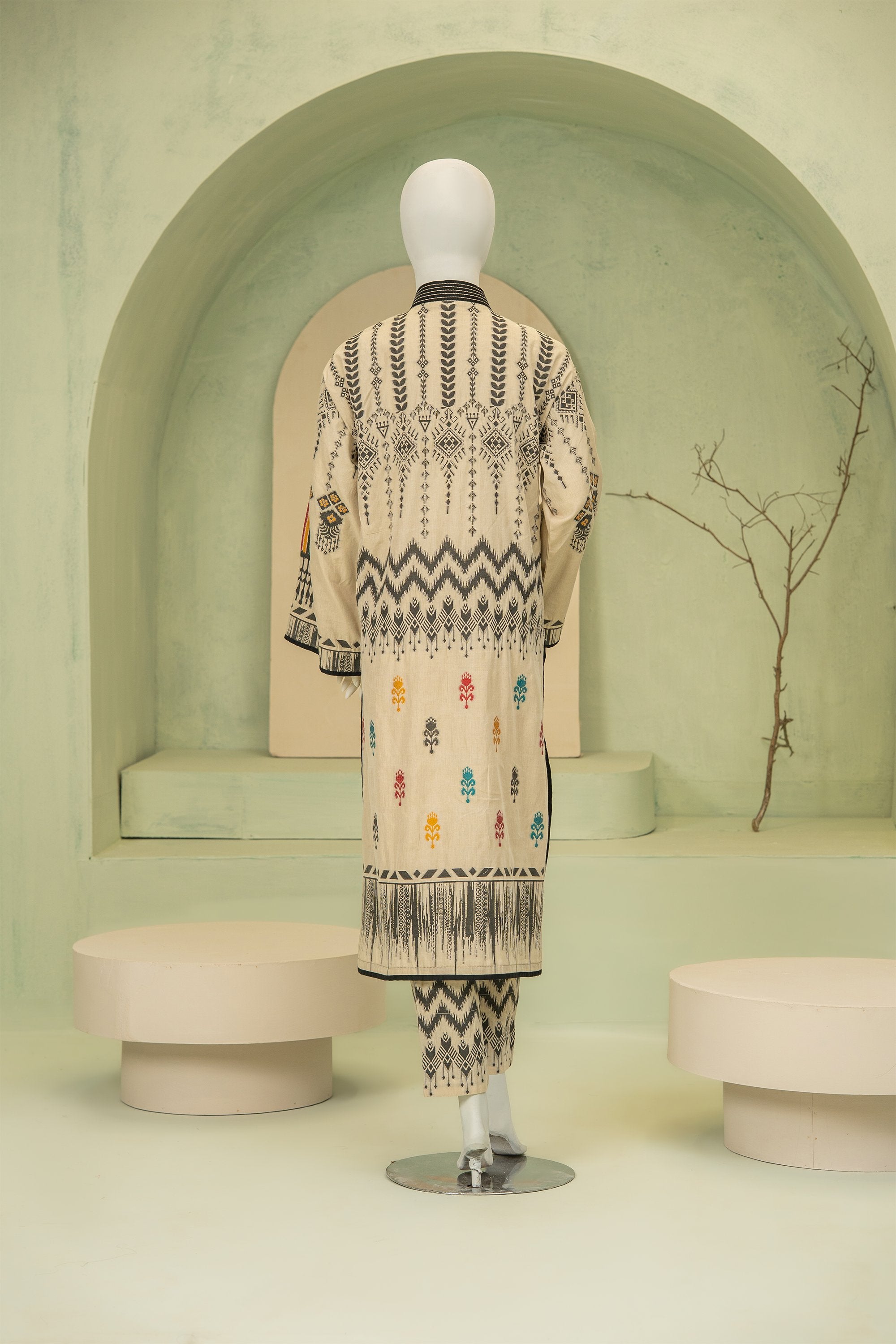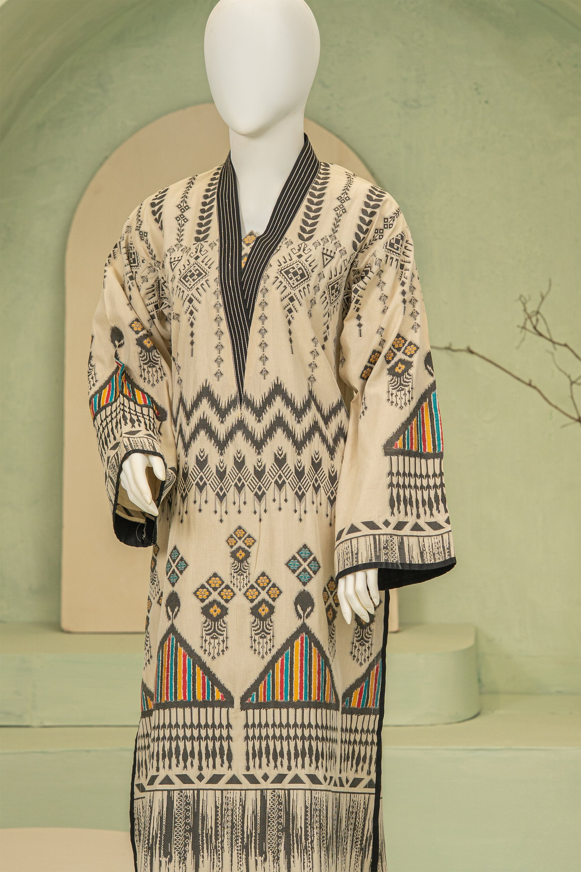 A refined jacquard ensemble featuring a statement long kurta with bold motifs, paired with matching jacquard trousers. The intricately manipulated neckline adds a sophisticated, artistic touch, blending timeless craftsmanship with modern elegance.