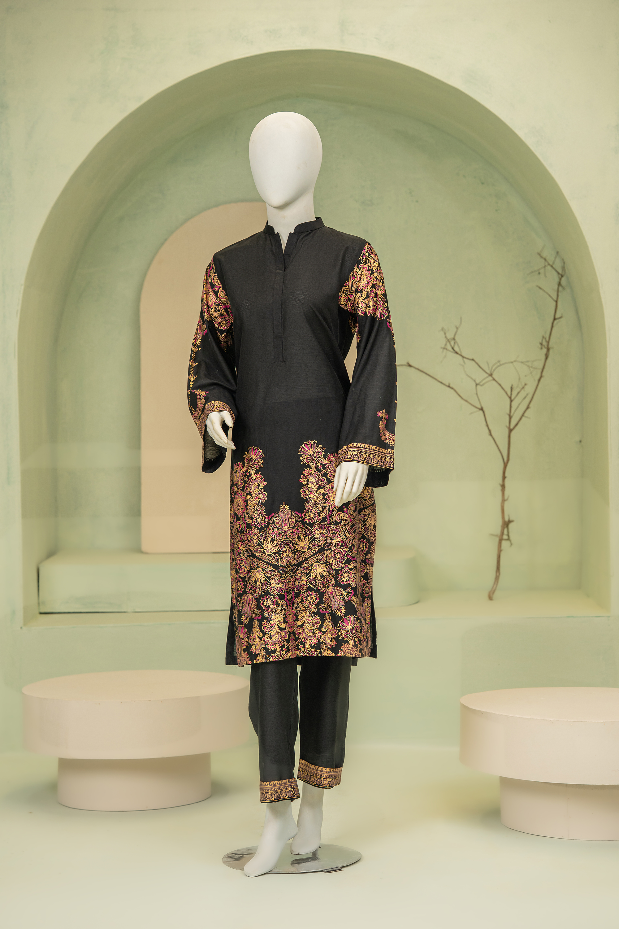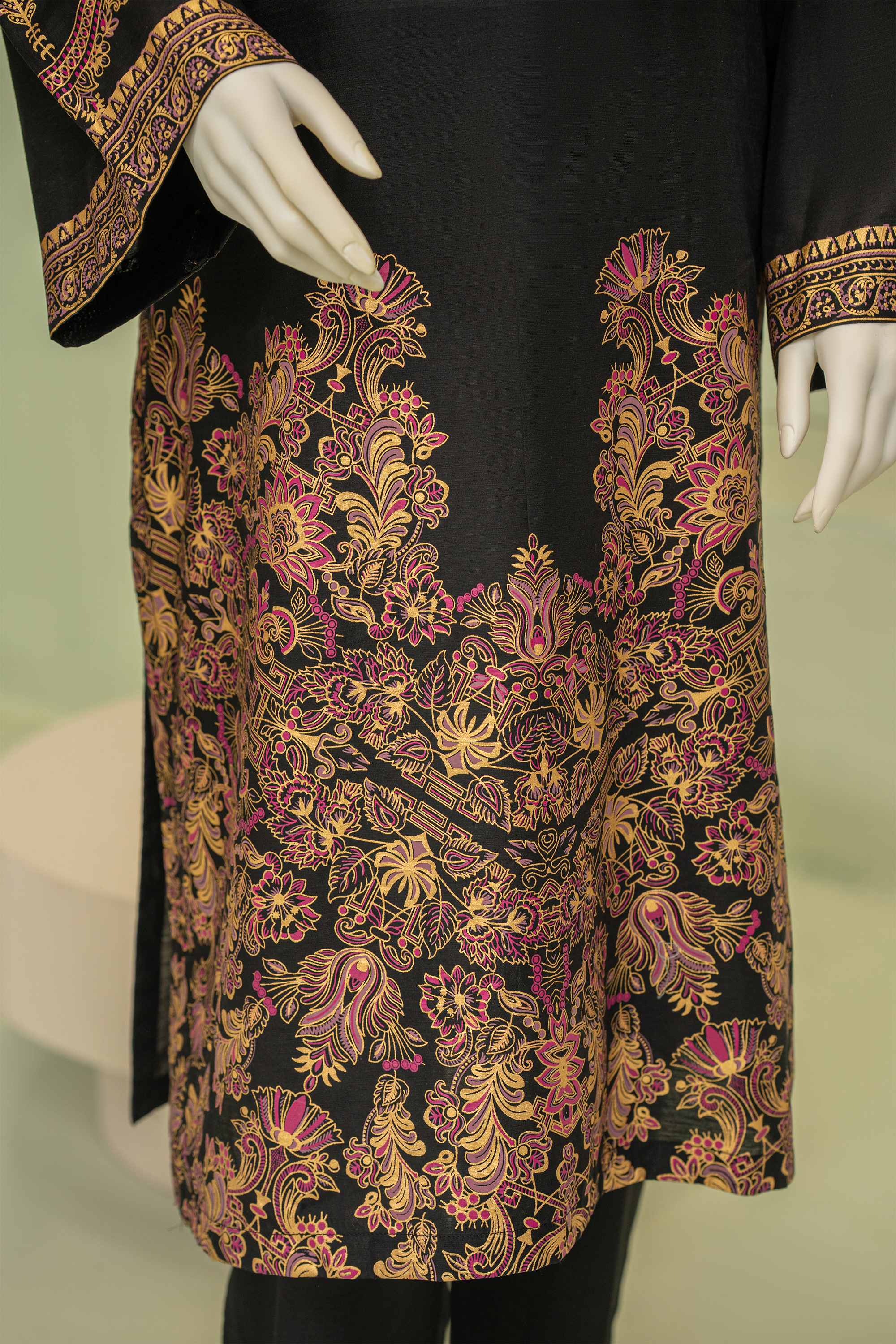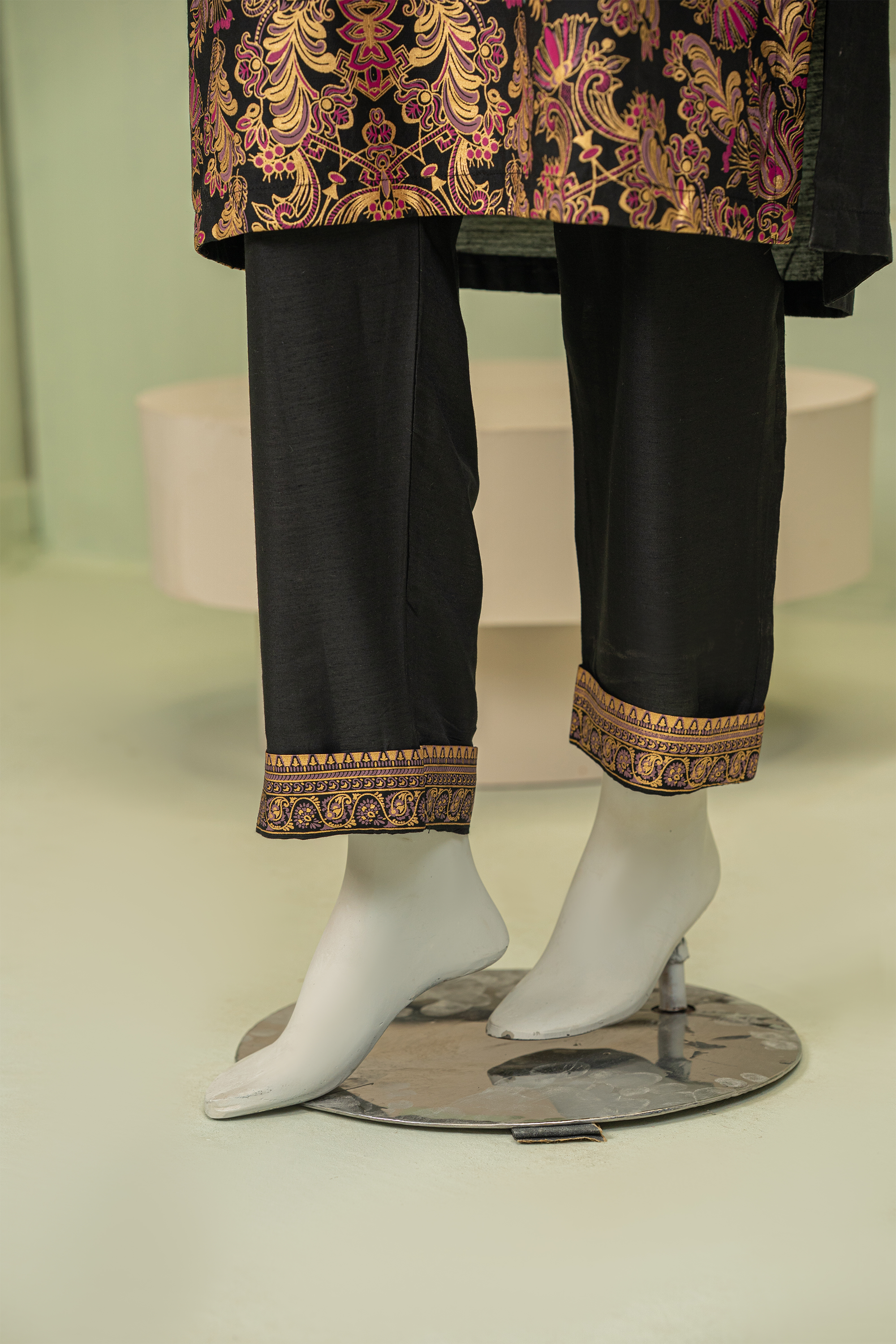 A black co-ord set featuring a straight kurta with intricate gold screen print at daman of shirt. Paired with tailored straight trousers, this look exudes minimal elegance with a touch of artistic detail.