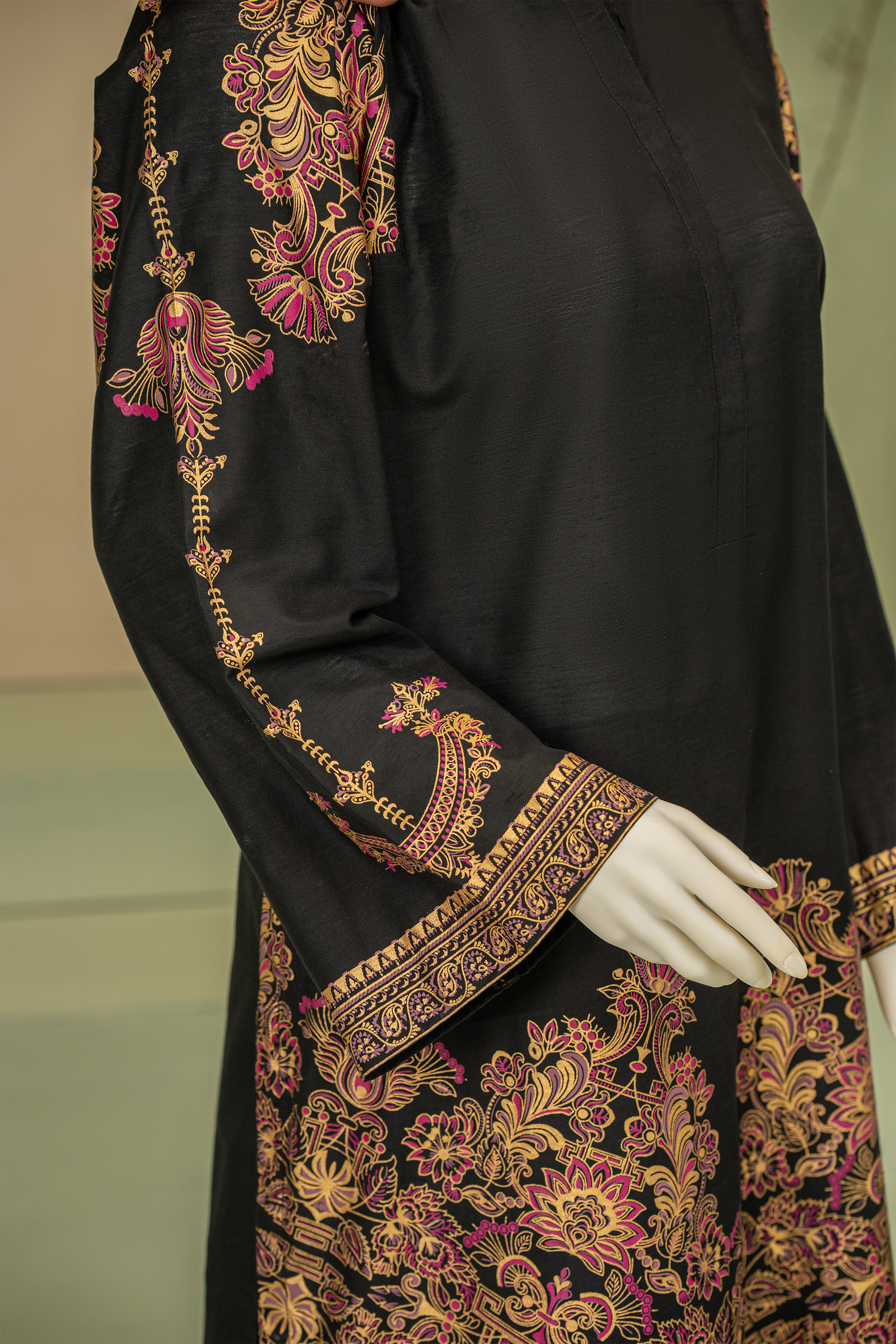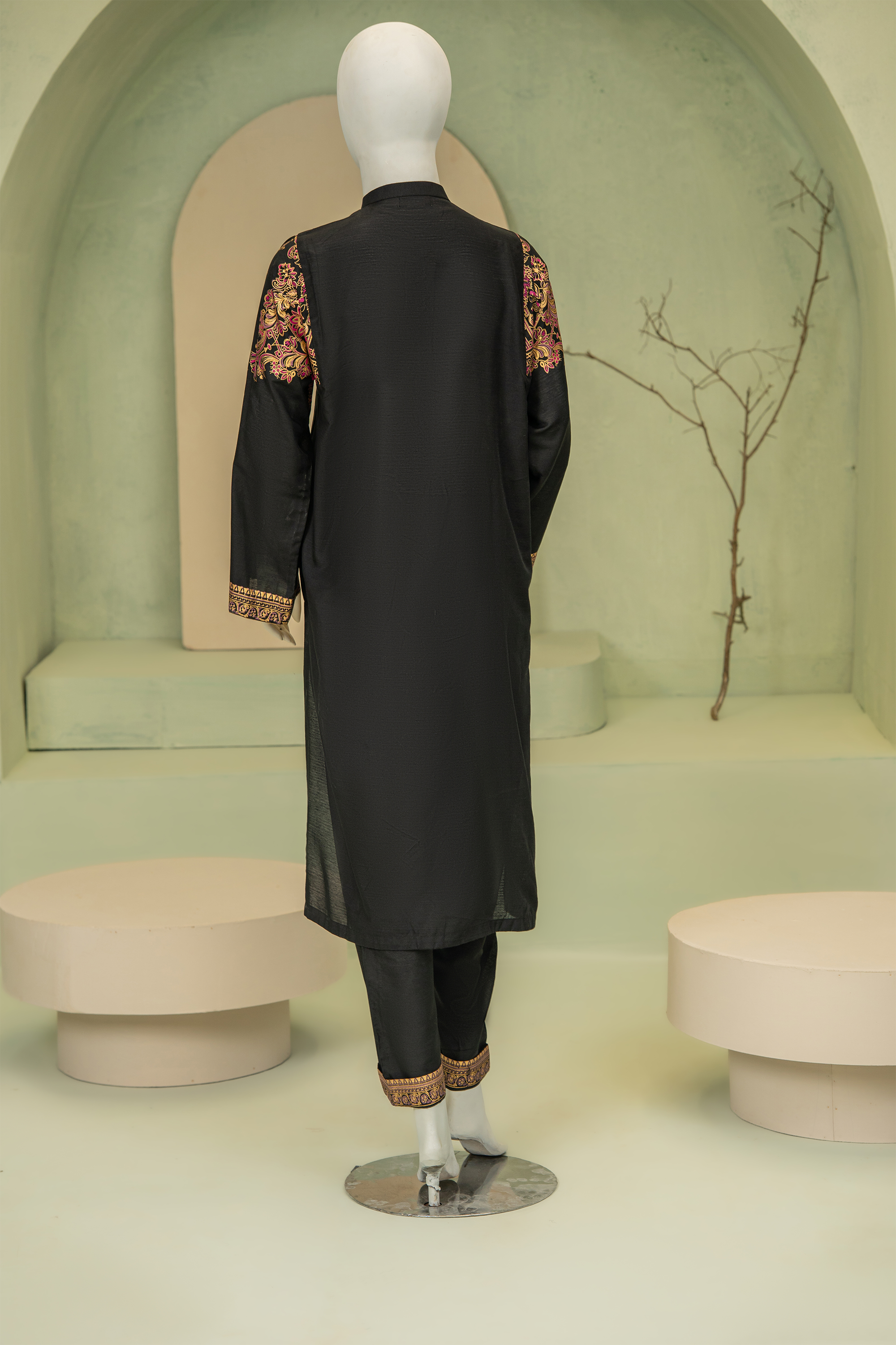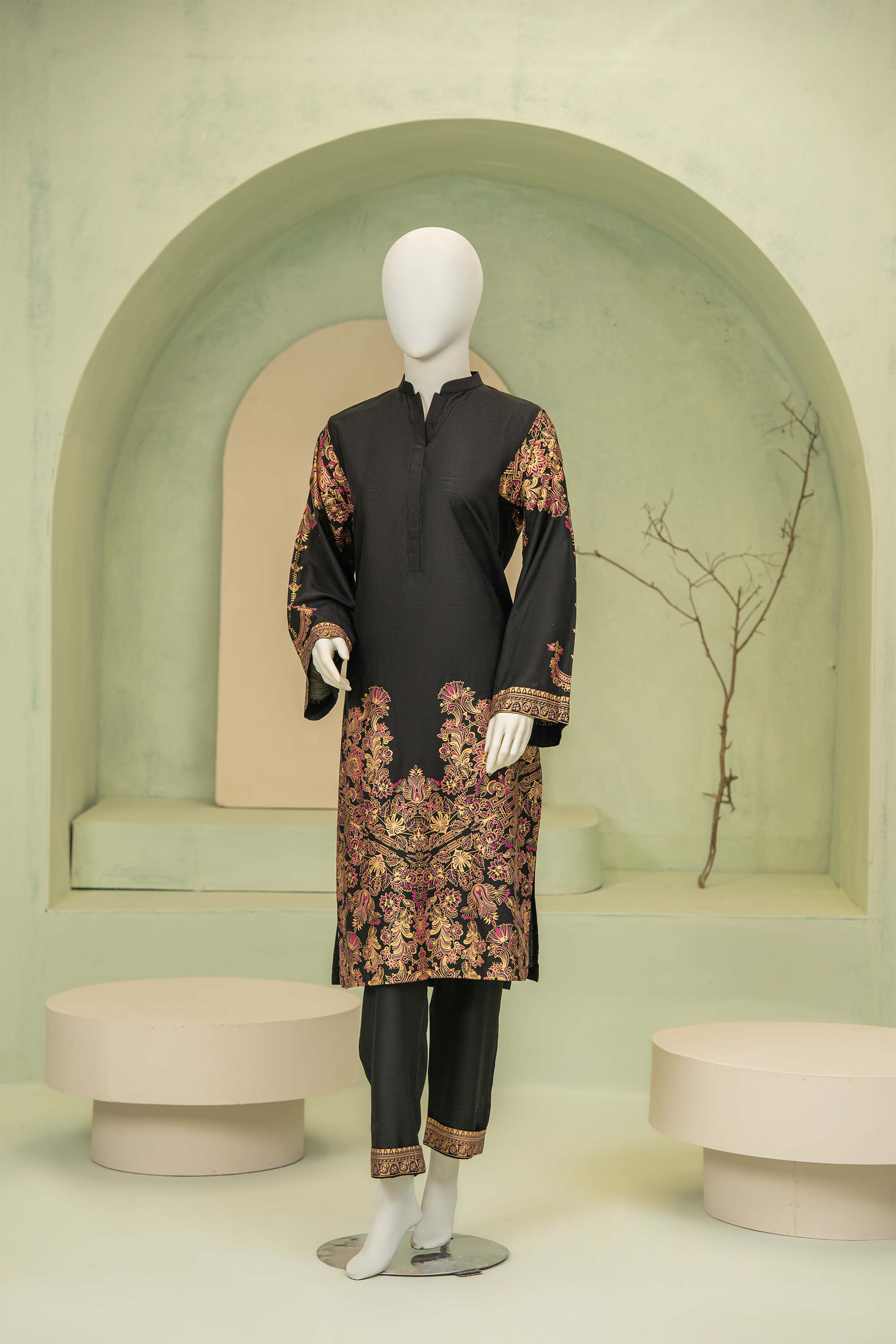 A black co-ord set featuring a straight kurta with intricate gold screen print at daman of shirt. Paired with tailored straight trousers, this look exudes minimal elegance with a touch of artistic detail.